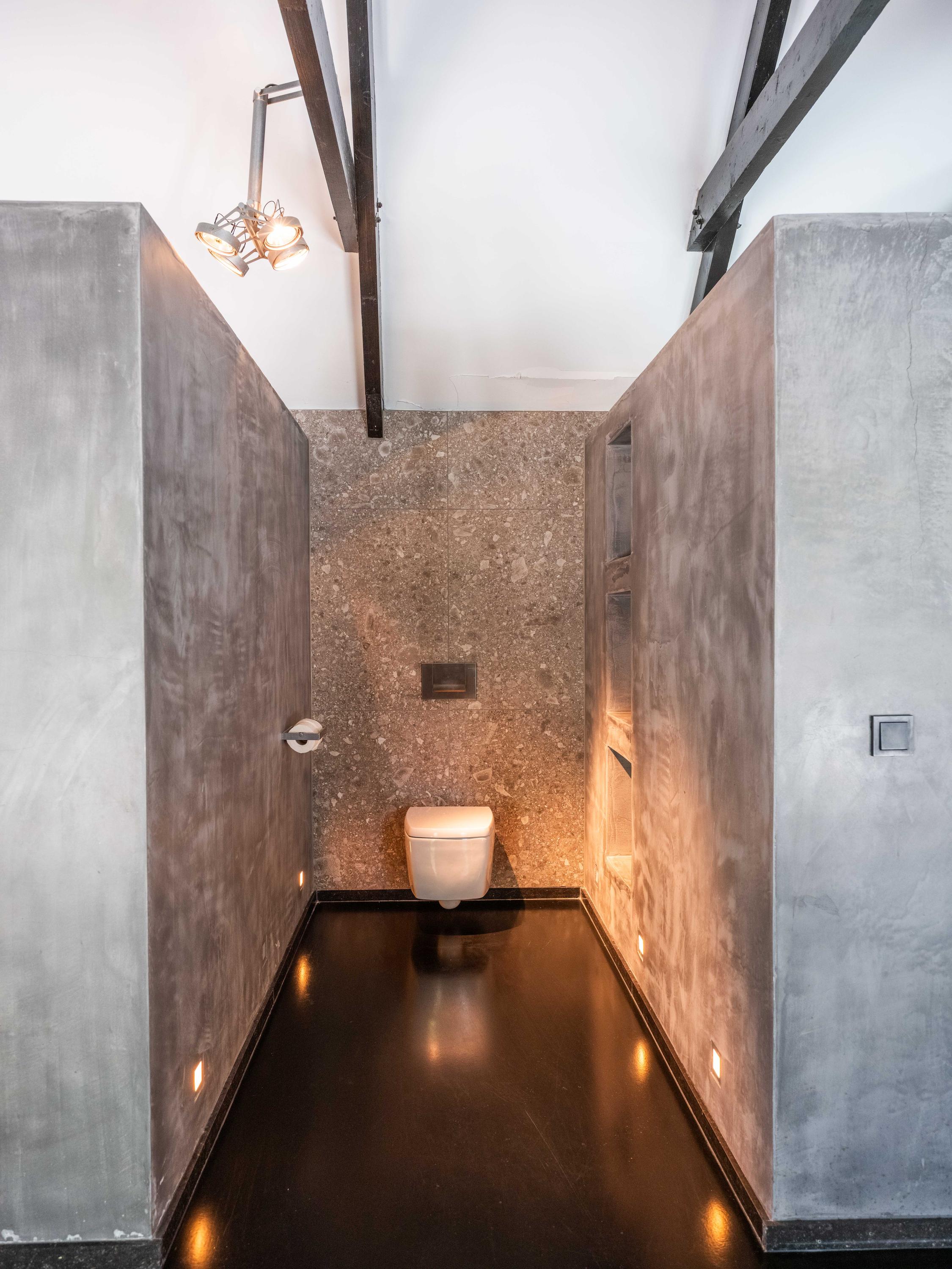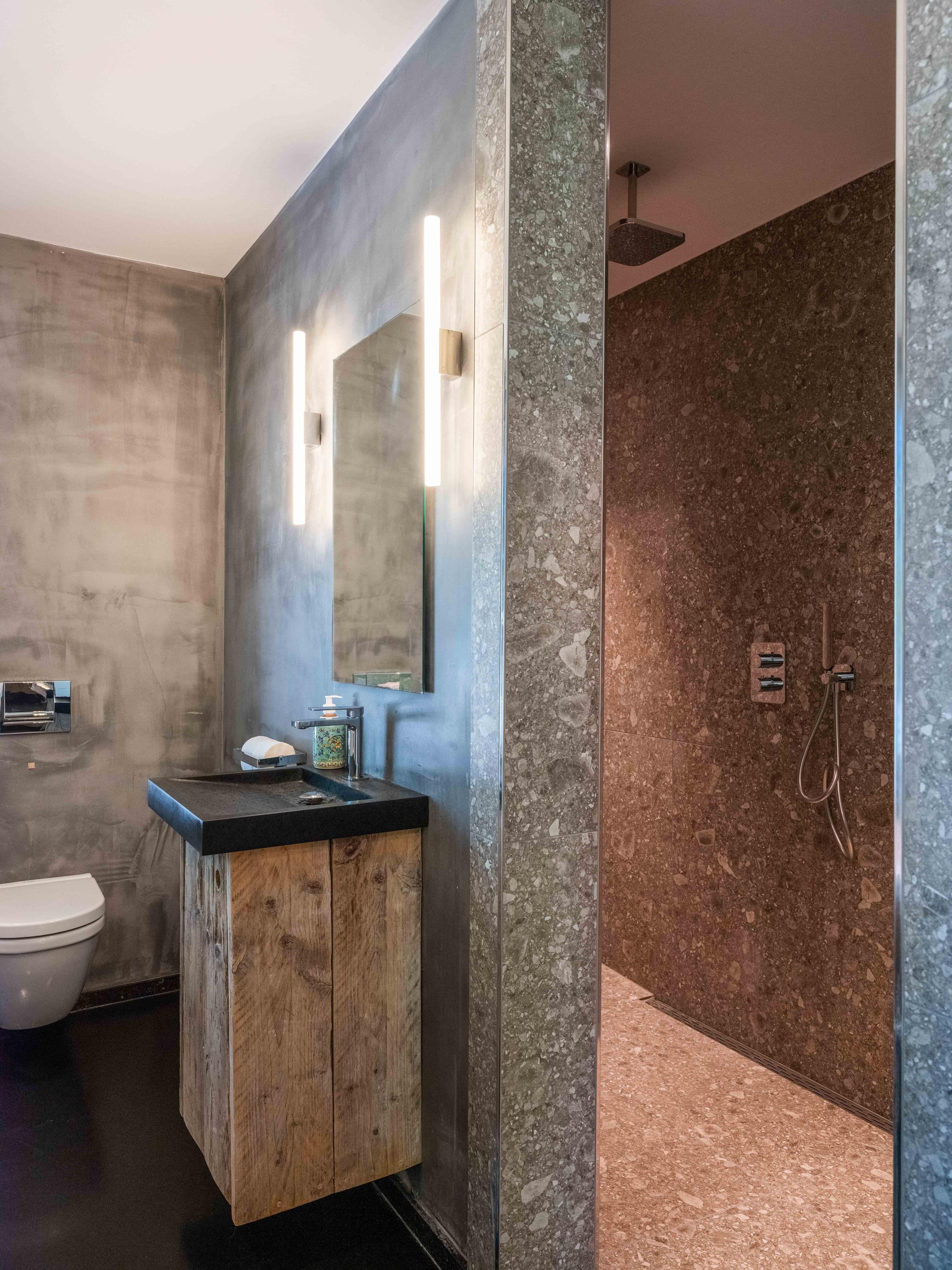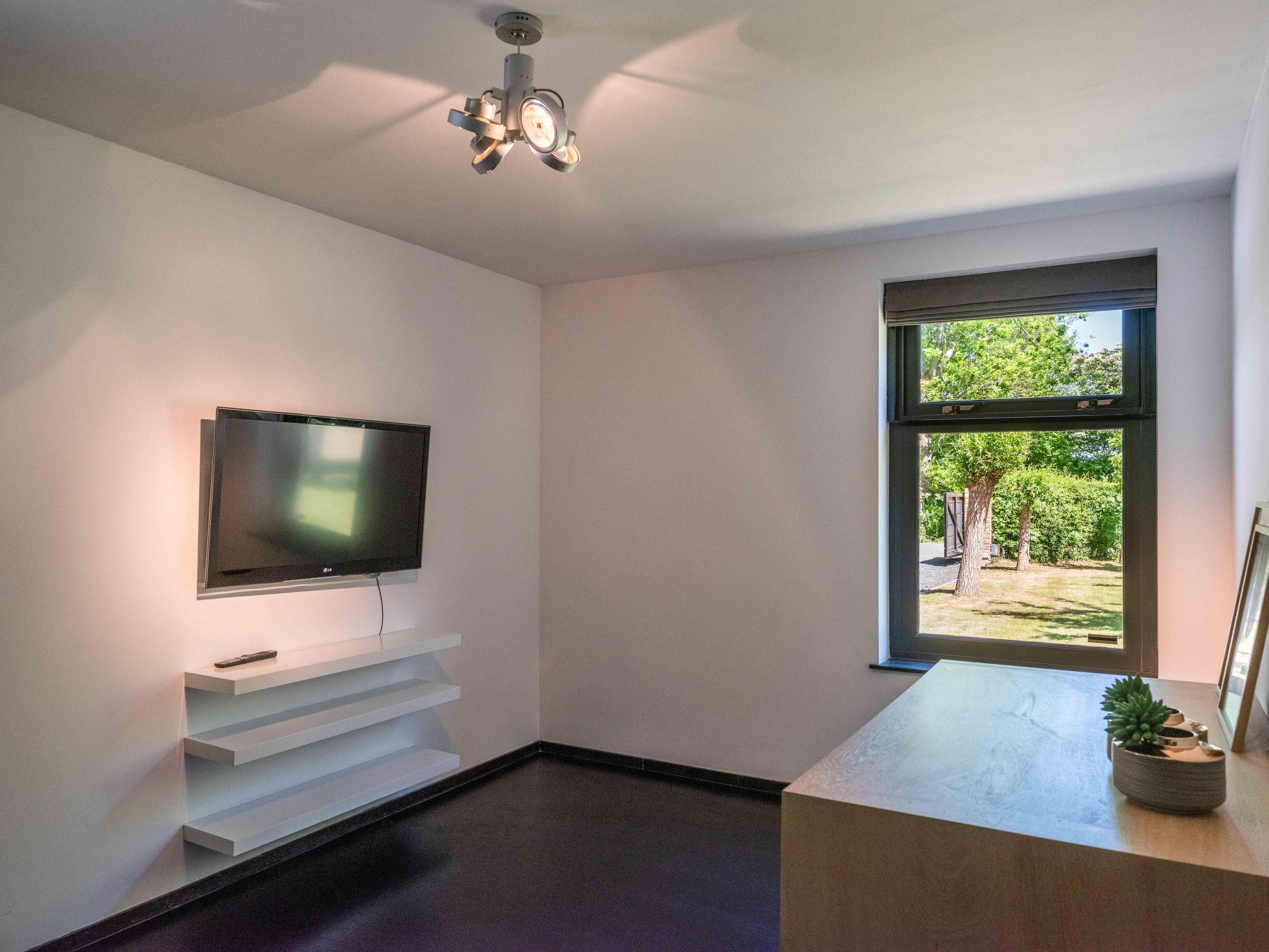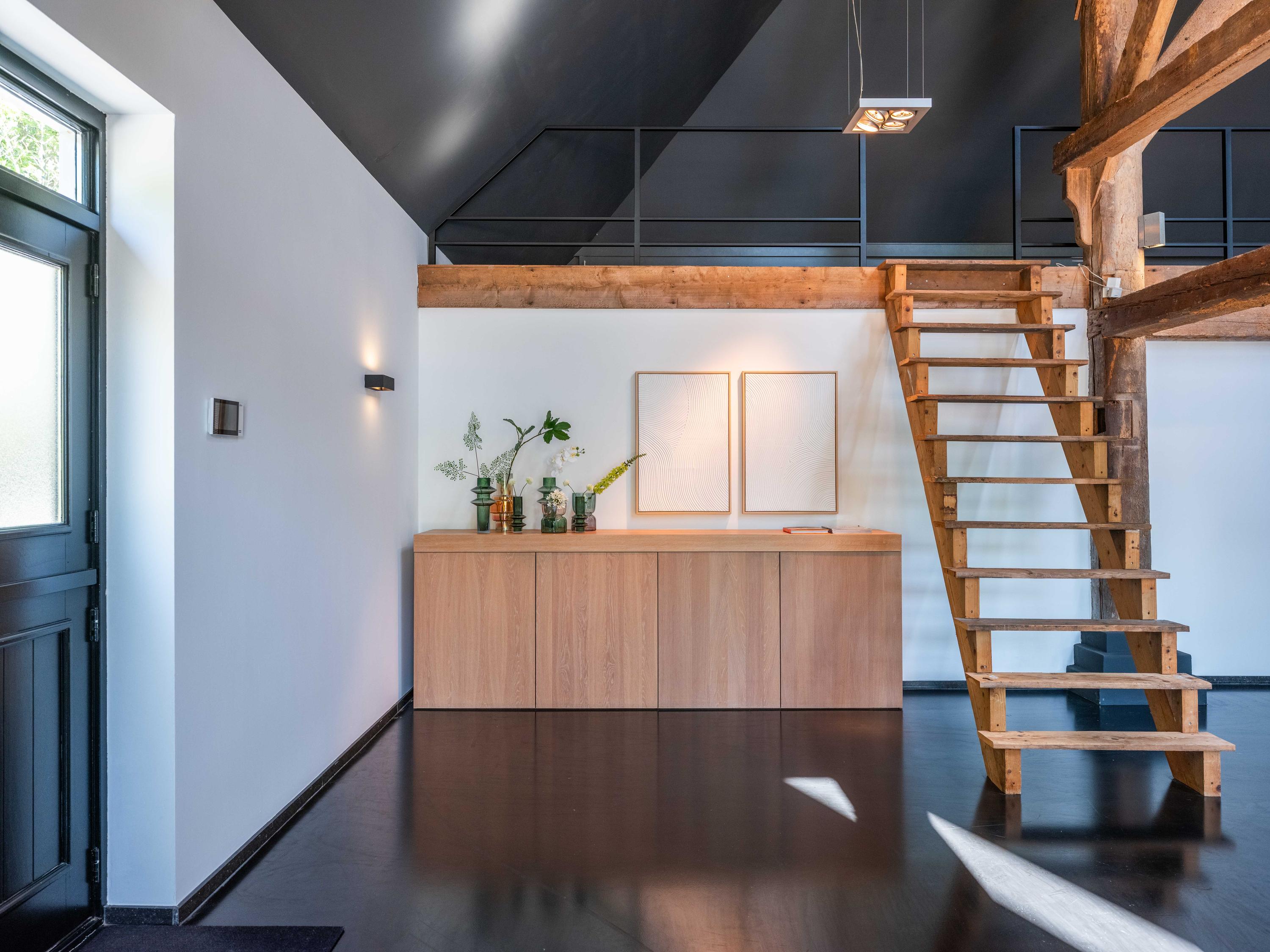 The living room where the ceiling, which reaches to the ridge, immediately catches the eye. The contrast of colours in the house enhance its sturdy character. This very spacious living room has a fireplace and French doors to the garden. The modern open kitchen is equipped with various built-in appliances, including a Boretti 8-burner cooker, an American fridge with coffee maker and plate warmer, oven, built-in fridge and dishwasher.