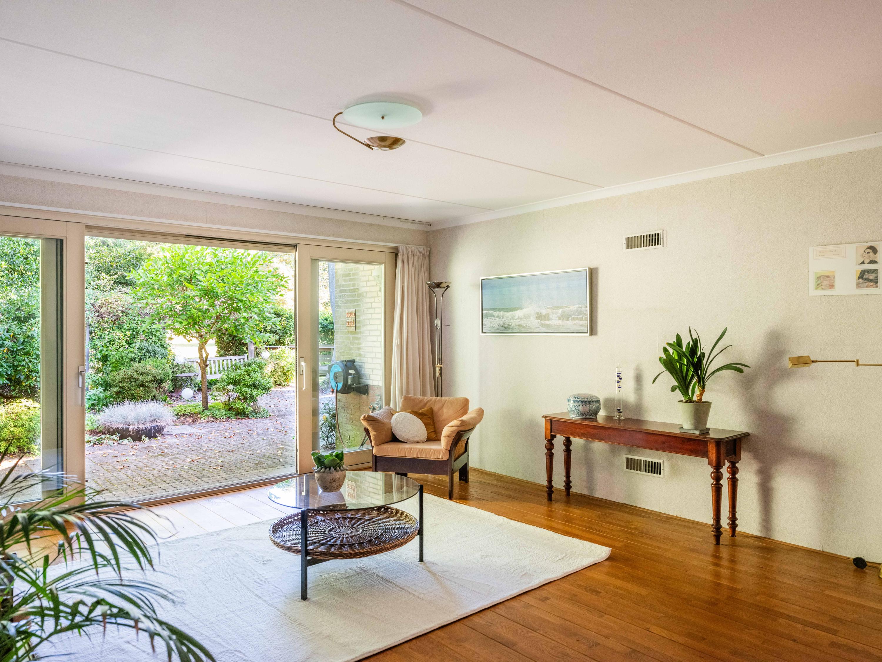 Through the large sliding doors, you step into the sunny, sheltered backyard, a wonderful place to enjoy peace and privacy, with a terrace and a view of the pond. The beautifully landscaped, sunny garden is an oasis of peace and privacy. The terrace borders the exclusive, communal park with ponds – a unique place where you can enjoy nature to the fullest. The park is exclusively accessible to local residents.