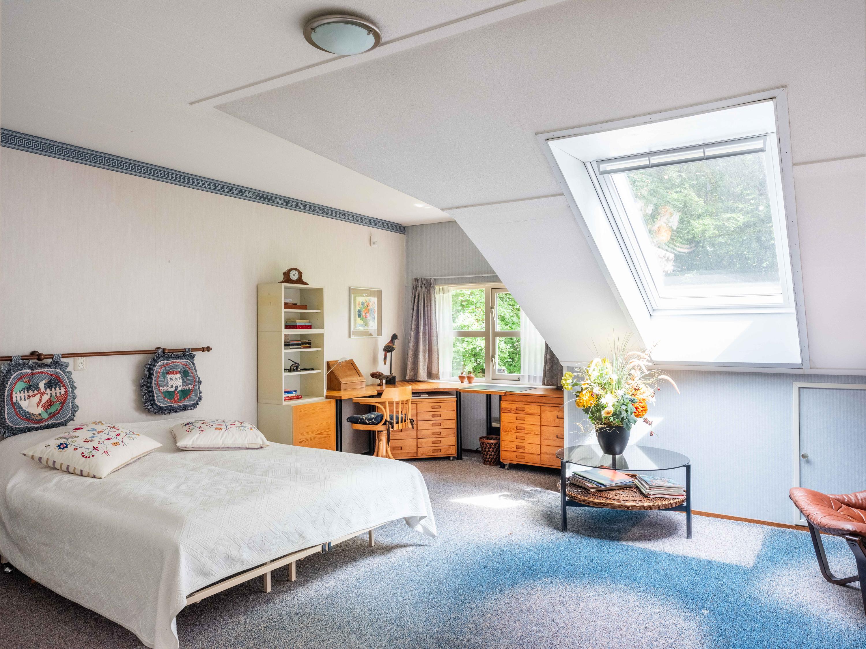 On the ground floor, you will also find a spacious room on the garden side, which can be used as an office, but is also ideal as a bedroom. The bathroom on the ground floor has a bathtub with shower, double sink, and toilet.