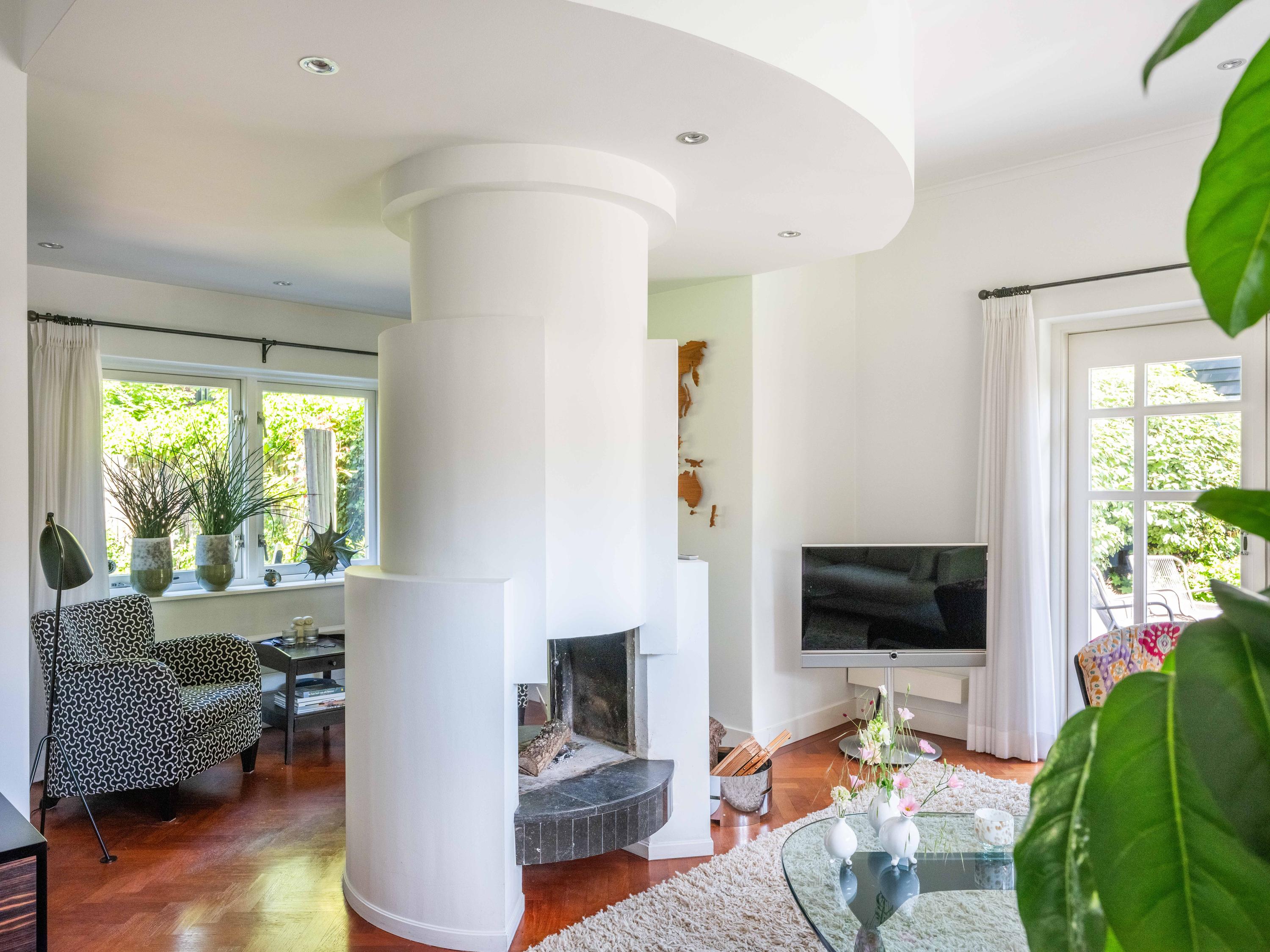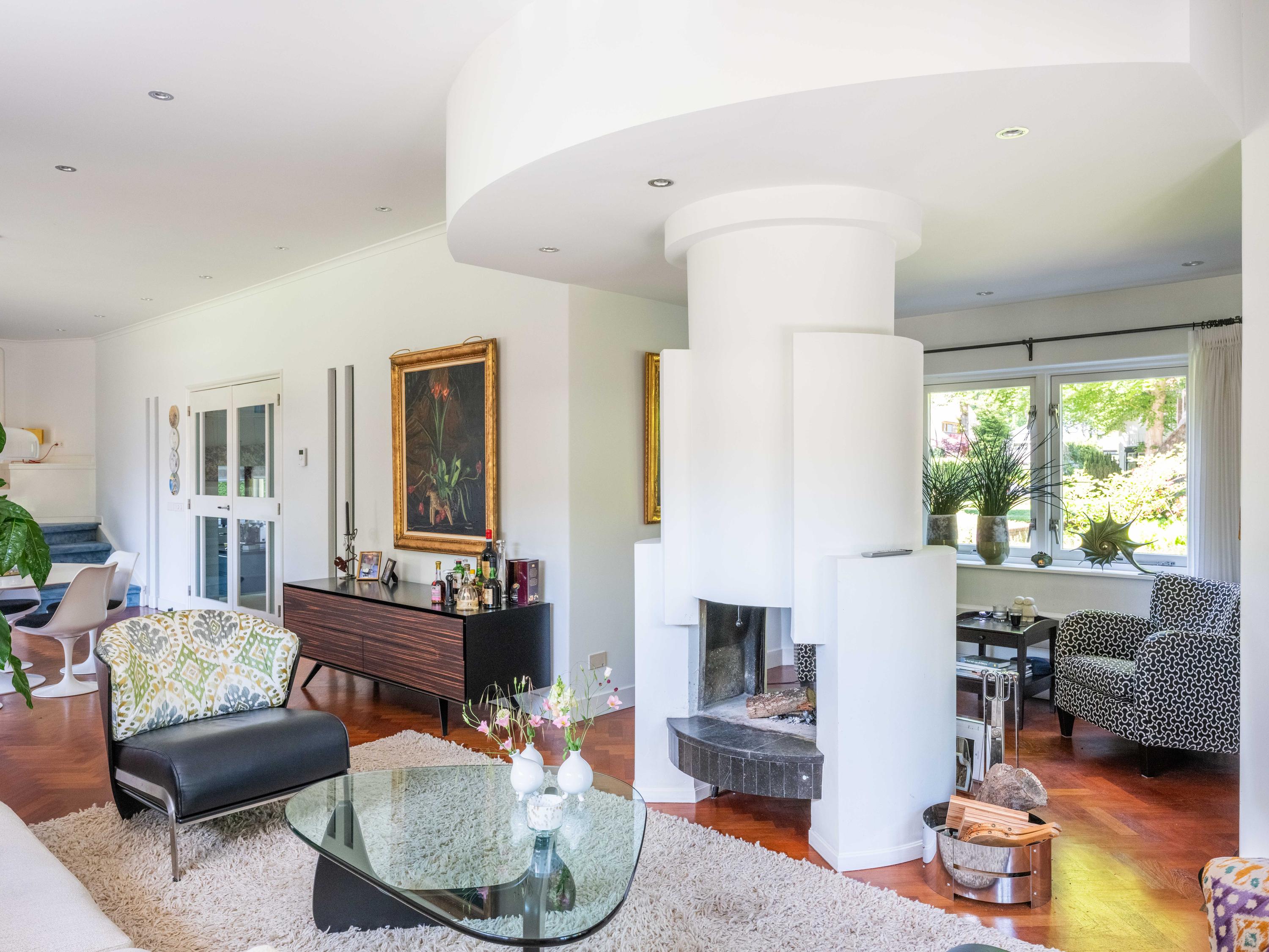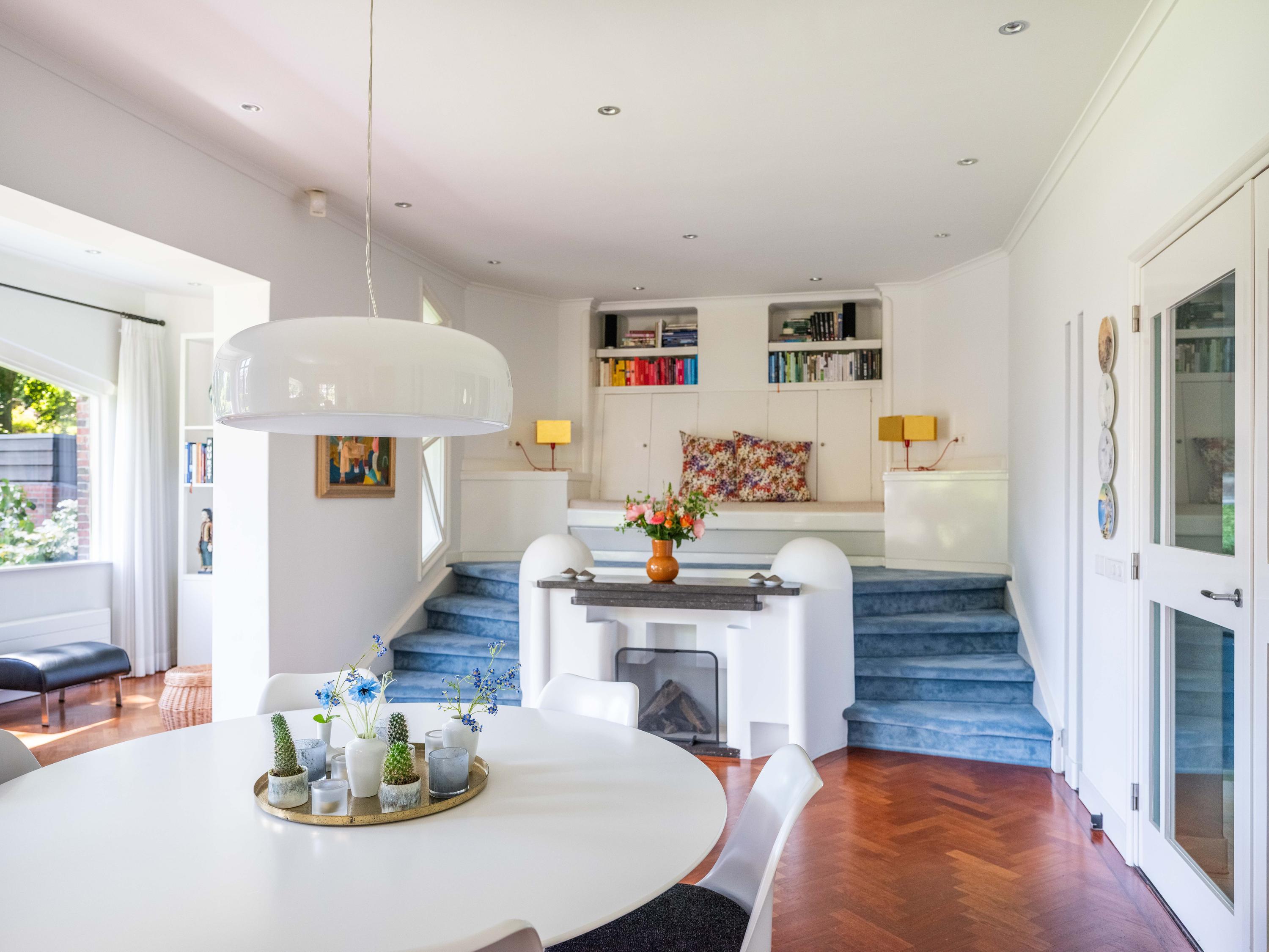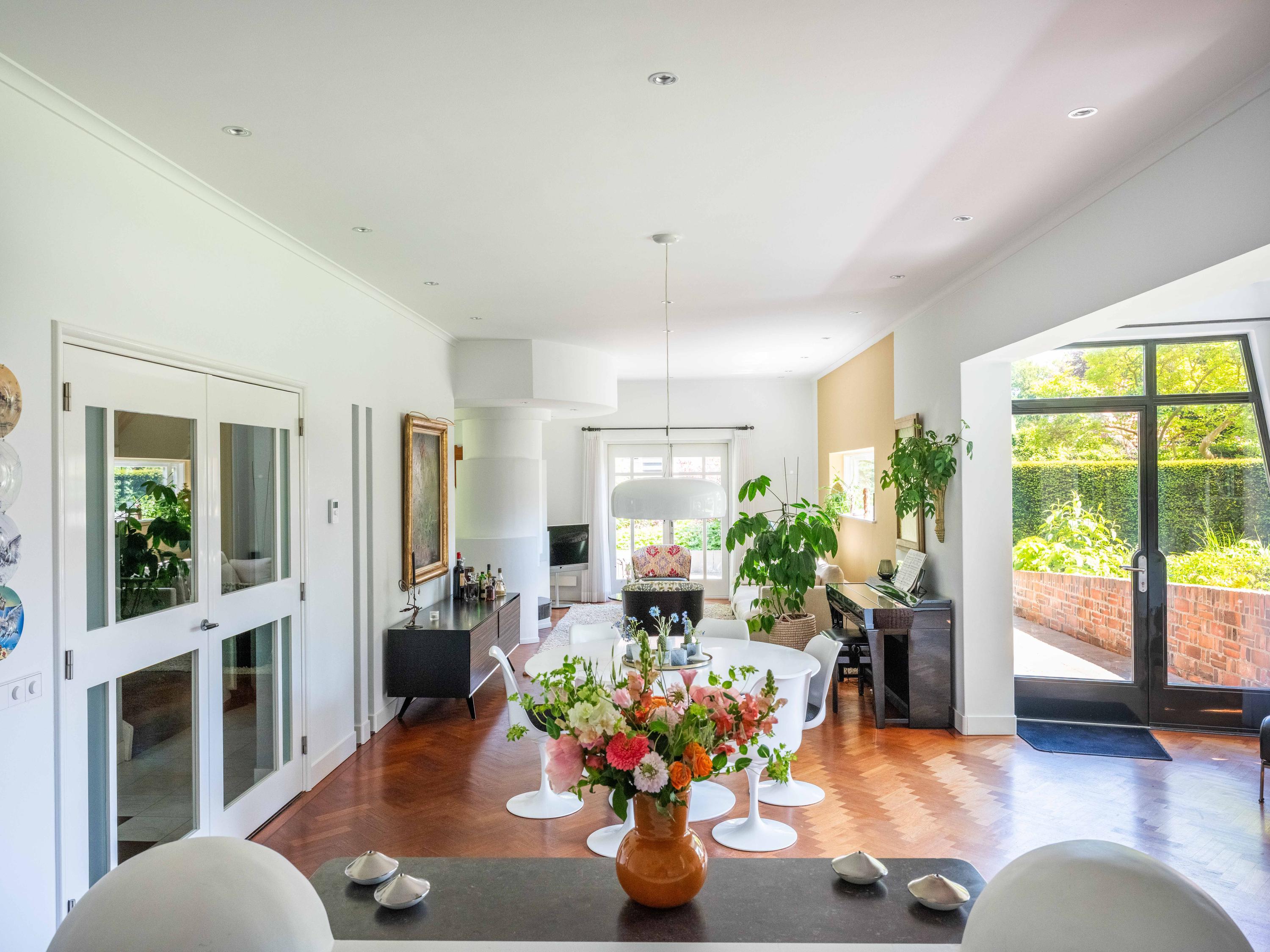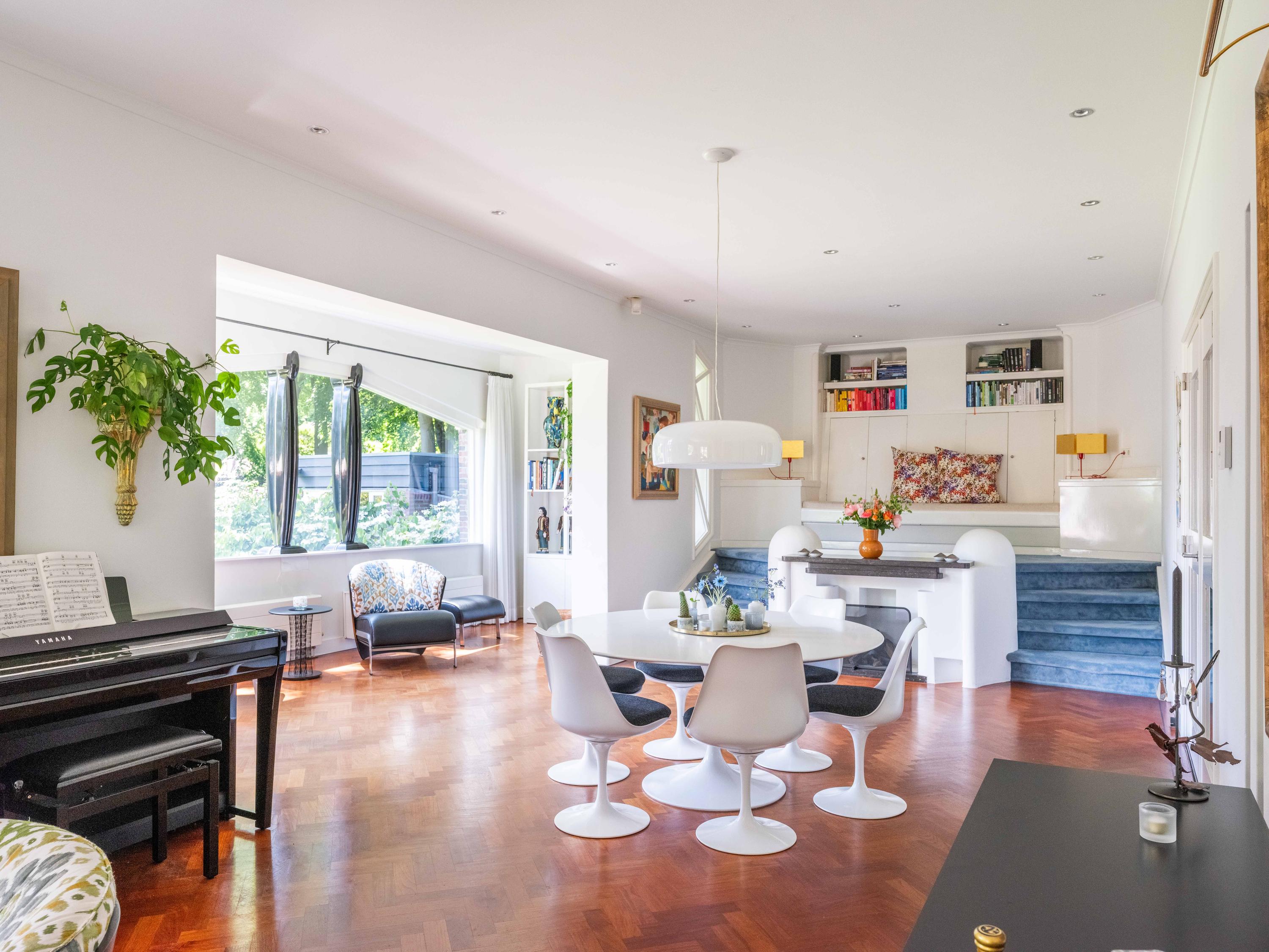 French doors lead to the spacious living room with fireplace, a dining area and conservatory. A striking feature is the raised section, known as the ‘wheelhouse’, which has monumental value. A beautiful parquet floor with piping, the rounded shapes of the fireplace, the ‘compass balls’ near the raised section and the trapezoidal window with columns give the whole a special appearance.