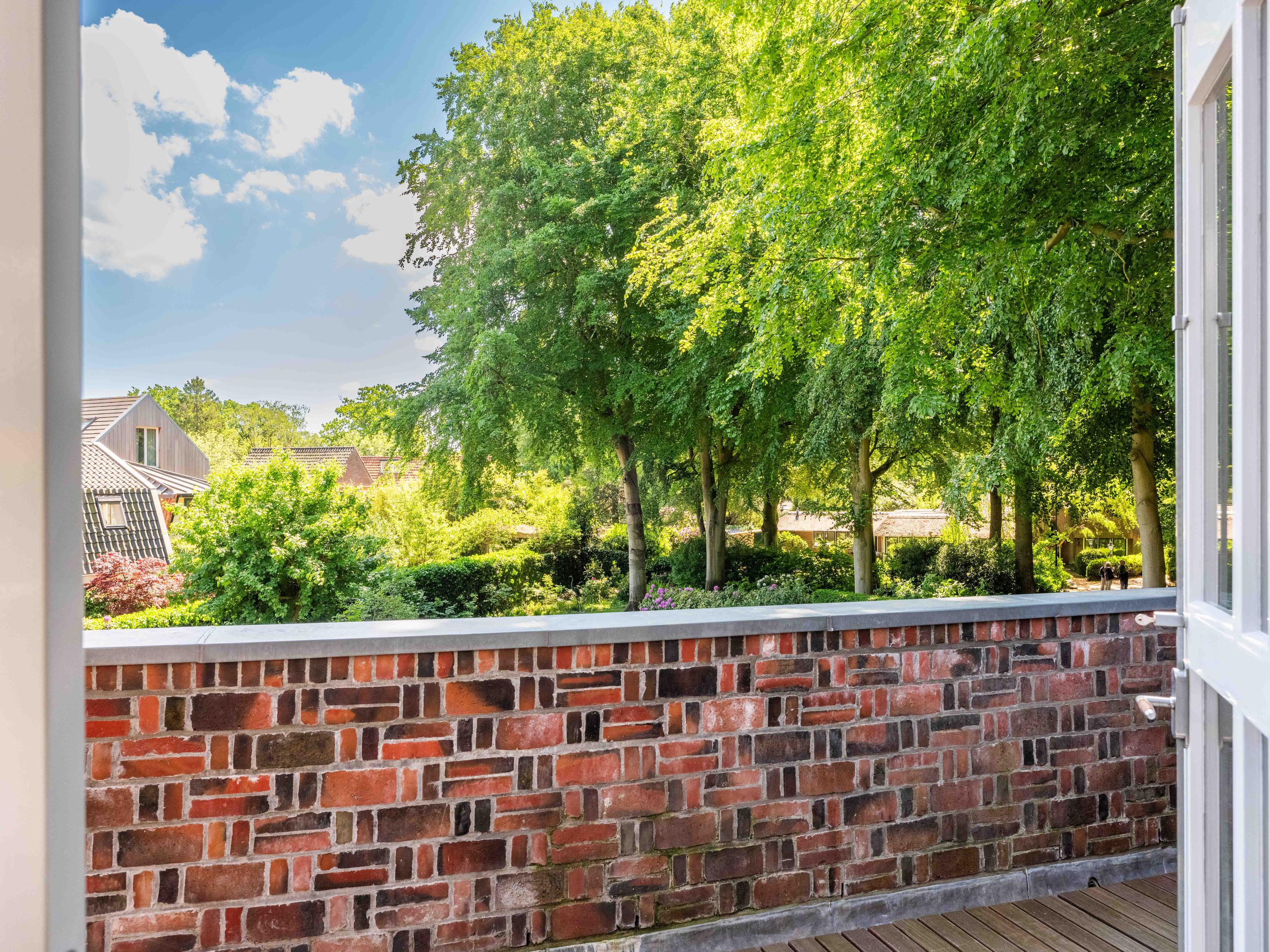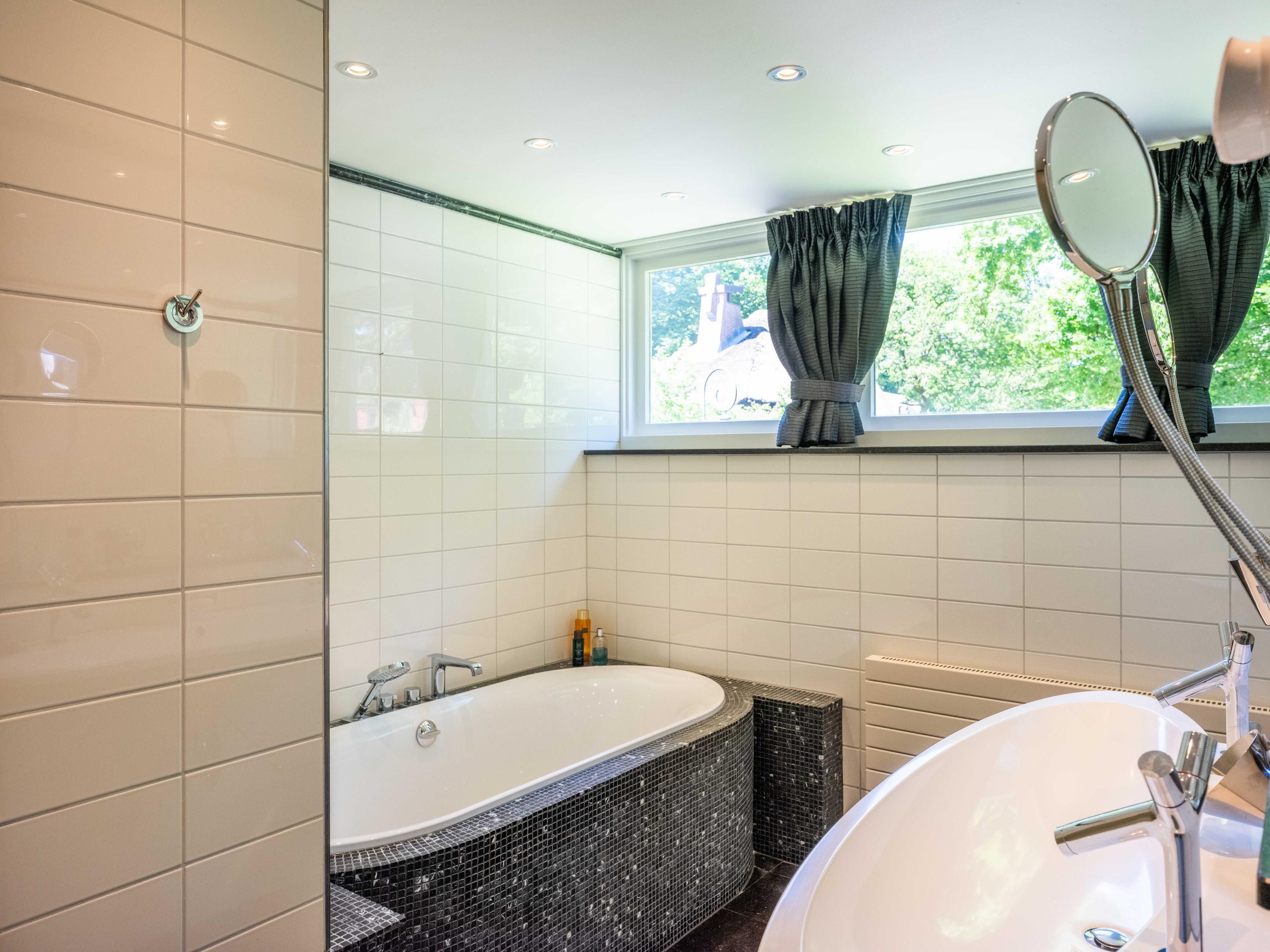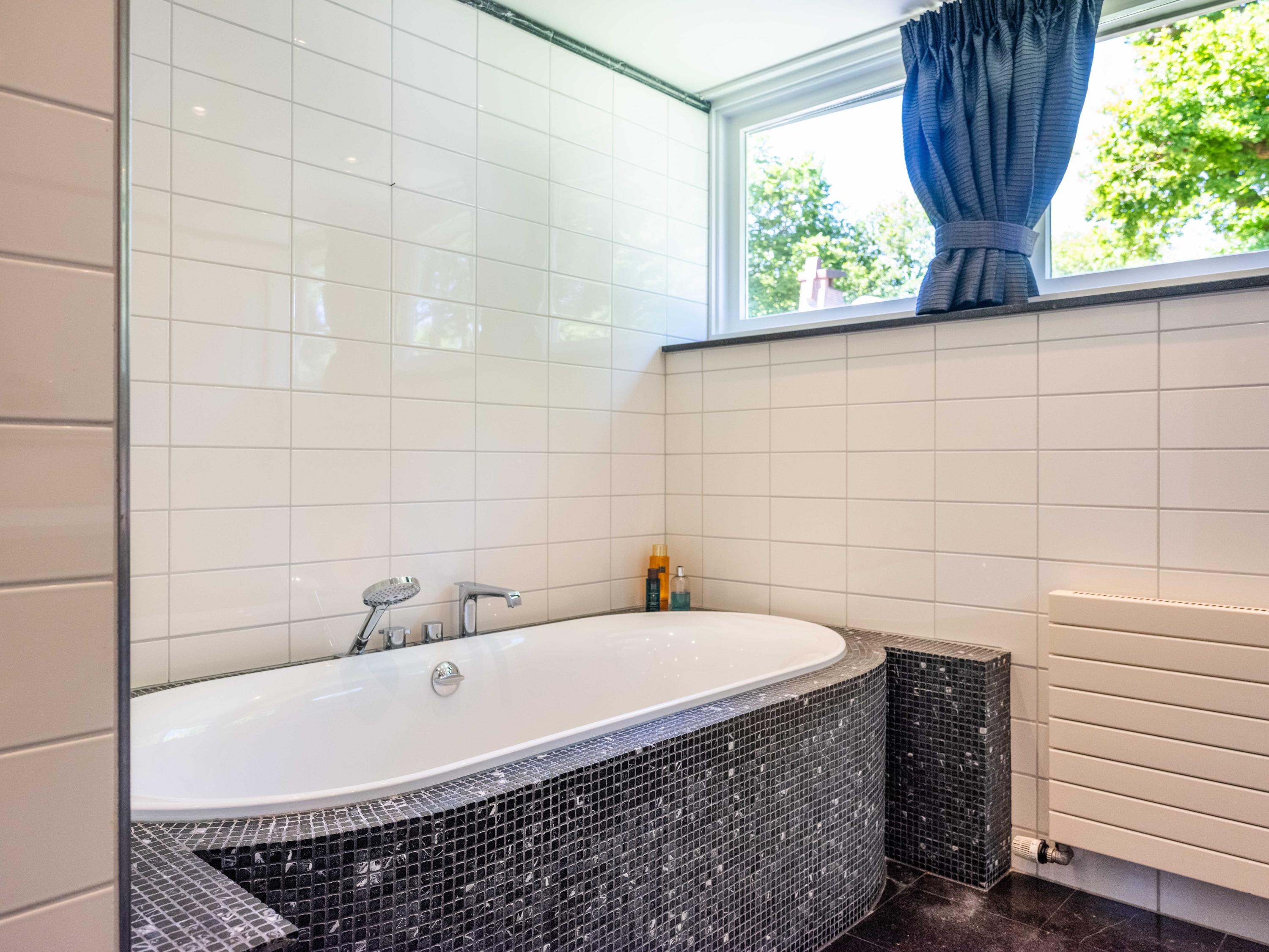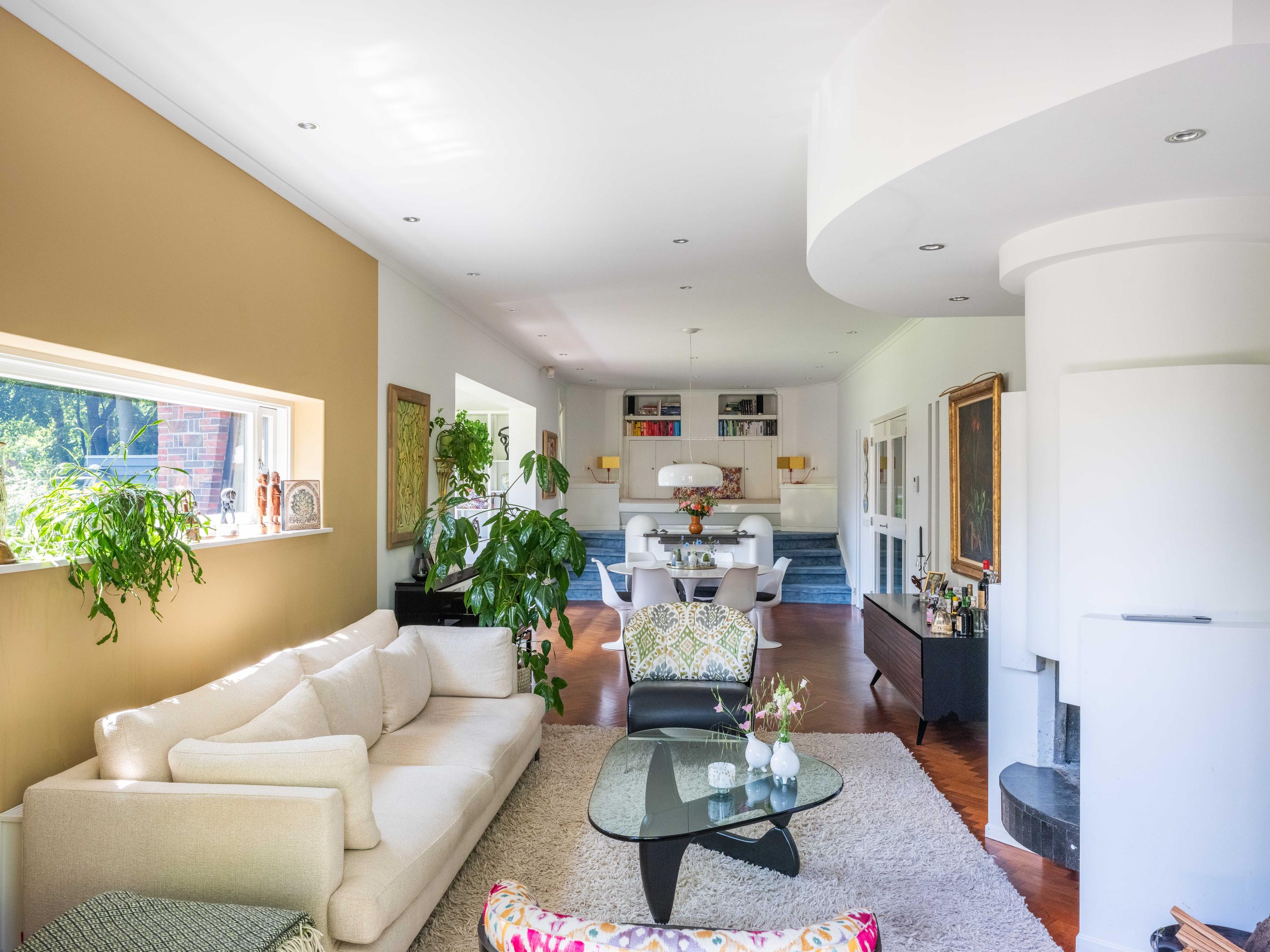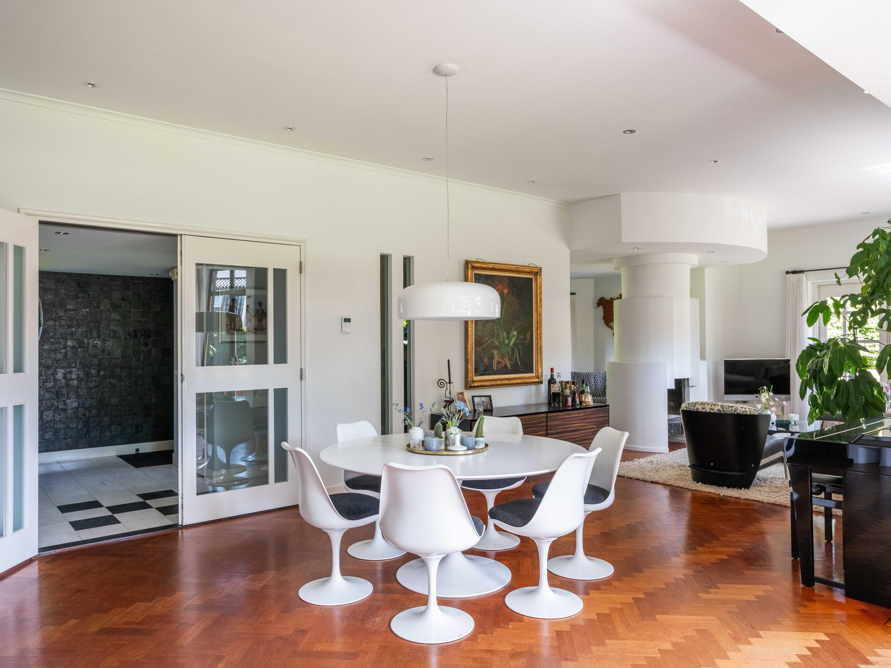 French doors lead to the spacious living room with fireplace, a dining area and conservatory. A striking feature is the raised section, known as the ‘wheelhouse’, which has monumental value. A beautiful parquet floor with piping, the rounded shapes of the fireplace, the ‘compass balls’ near the raised section and the trapezoidal window with columns give the whole a special appearance.