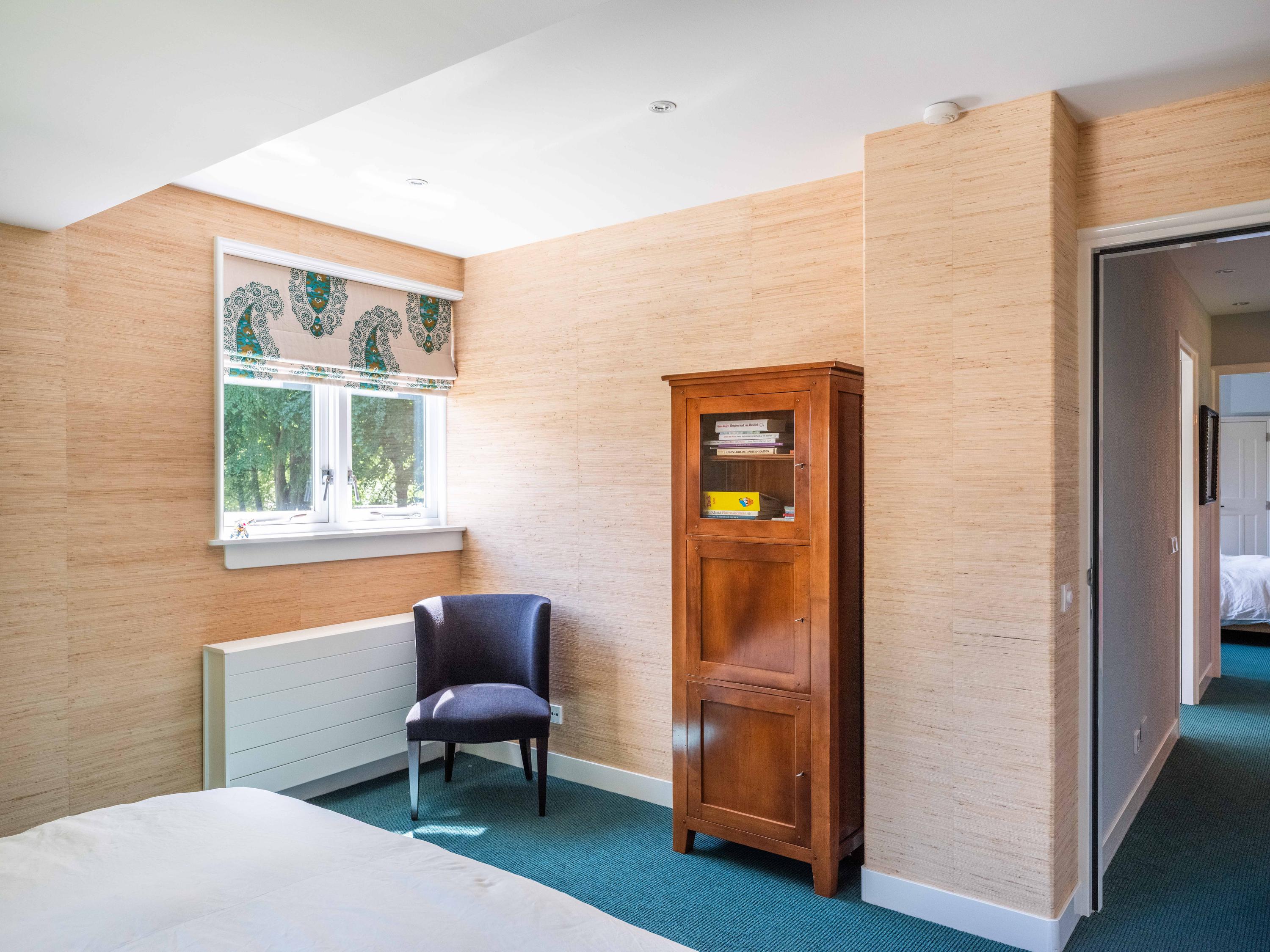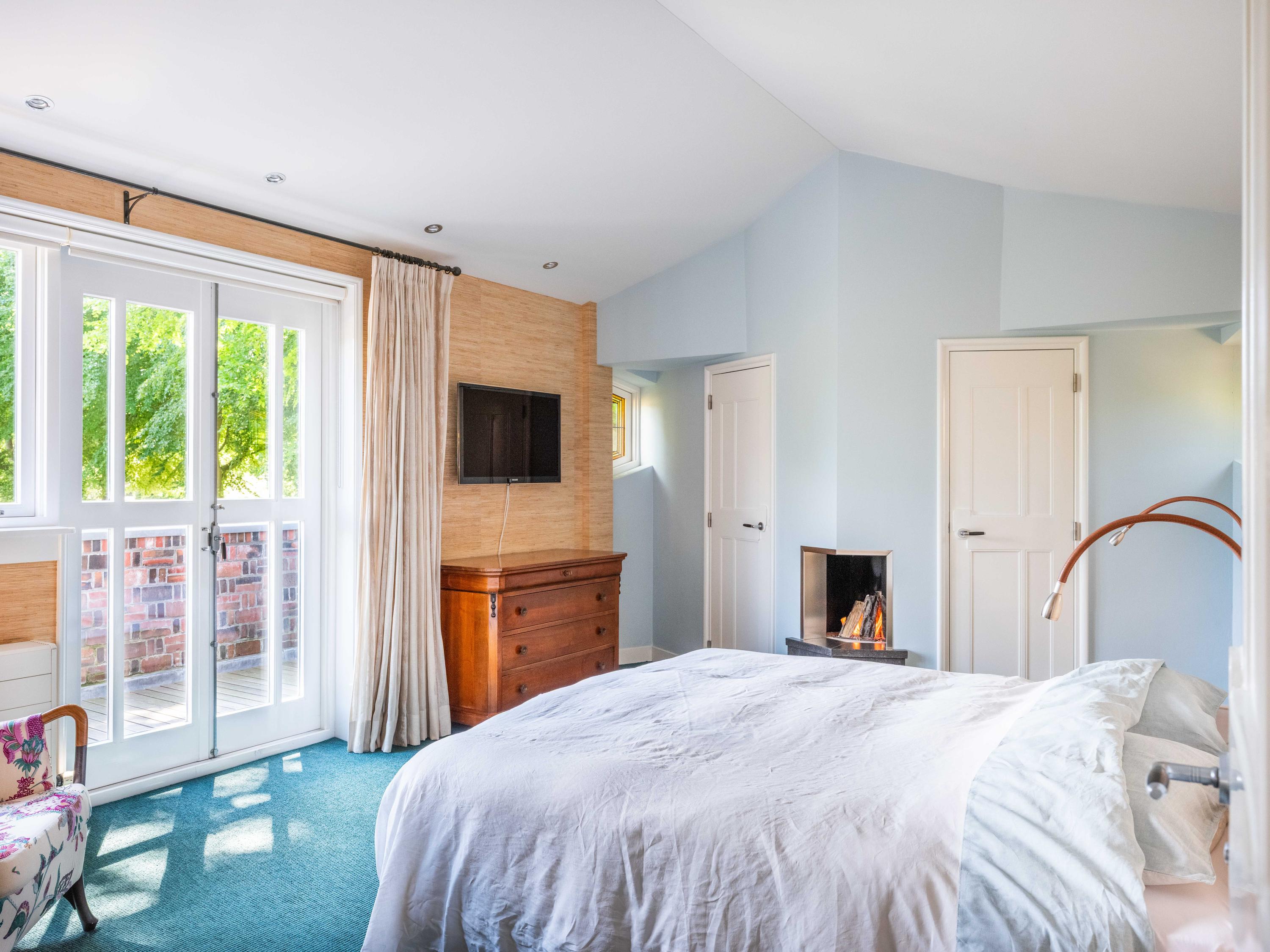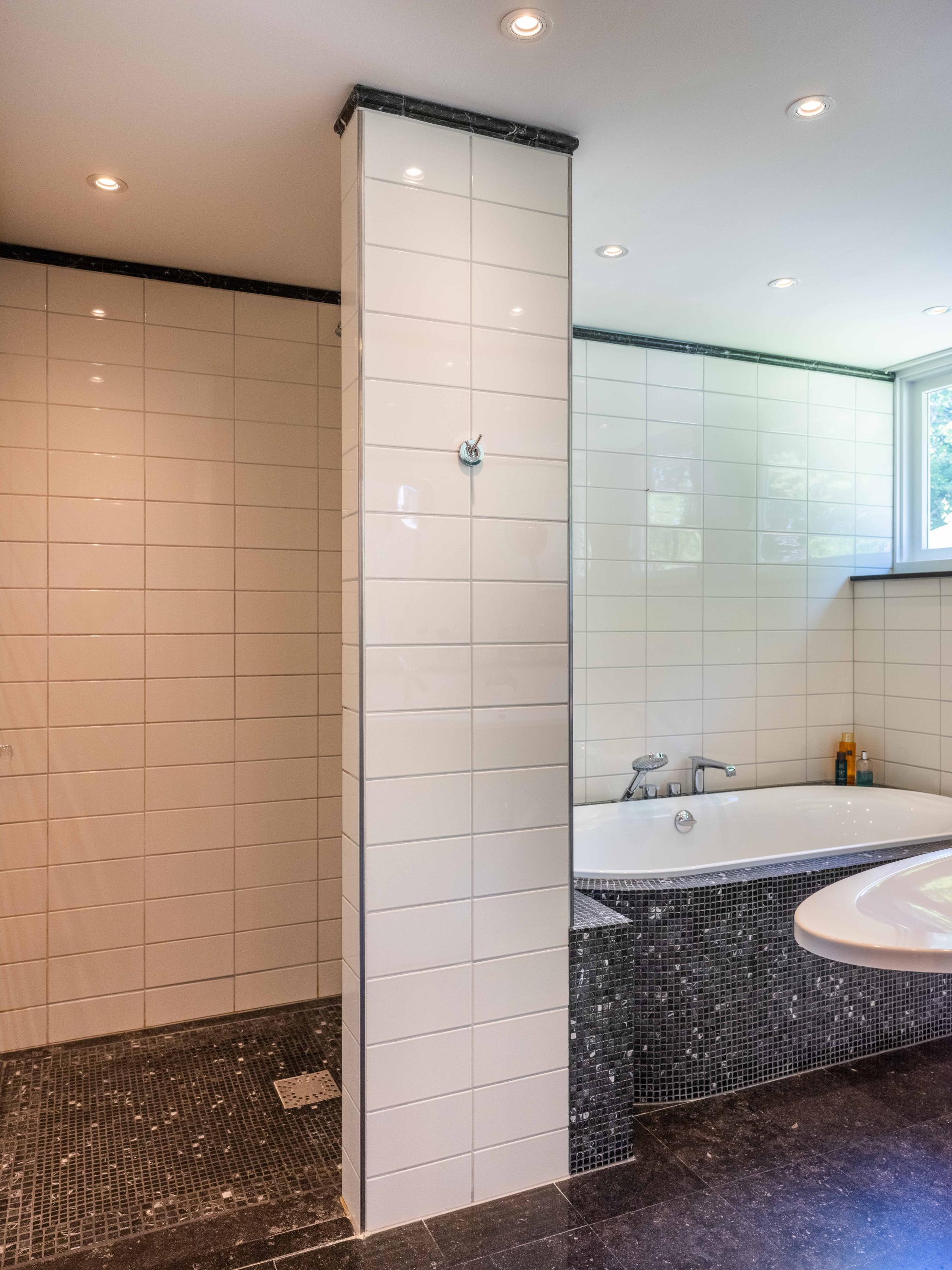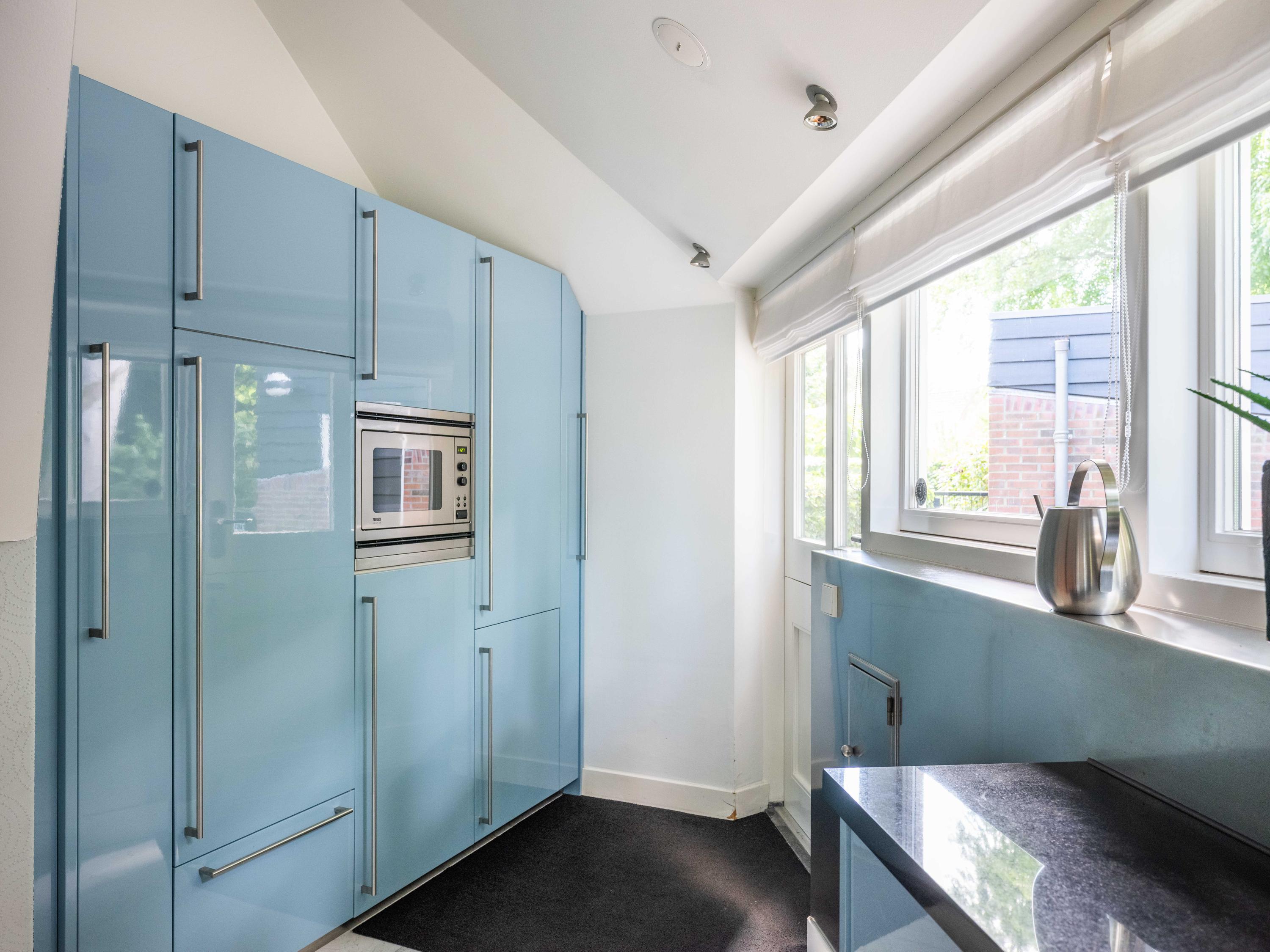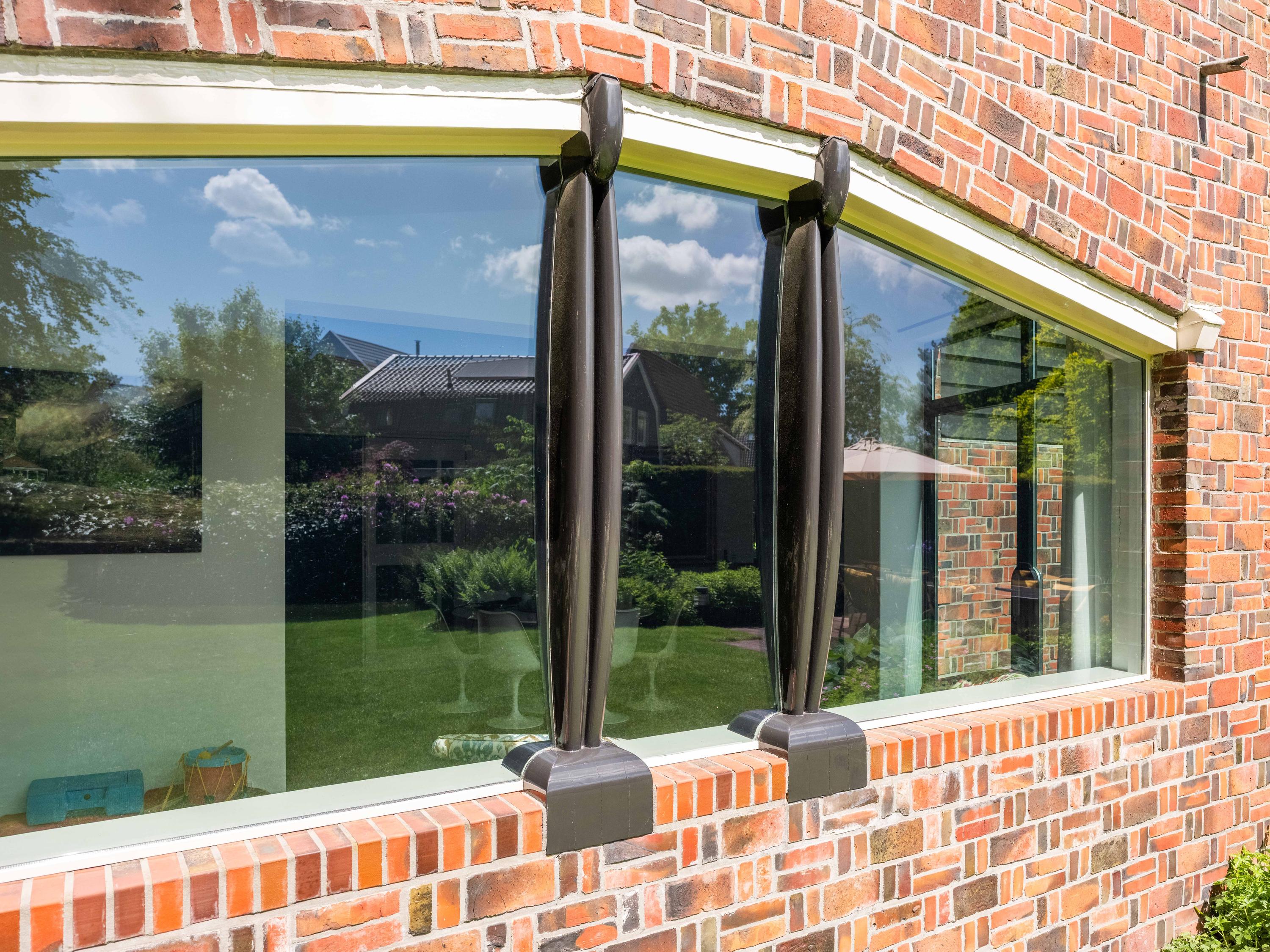 French doors lead to the spacious living room with fireplace, a dining area and conservatory. A striking feature is the raised section, known as the ‘wheelhouse’, which has monumental value. A beautiful parquet floor with piping, the rounded shapes of the fireplace, the ‘compass balls’ near the raised section and the trapezoidal window with columns give the whole a special appearance.