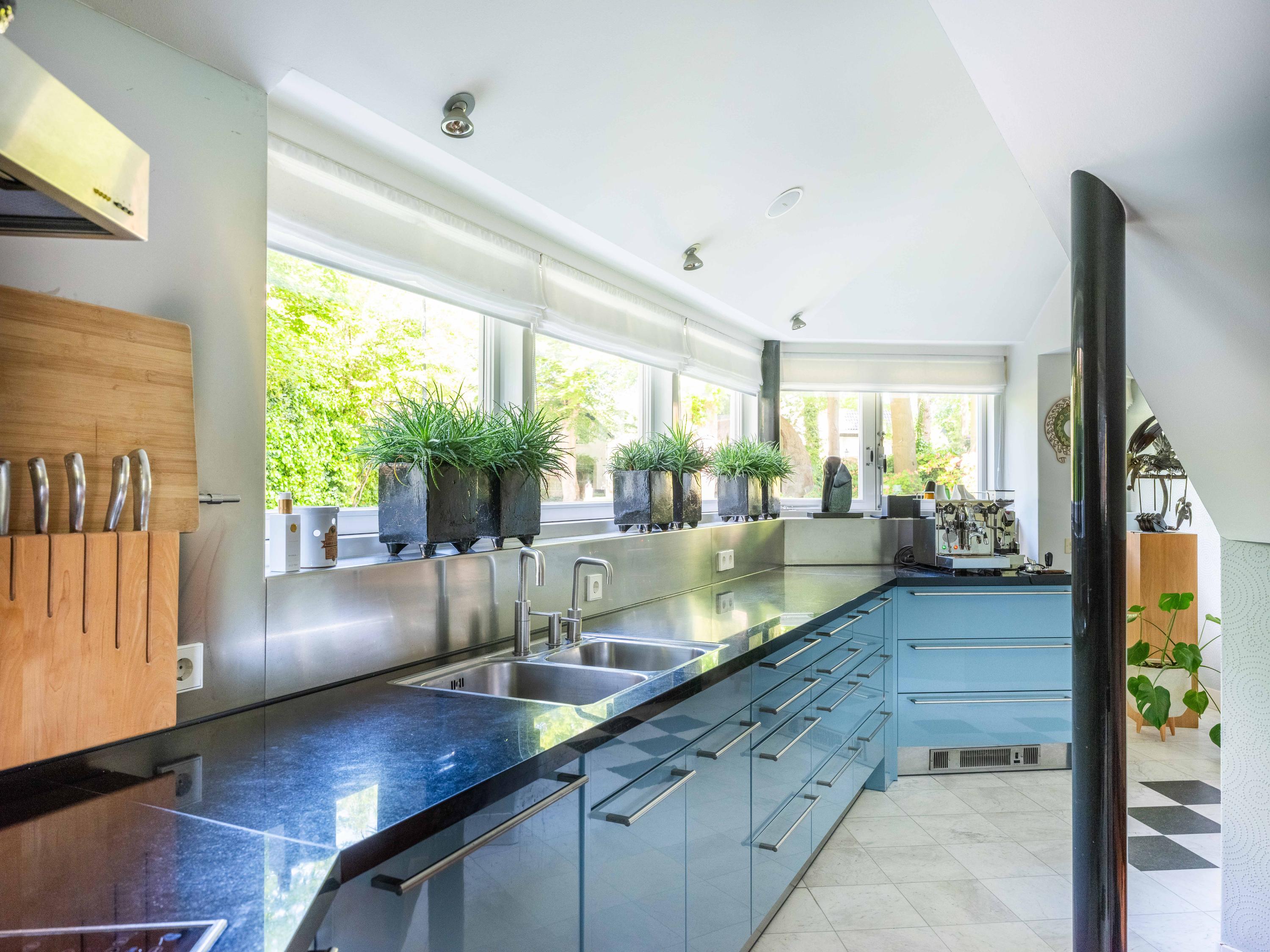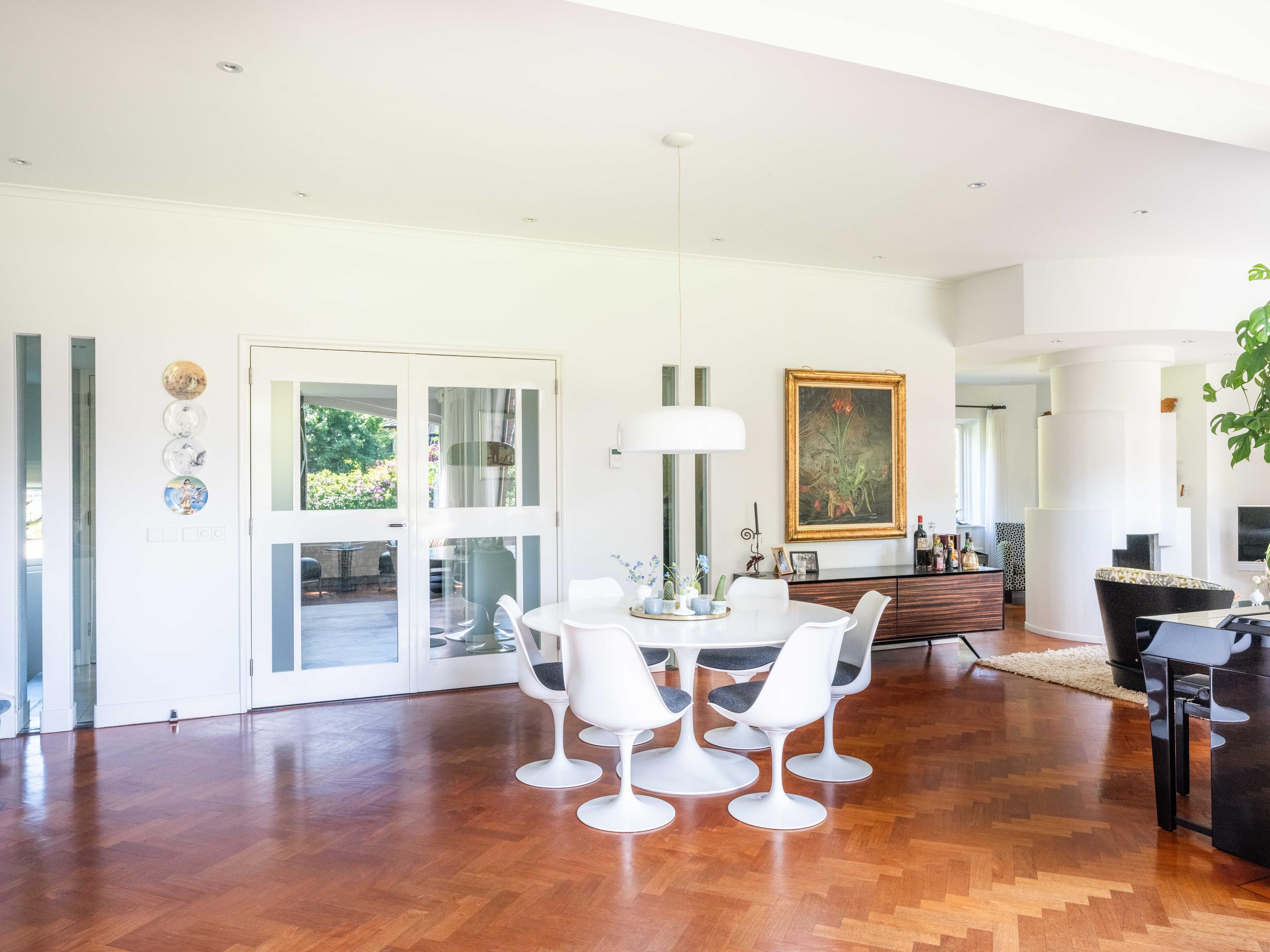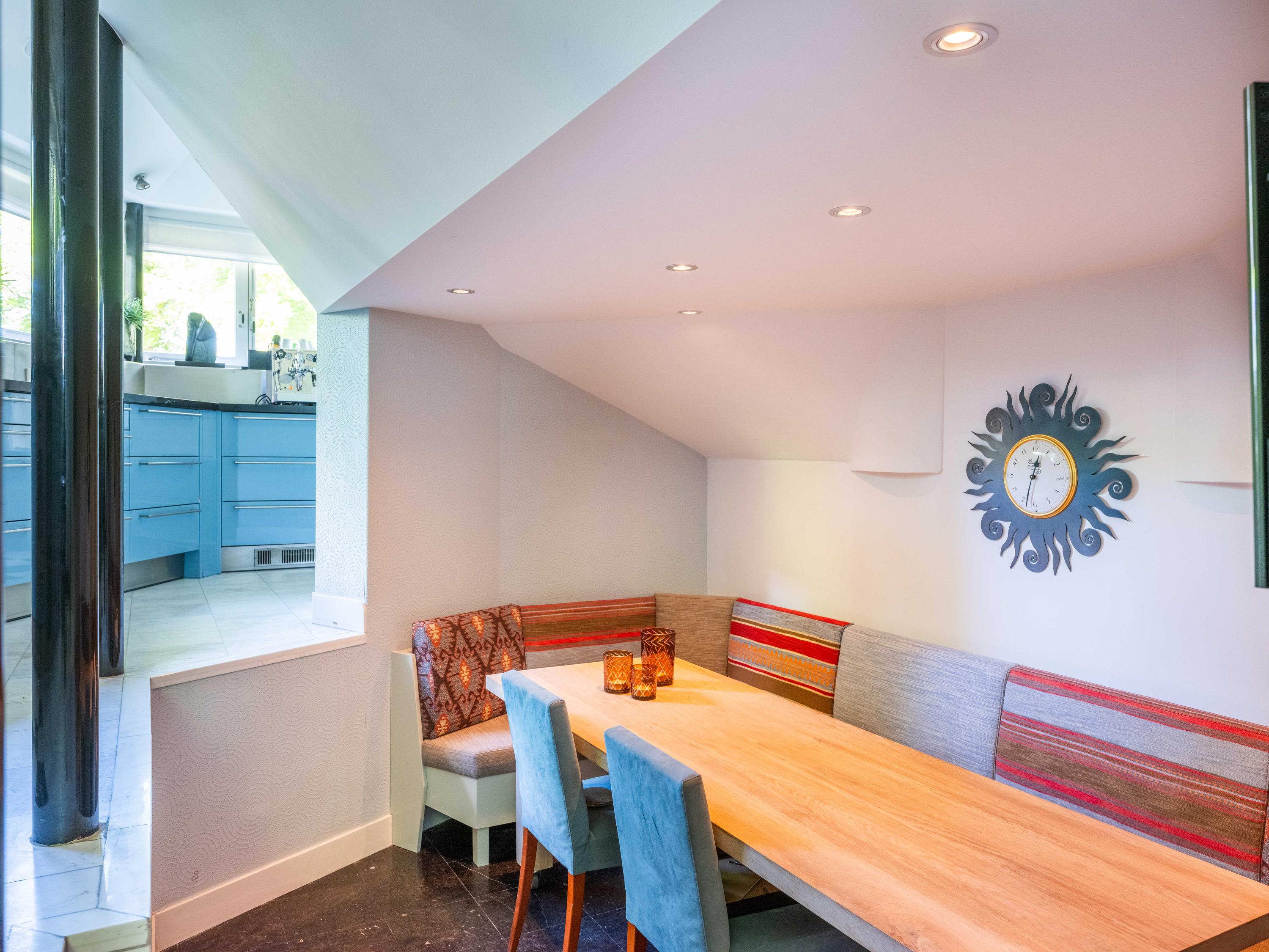 A few steps down from the hall leads to the kitchen, equipped with modern built-in appliances. Its shape, a half hexagon, gives it a playful and unique design, as does the dining area with space for a large table, which is one level lower.