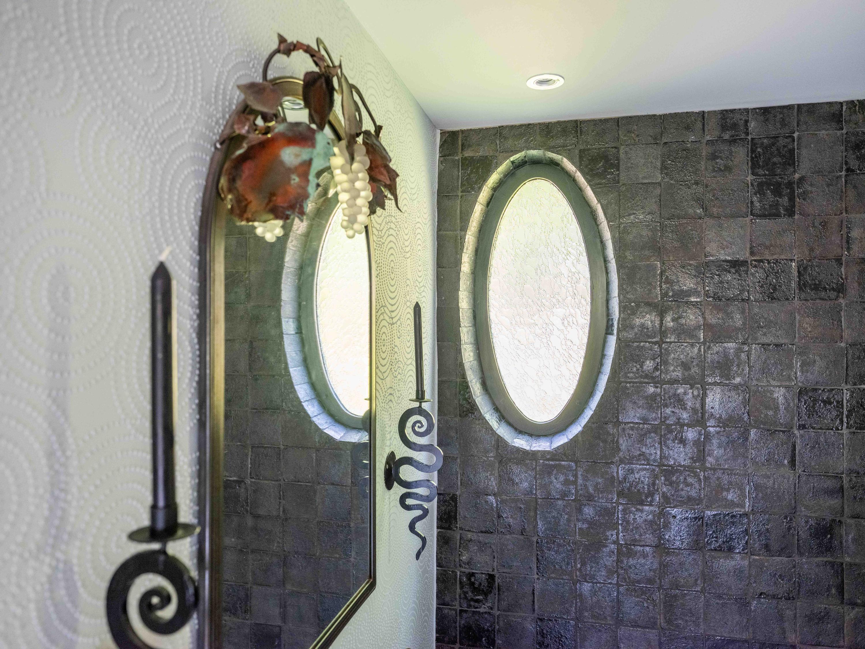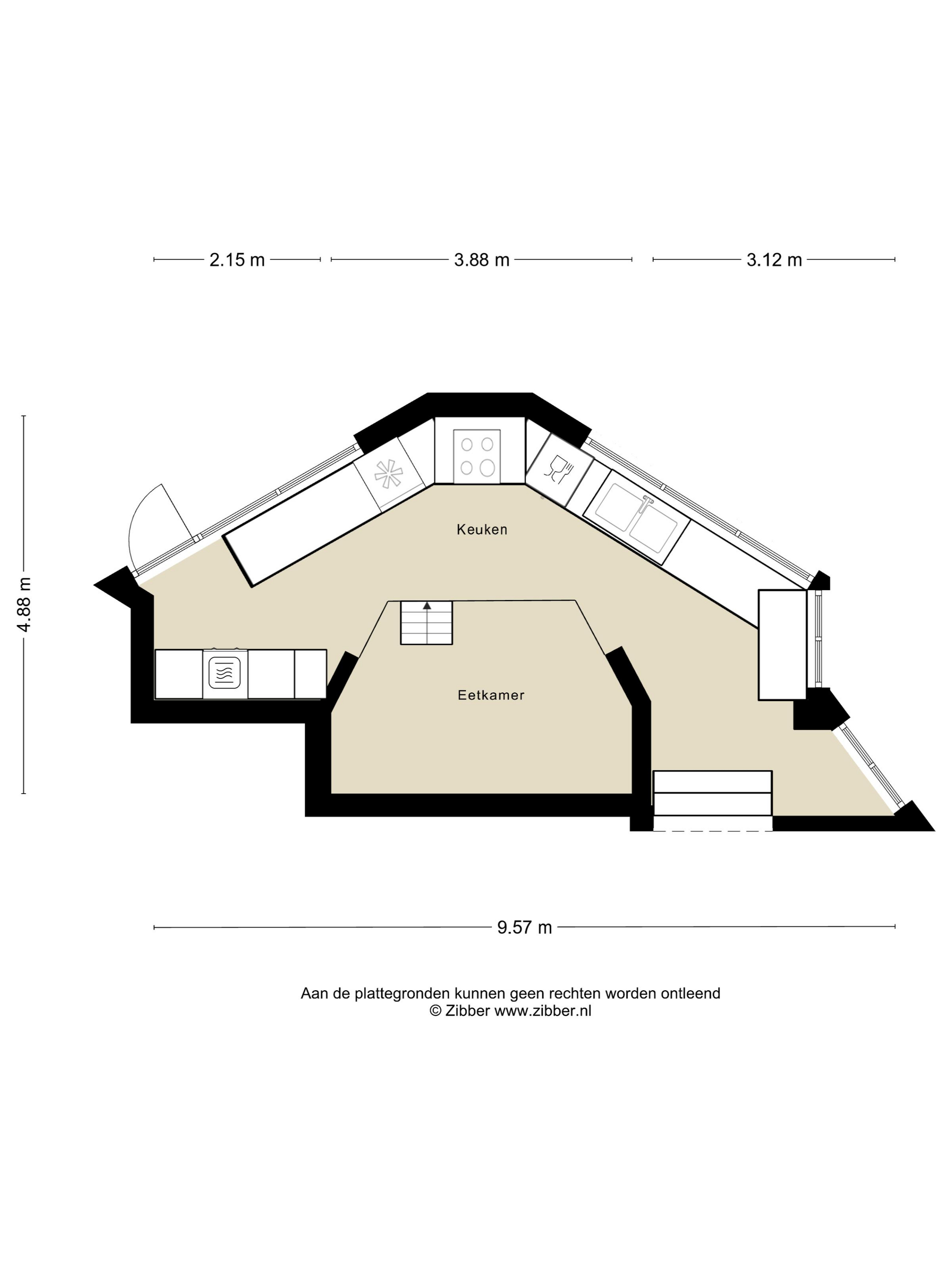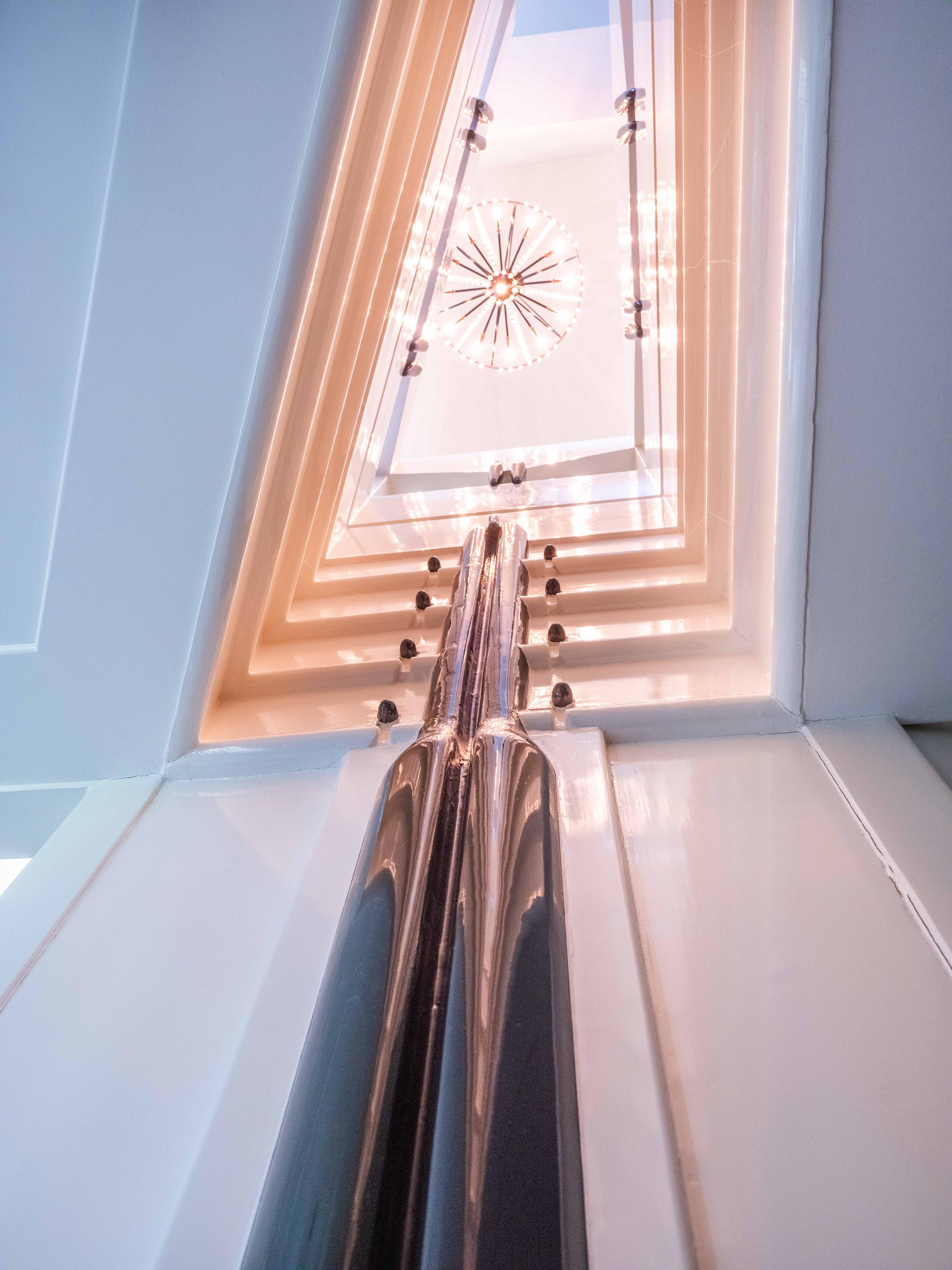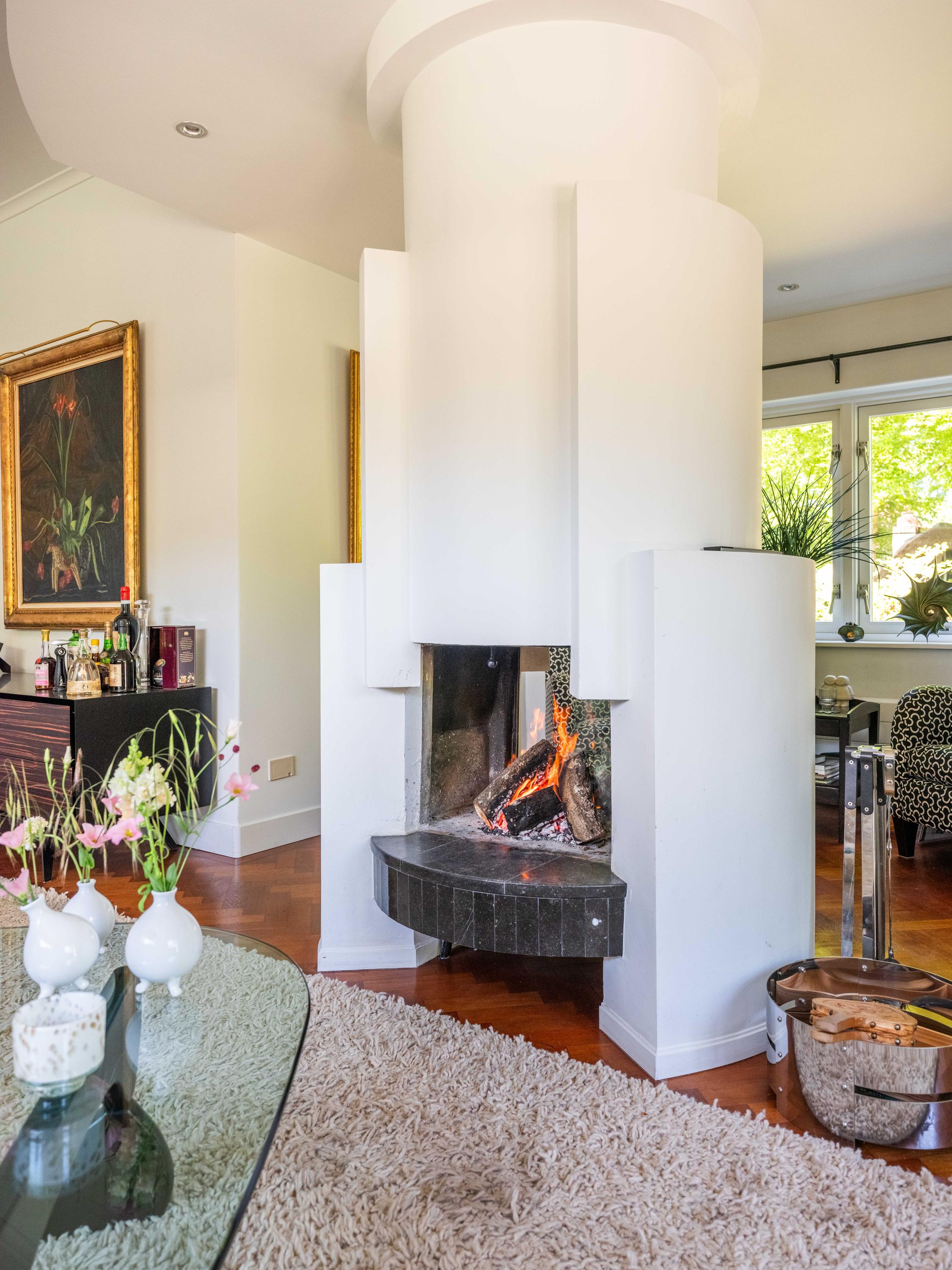 A few steps down from the hall leads to the kitchen, equipped with modern built-in appliances. Its shape, a half hexagon, gives it a playful and unique design, as does the dining area with space for a large table, which is one level lower.