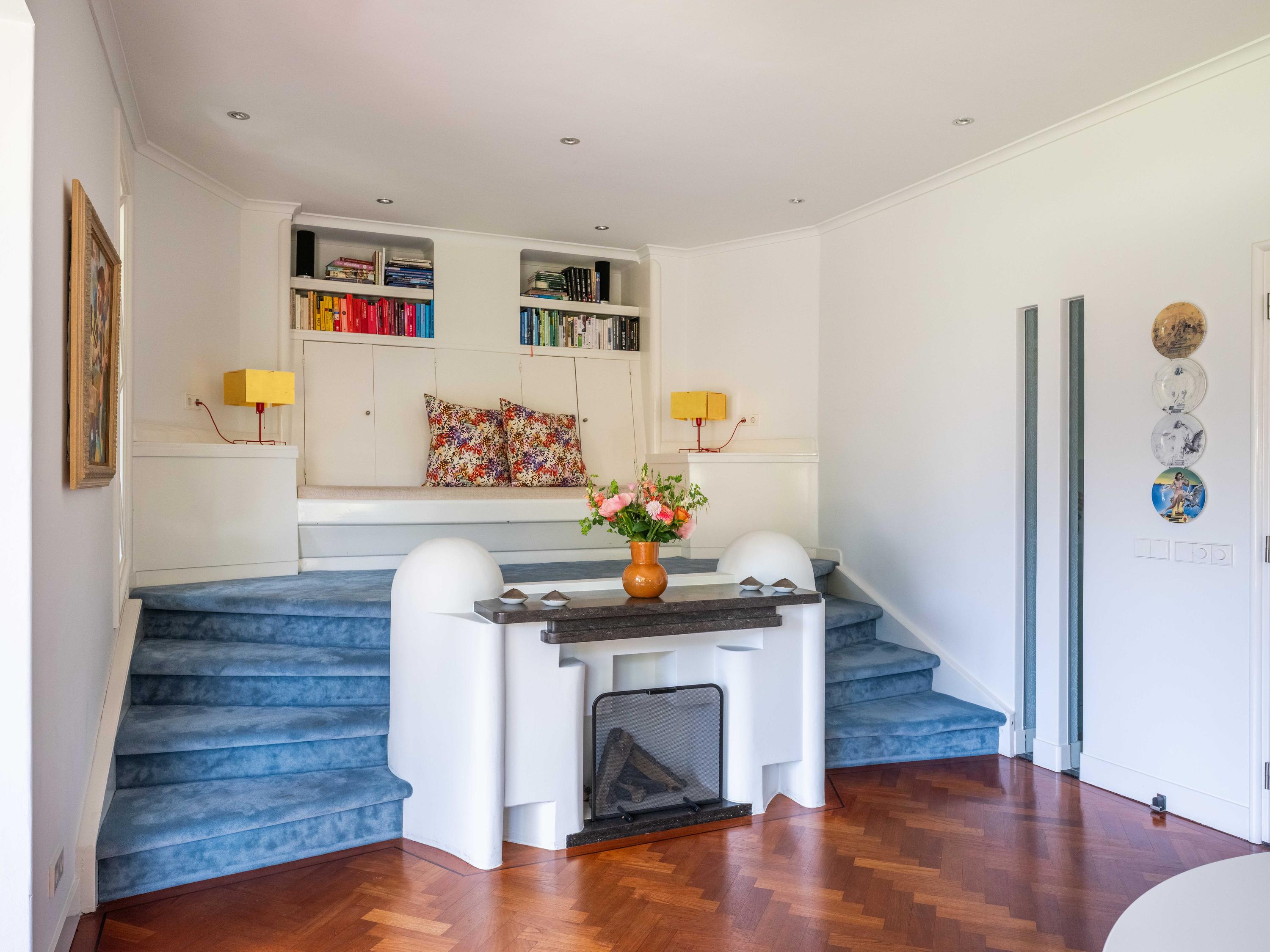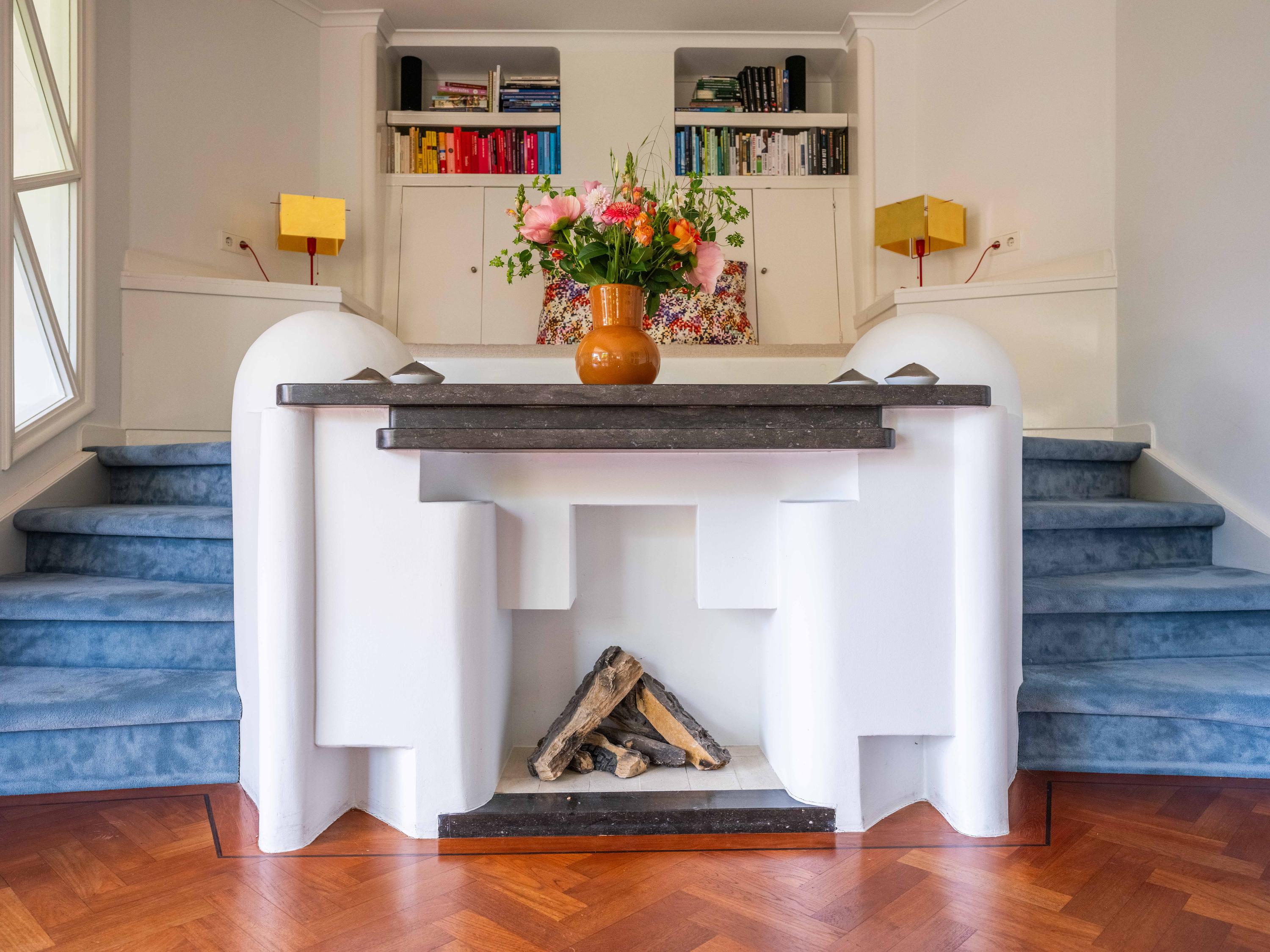 The staircase with Amsterdam School ornaments and beautiful stained-glass windows leads to the first floor. Here are three spacious bedrooms, including the master bedroom with a gas fireplace, walk-in closet and a balcony overlooking the green garden and monumental trees. Also located on the landing, a few steps lower, is a separate toilet and a spacious bathroom with a bathtub, shower, wide sink and space for a washing machine and dryer.
