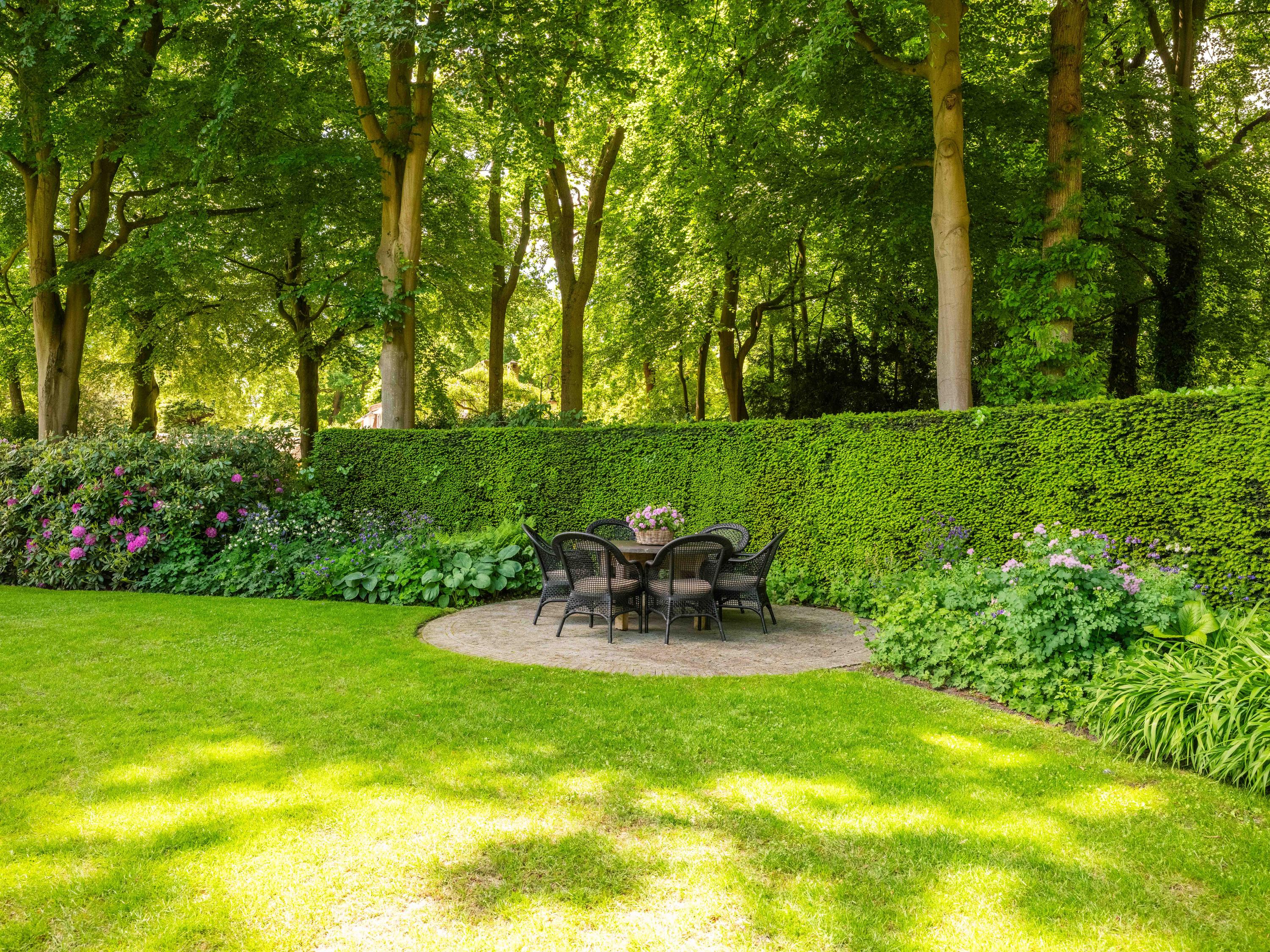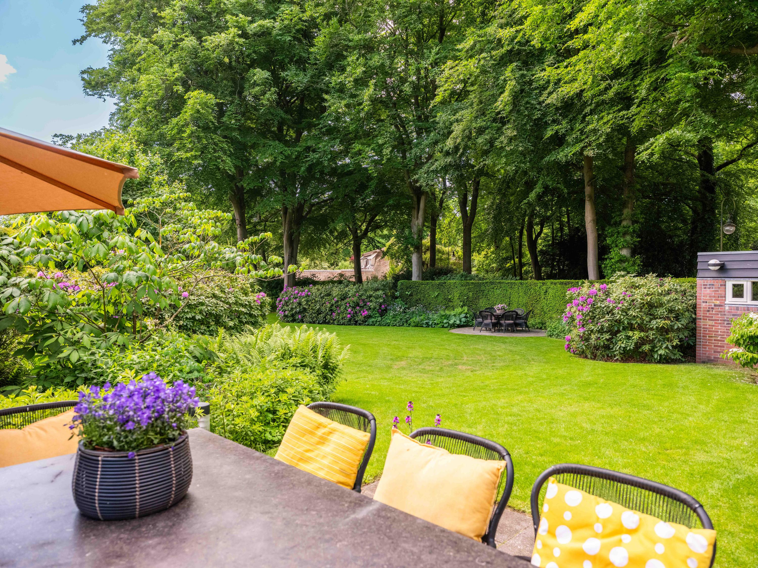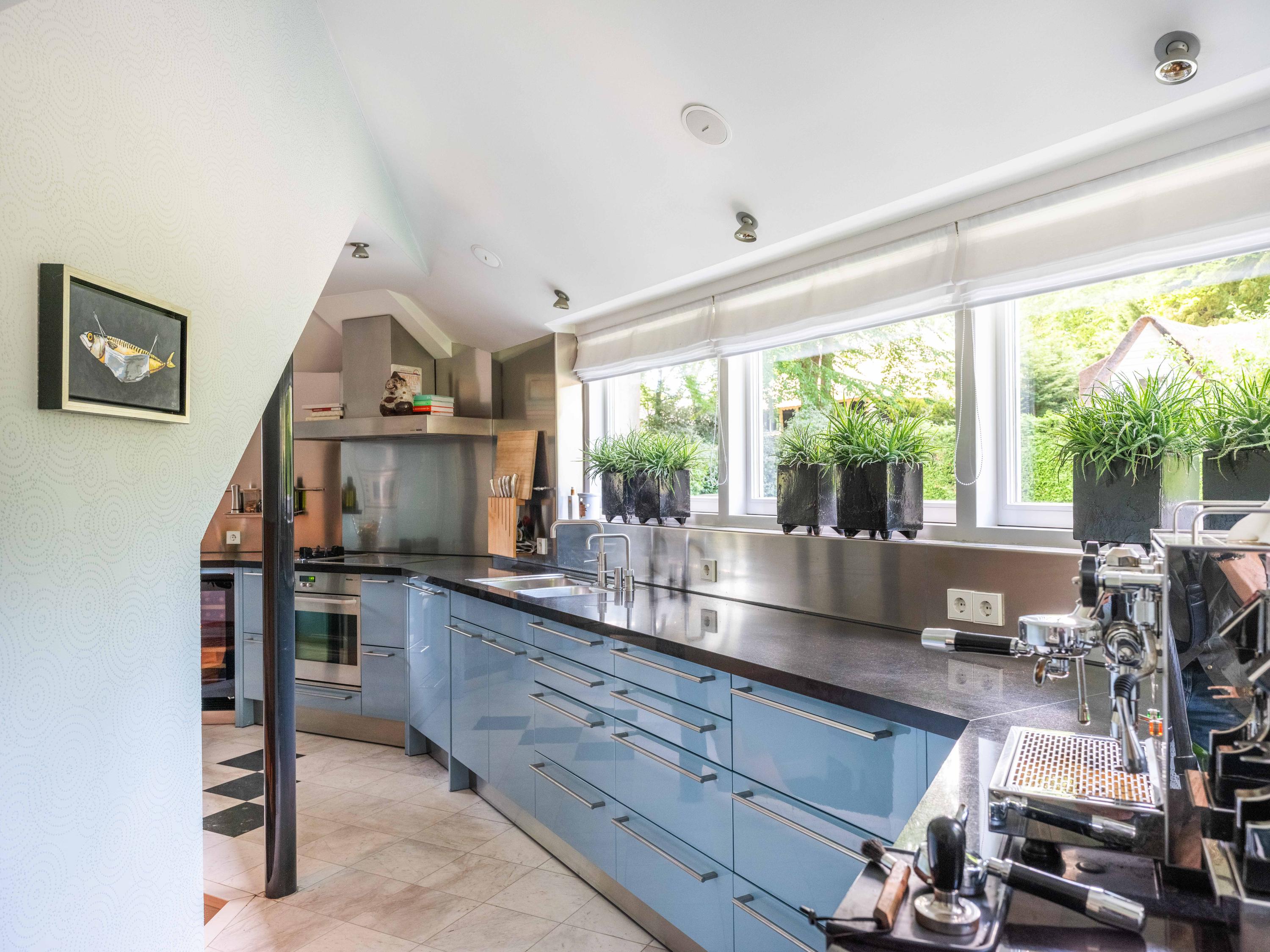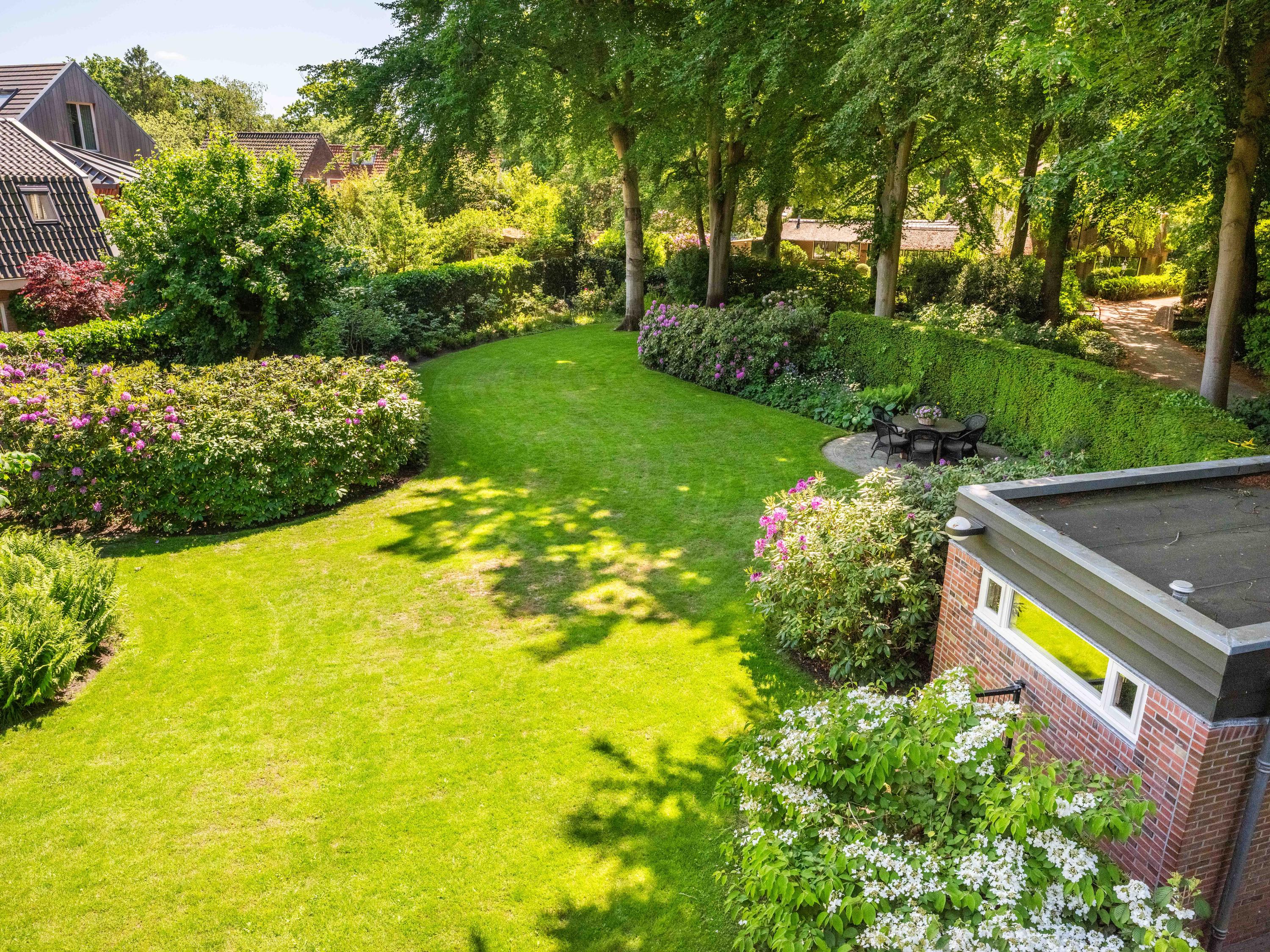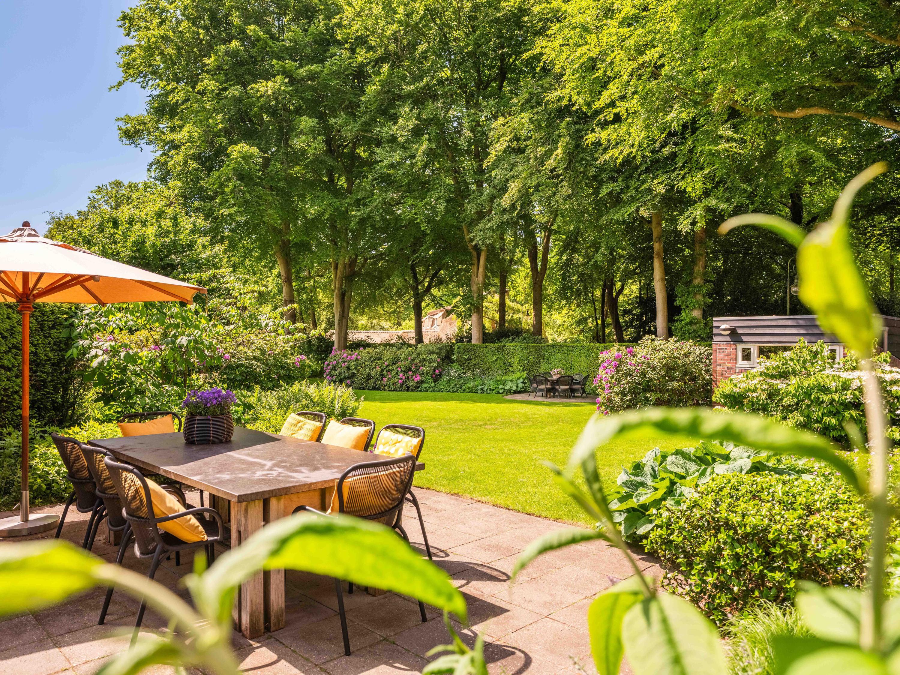 The beautiful park garden with privet hedges, flower beds and impressive trees surrounds the villa. Next to the villa is a fully insulated shed built in the same style, which can be used to store bicycles, garden equipment, etc. It also houses the central vacuum cleaning system and the pump and watering system for the garden.