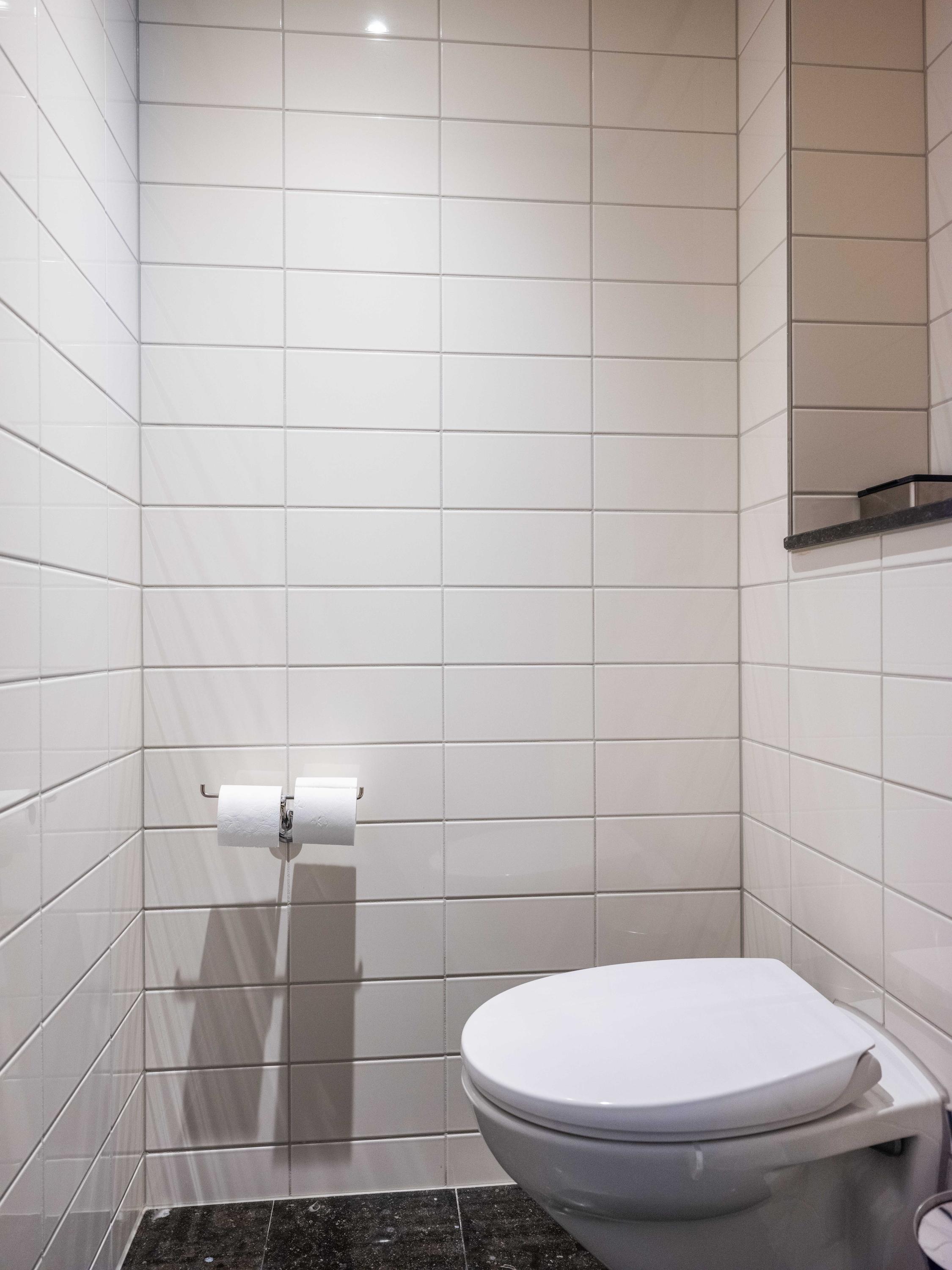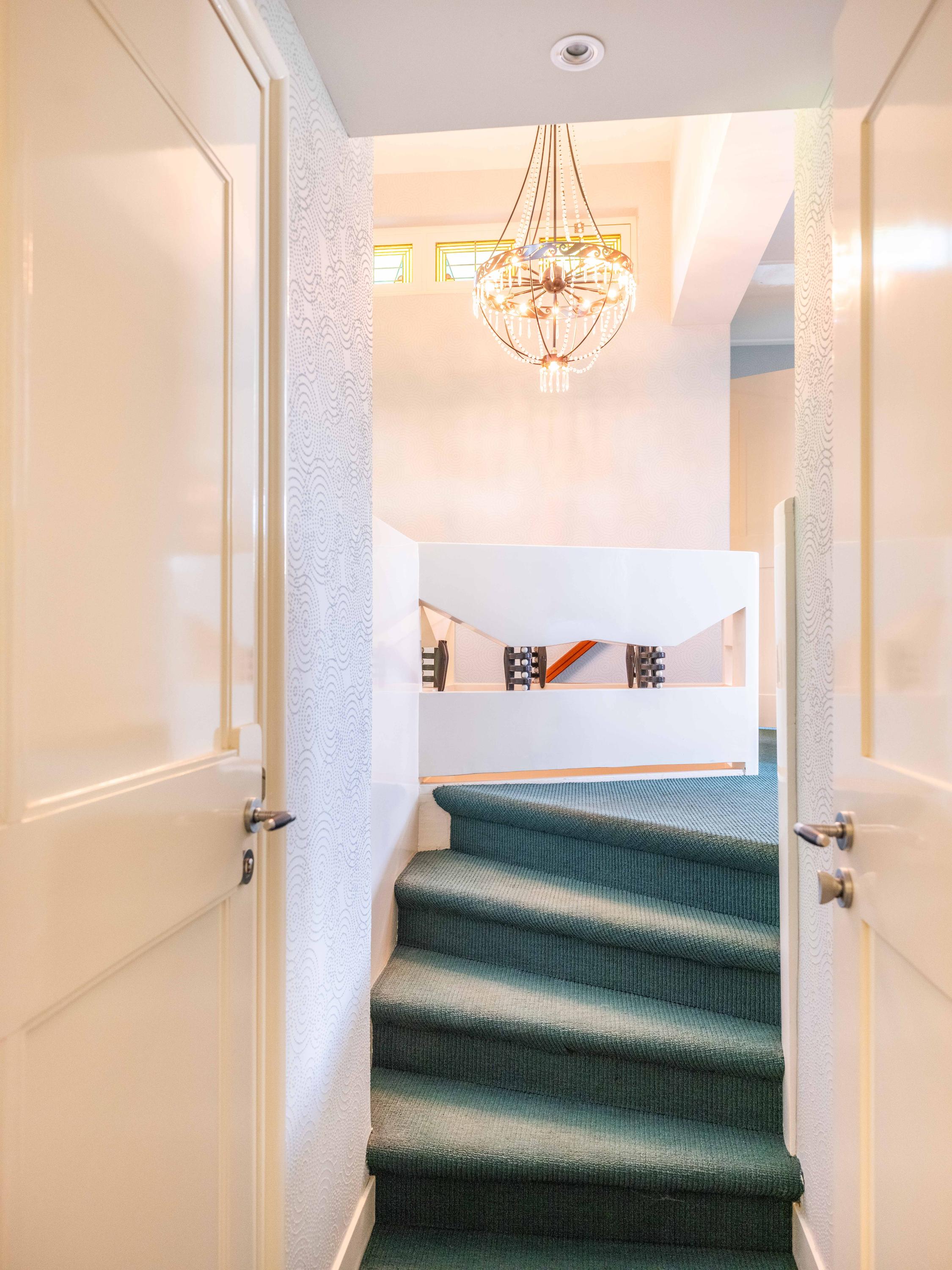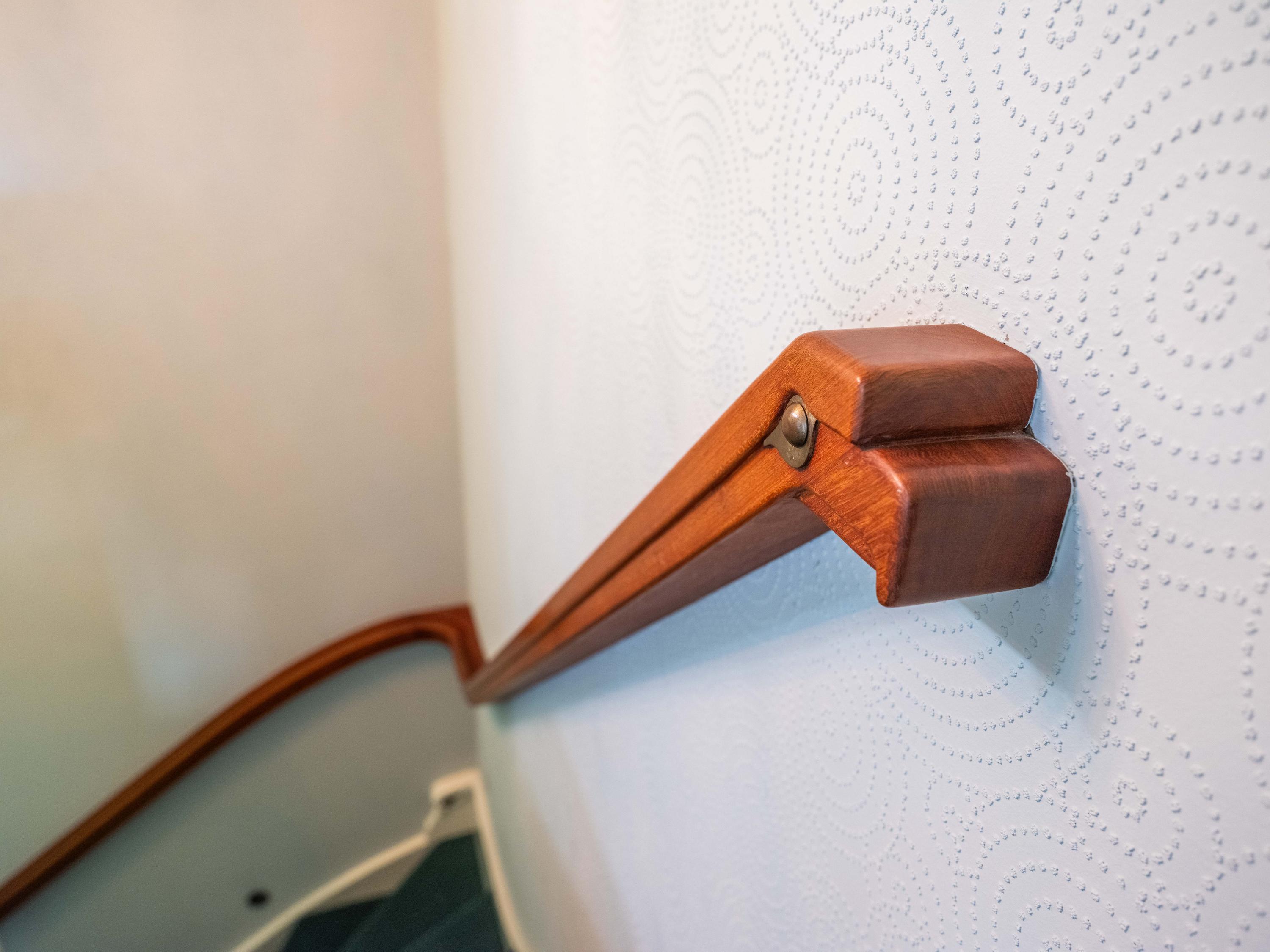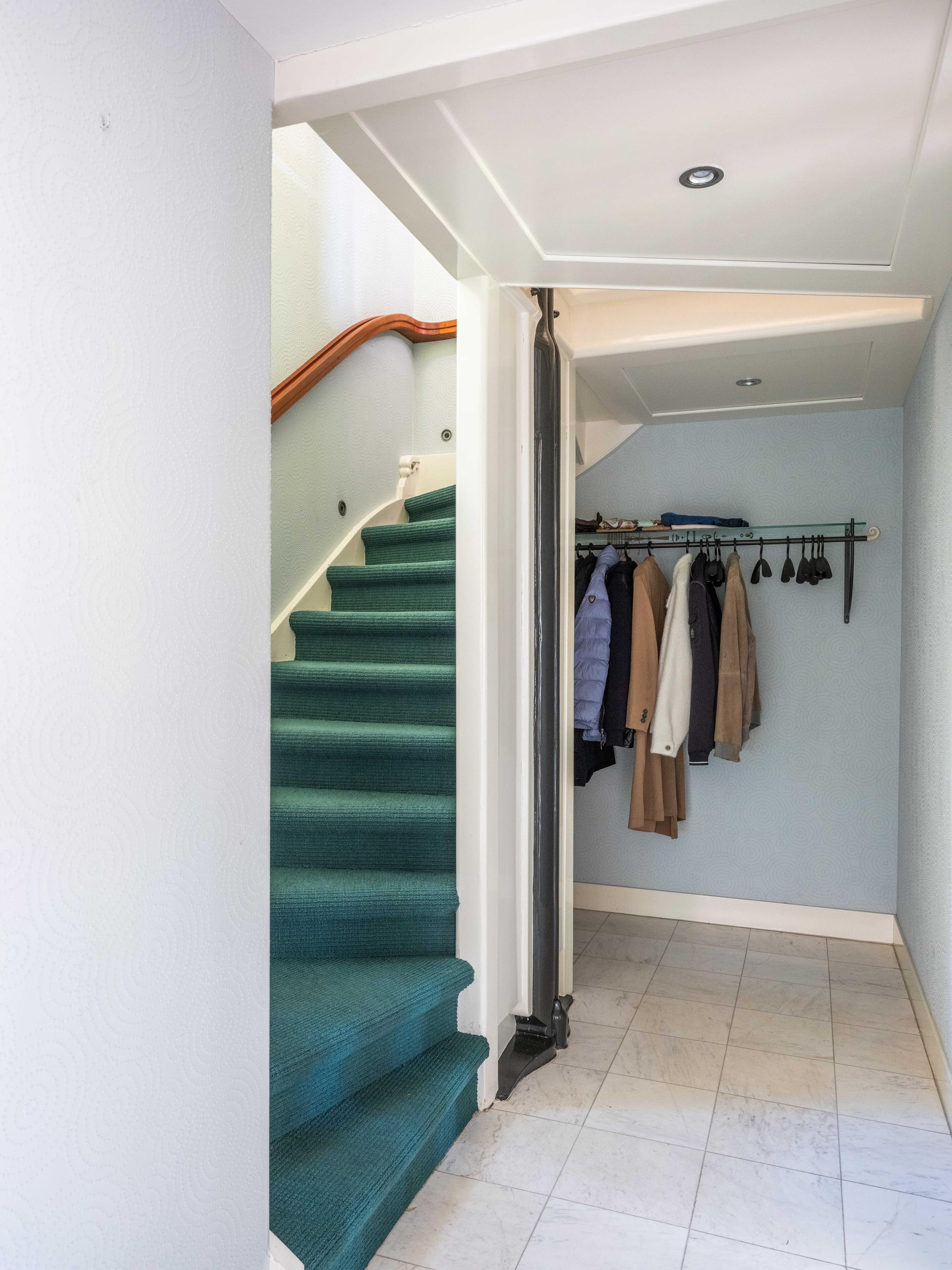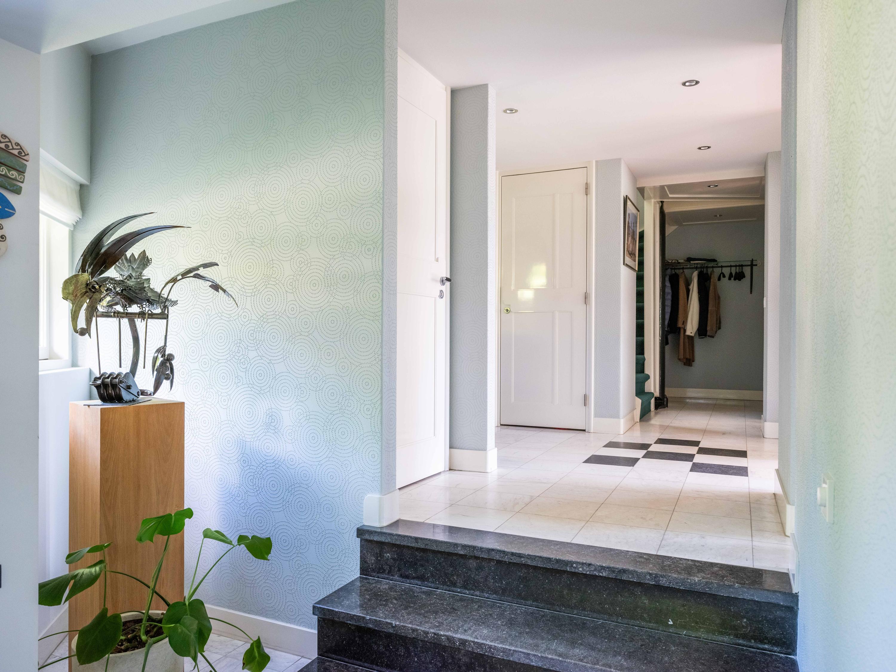 A winding path between beautifully shaped privet hedges leads to the hidden front door. Through the entrance, one enters the hall with a cloakroom, the stairs to the upper floor and a toilet.