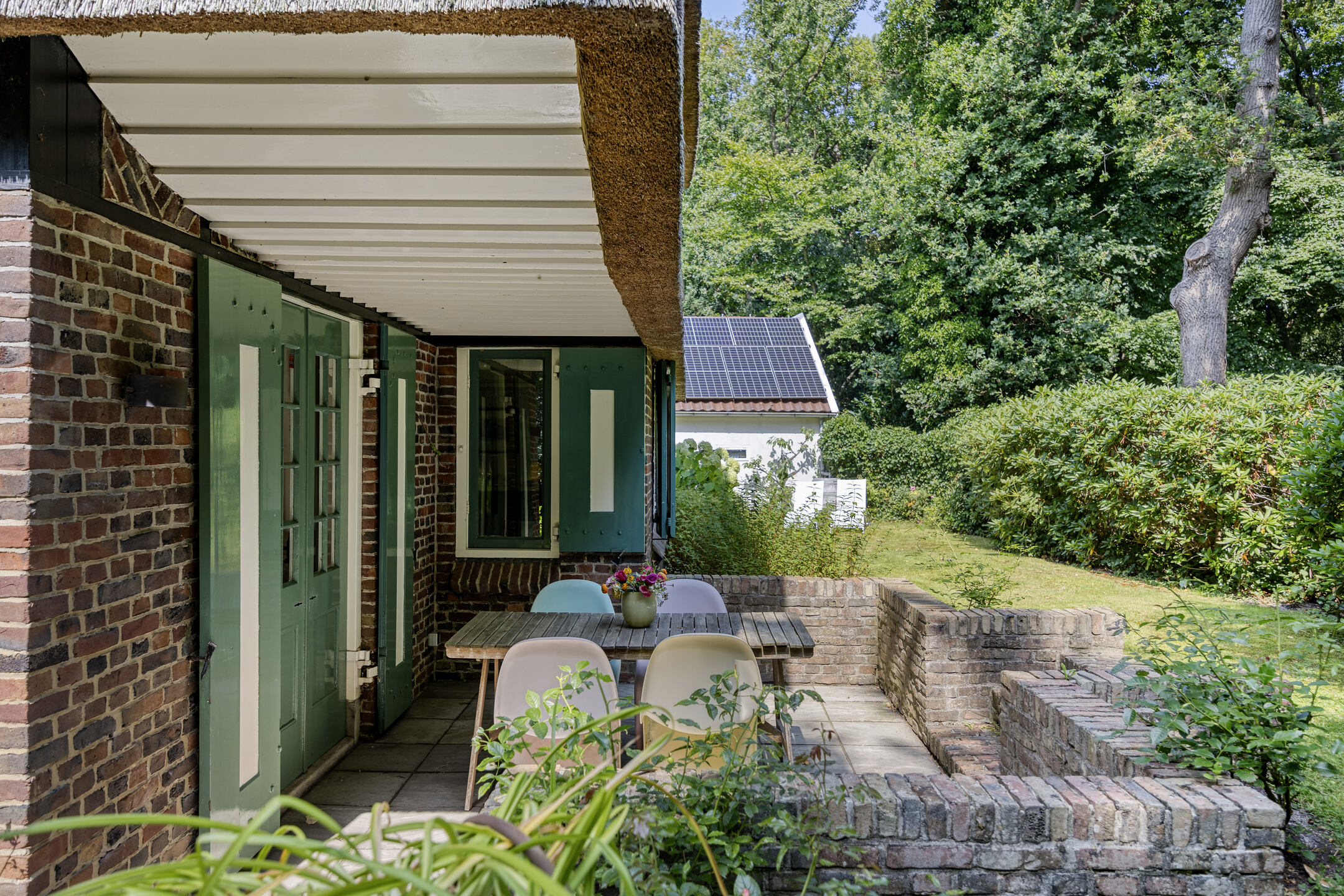 The villa is approached via a spacious driveway with room for several cars. At the front, the imposing thatched roof immediately catches the eye. From the entrance hall, you reach both the living room and the kitchen.