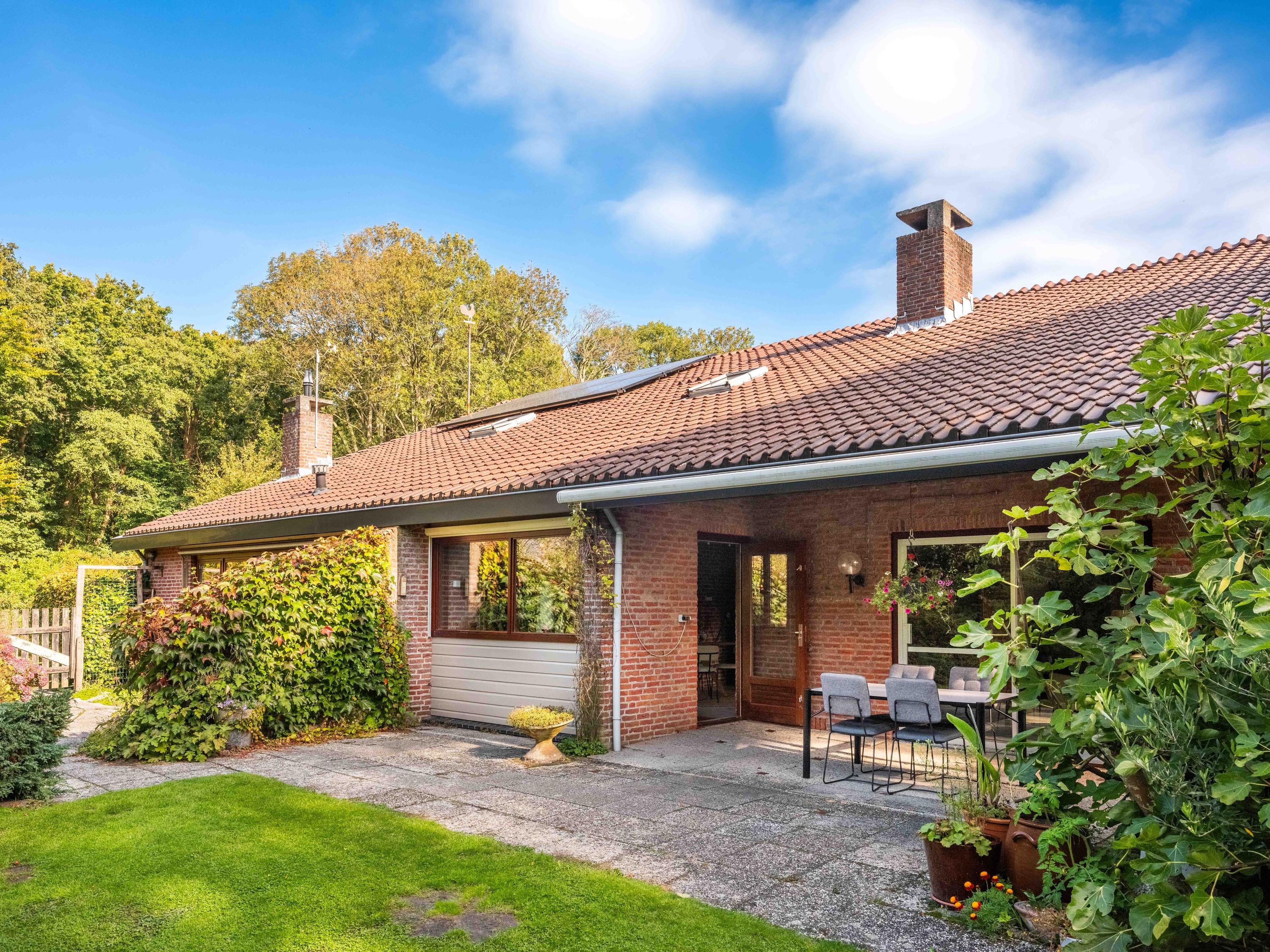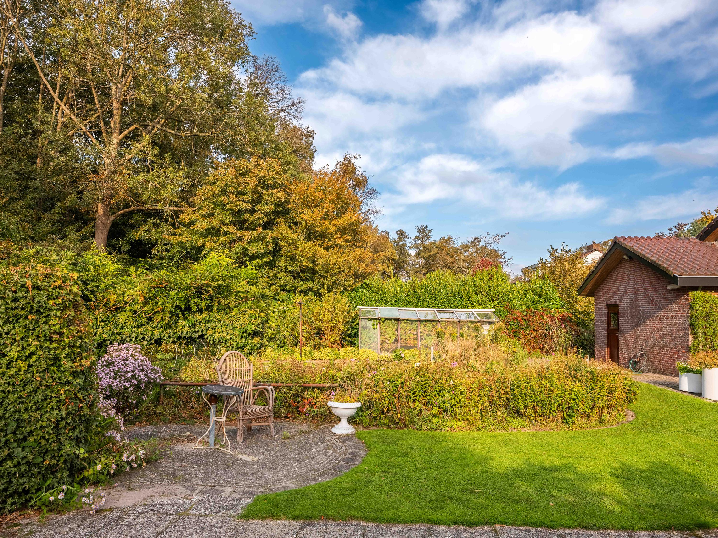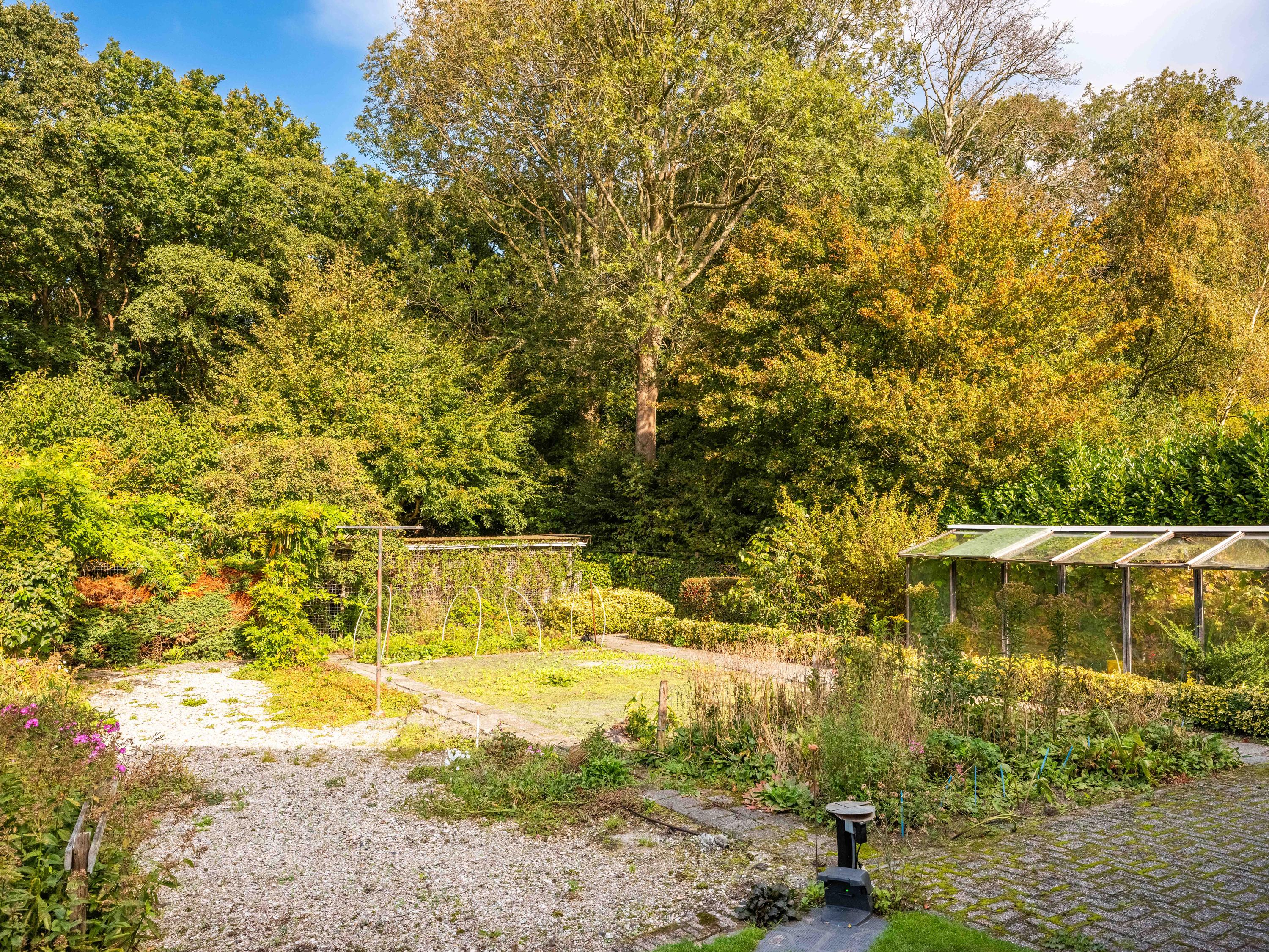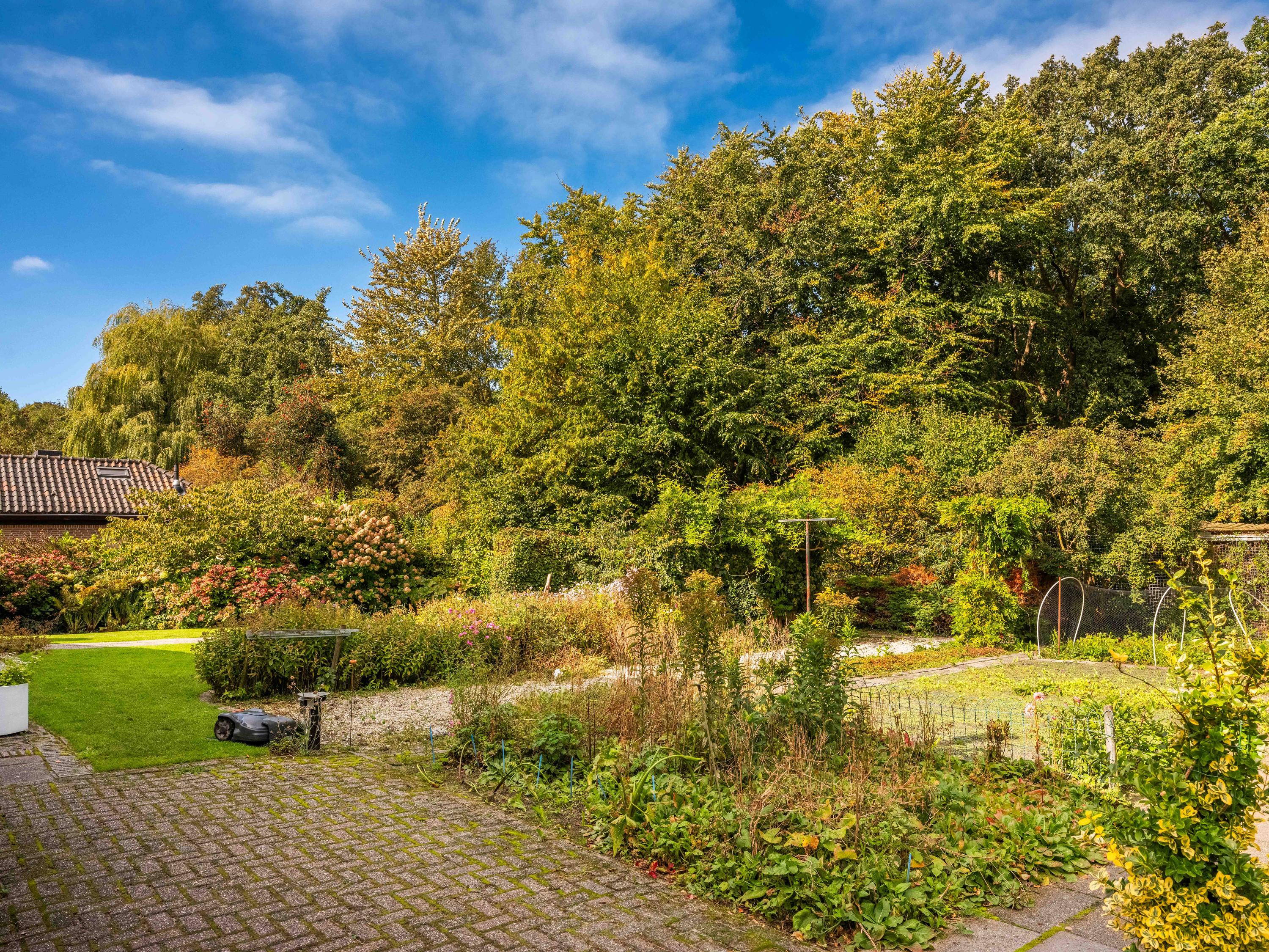 We would also like to mention a few extras. The large attached garage is accessible from inside and offers ample space for bicycles, cars or other items. Cars can also be easily parked on the property, as there is plenty of space. The garden has several terraces and offers plenty of sun and privacy. It has taken 43 years to turn it into a colourful whole. And there is a greenhouse! The surrounding garden offers plenty of sun and privacy. In terms of sustainability, we can report that there are already 8 solar panels, wall insulation and mostly double glazing (energy label C). The wine cellar is also a charming extra.