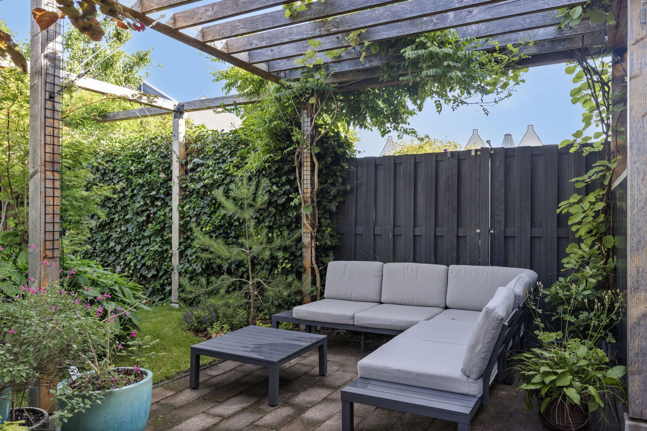 The beautifully landscaped backyard, facing northwest, is ideal for enjoying the afternoon and evening sun.