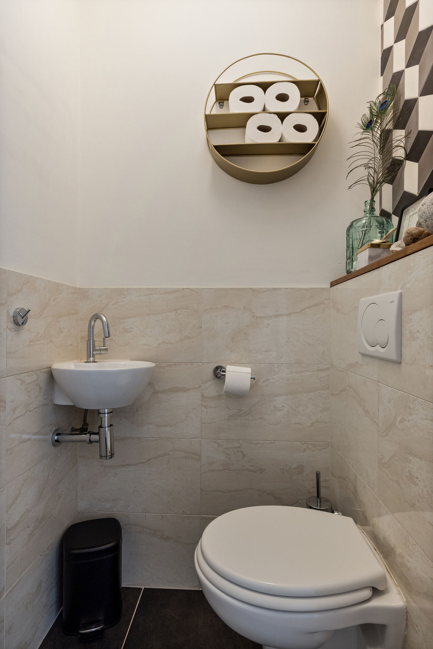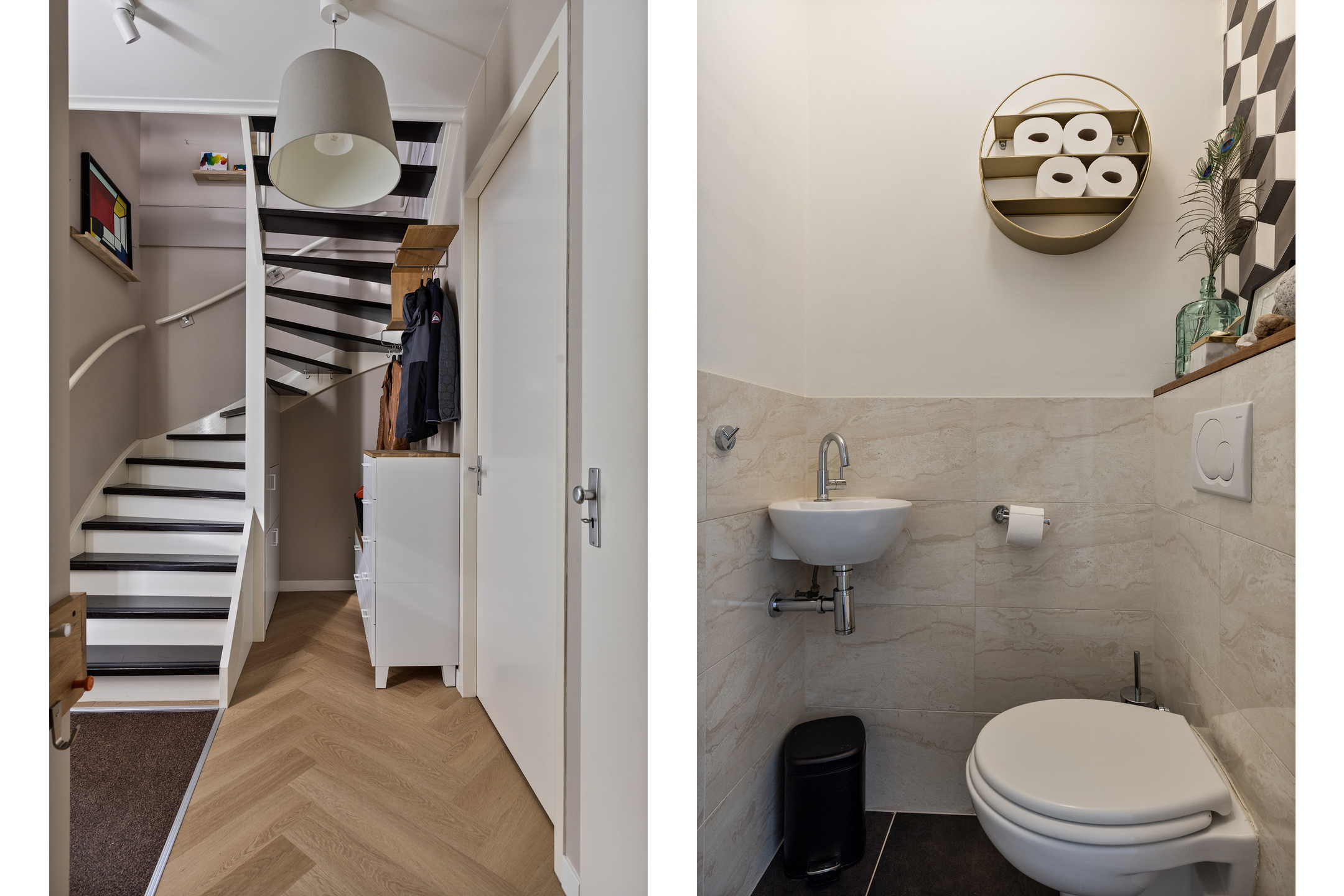 Entrance hall with a modern toilet (including washbasin), storage space, staircase to the first floor, and access to the living room with open kitchen.