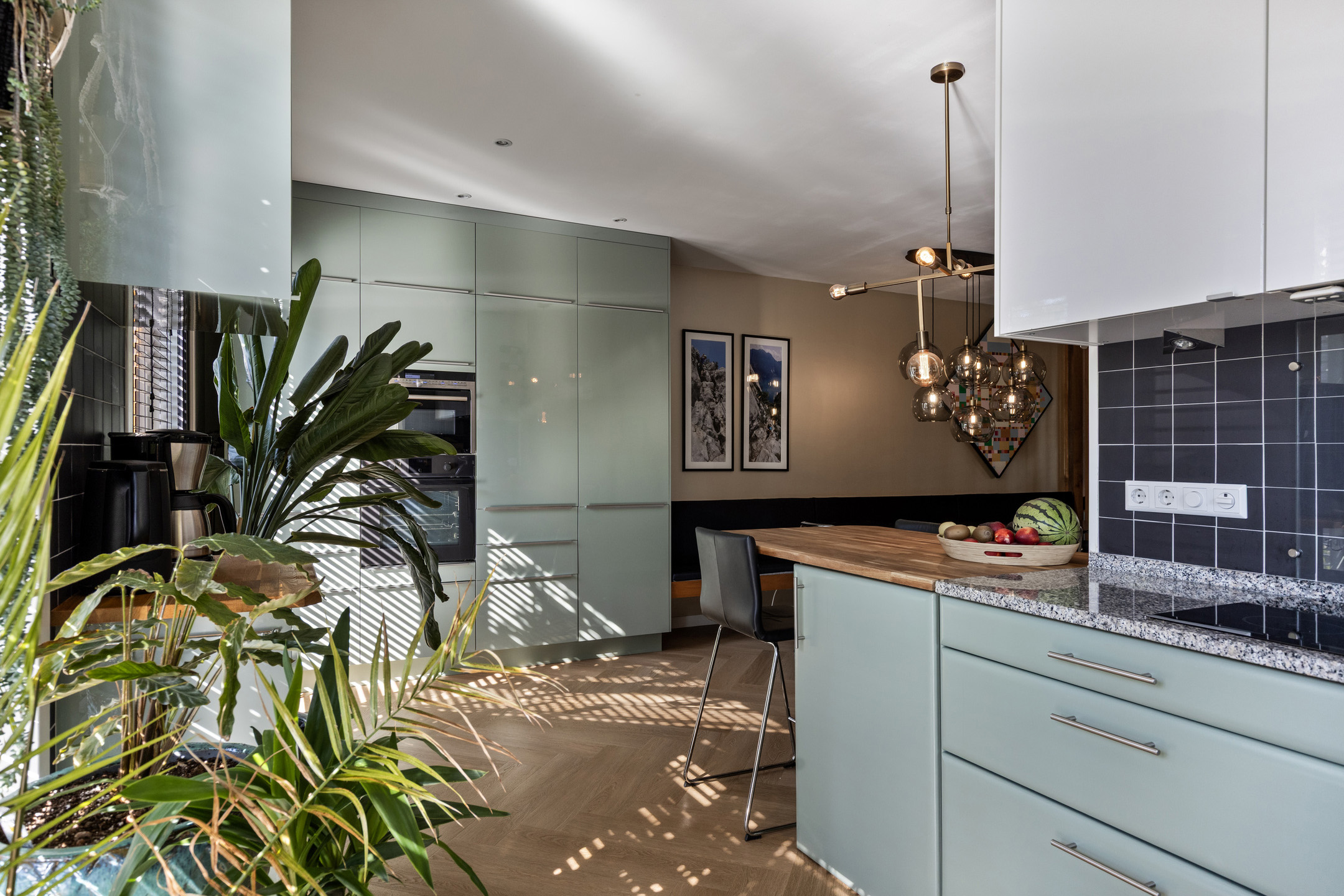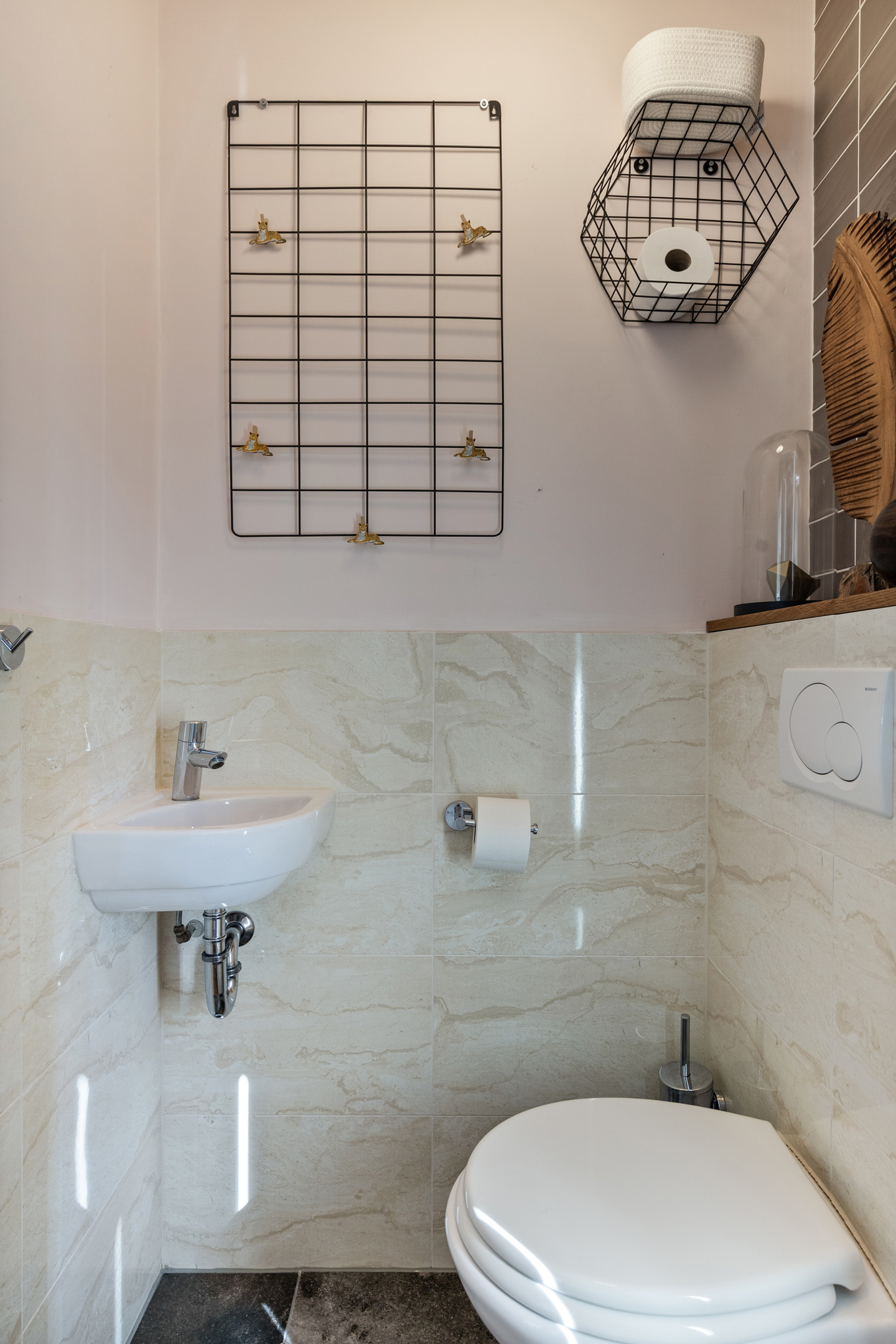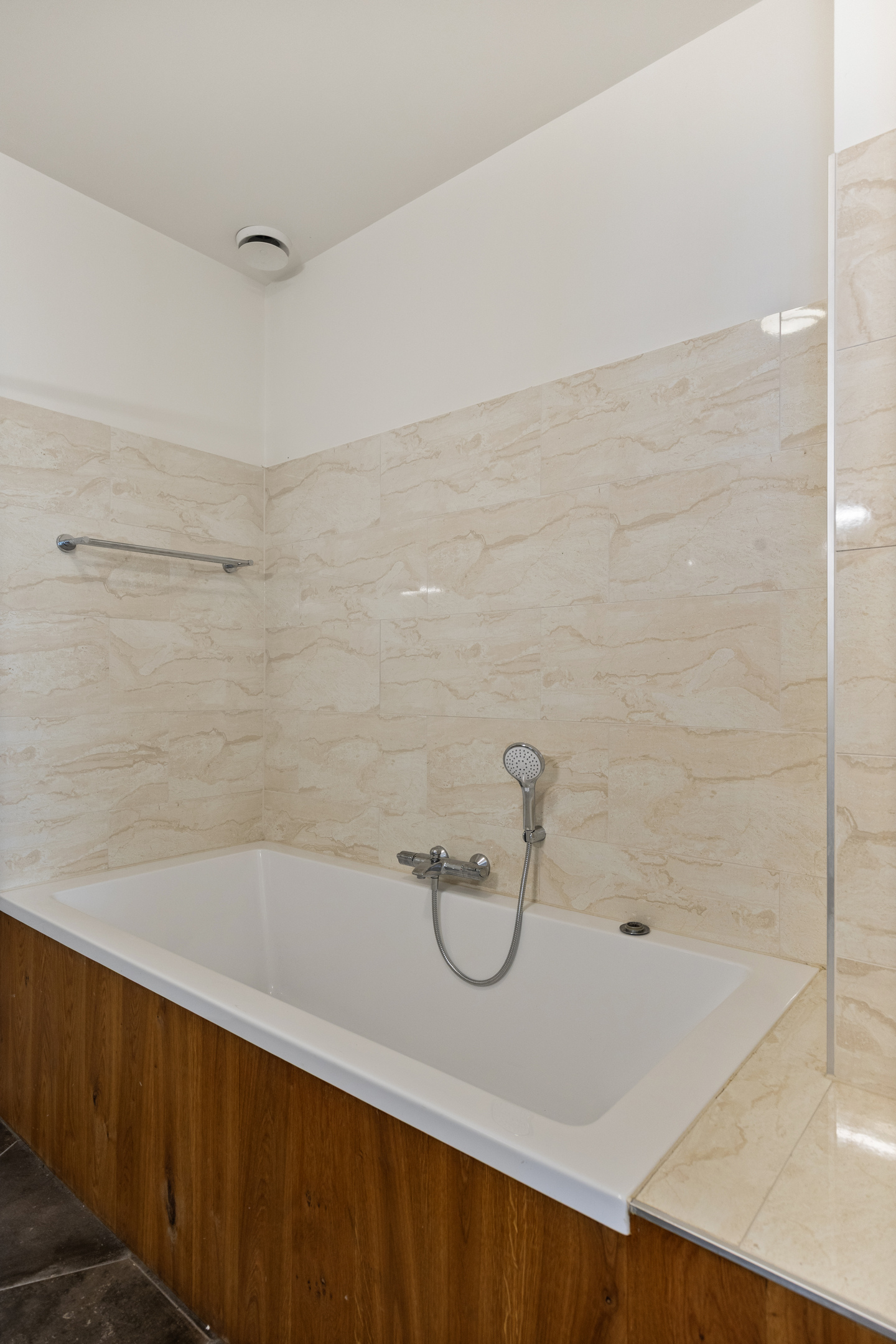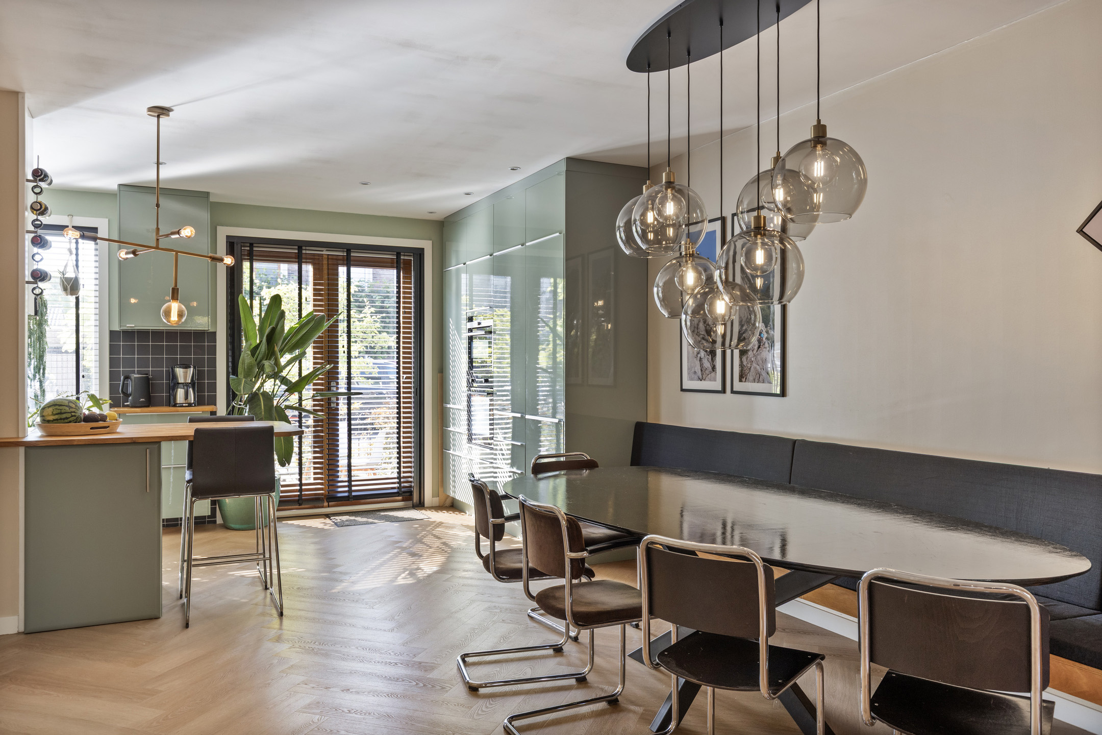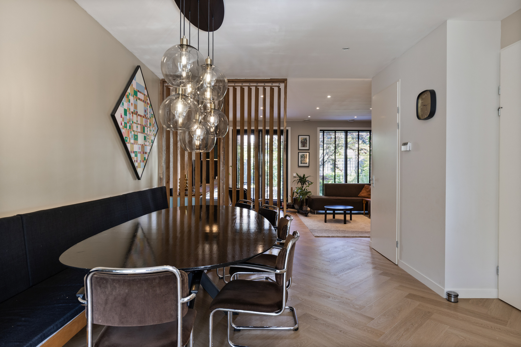 The ground floor is finished with an elegant herringbone PVC floor and features comfortable underfloor heating.