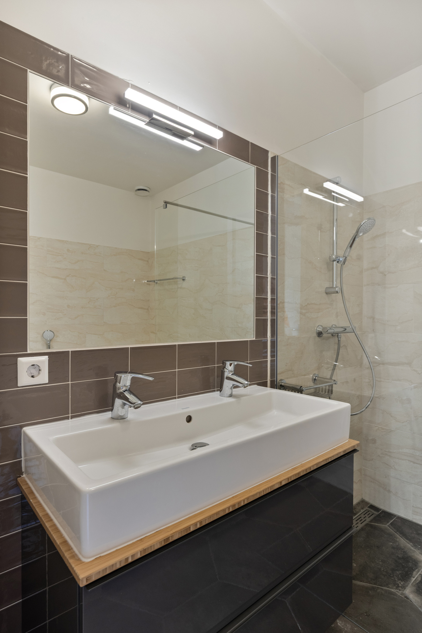 The modern bathroom is equipped with a walk-in shower, washbasin with vanity unit, and bathtub.