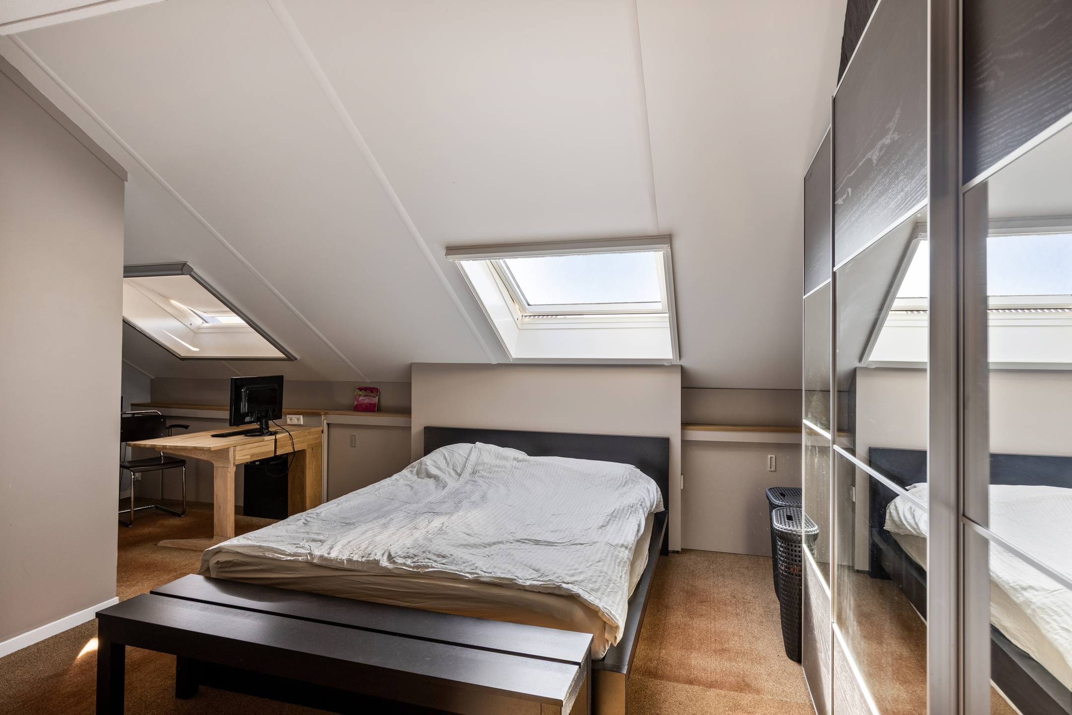 Bedroom 3, located at the front, features two Velux skylights and a built-in closet housing the central heating system. This room also benefits from its own bathroom with a walk-in shower and washbasin unit.