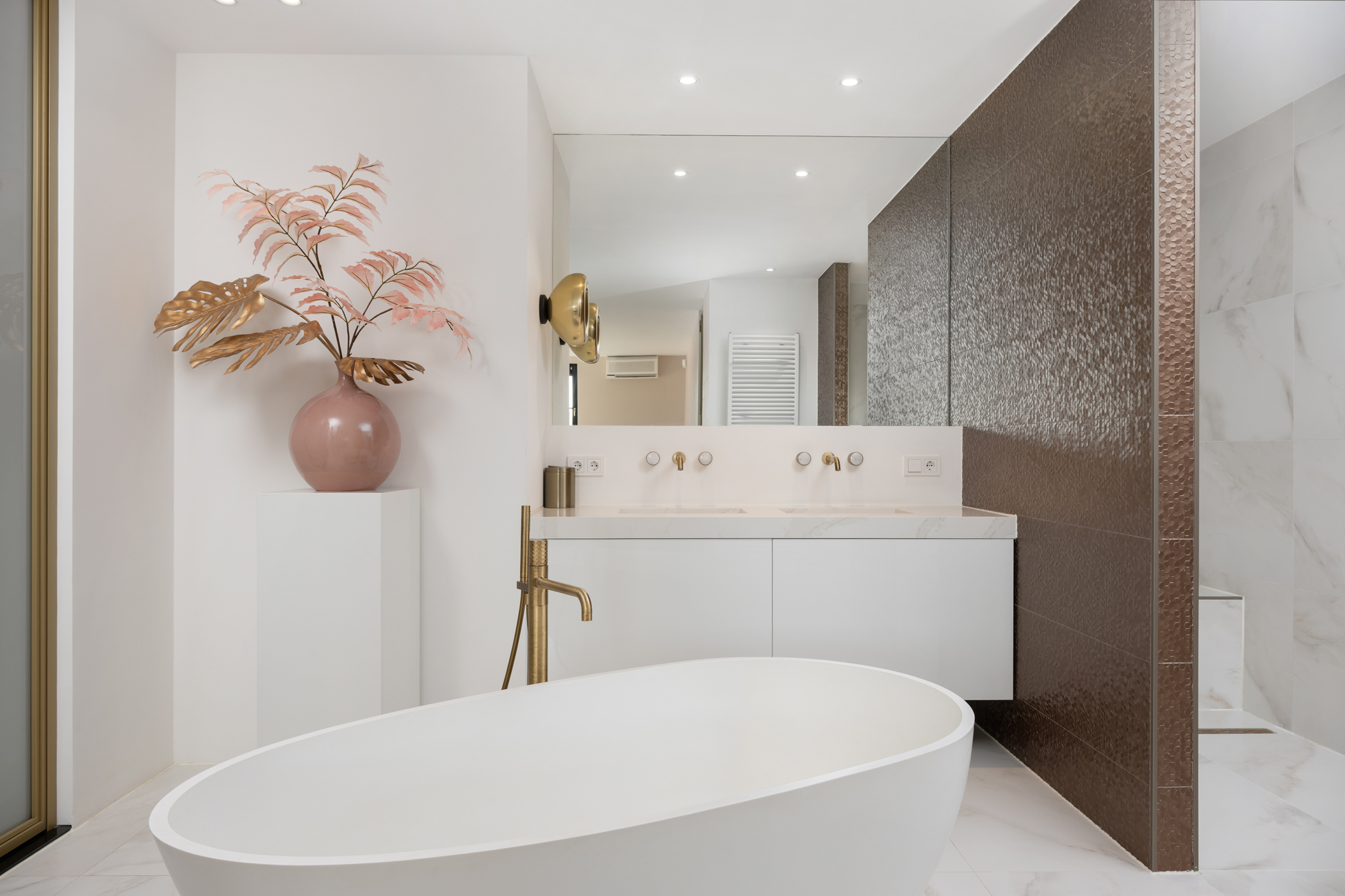 The master bedroom on the ground floor features a modern ensuite bathroom with bathtub, double washbasin, shower, and toilet. The bedroom is equipped with air conditioning, carpet flooring, and a walk-in closet, and also provides direct access to the terrace through sliding doors.
