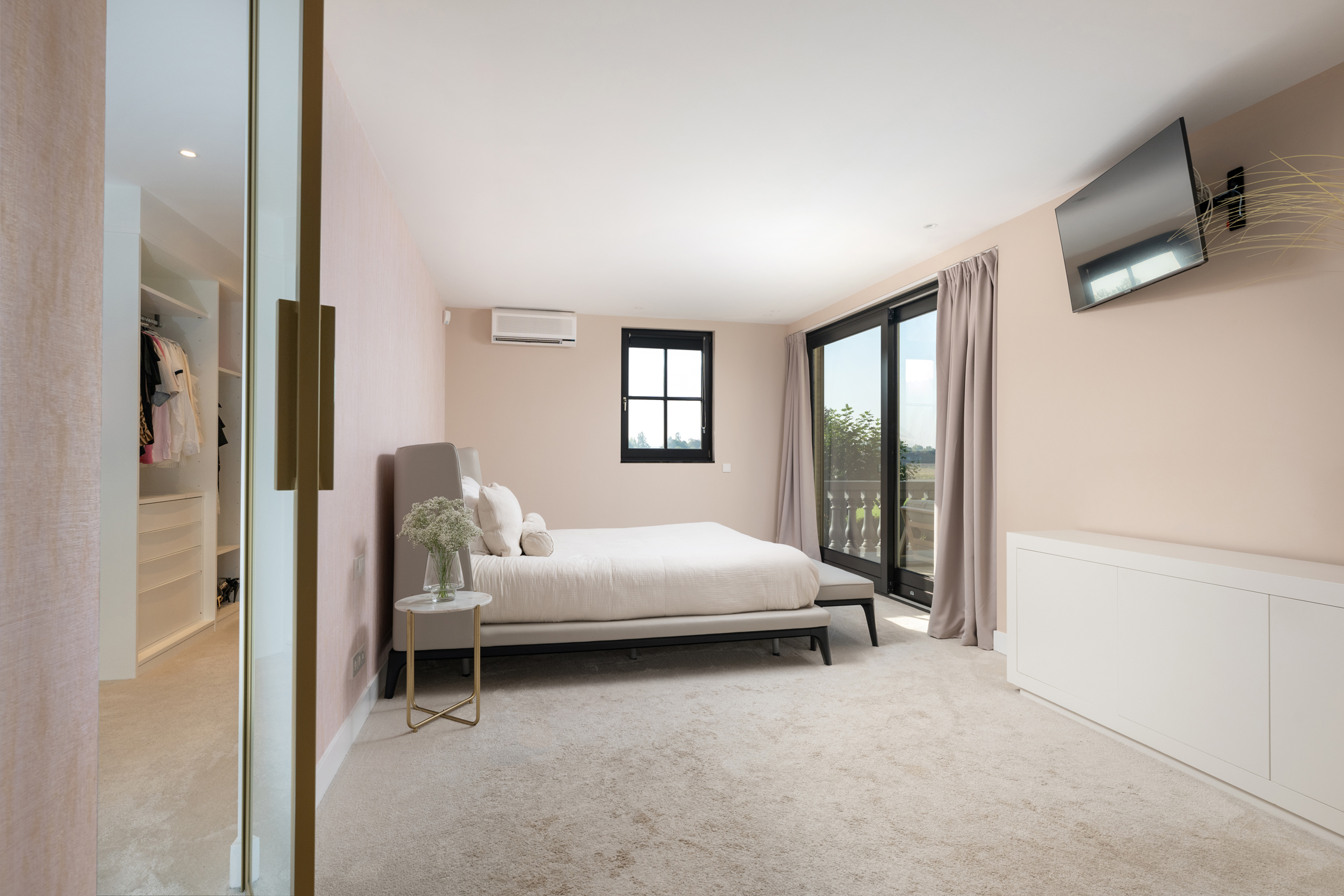 Through French doors, you enter the wellness area, which includes a technical room, pantry, sauna, toilet, and a luxurious indoor swimming pool. Sliding doors from the wellness area lead to the rear garden and the detached garage, which has a hobby greenhouse attached to the back.
