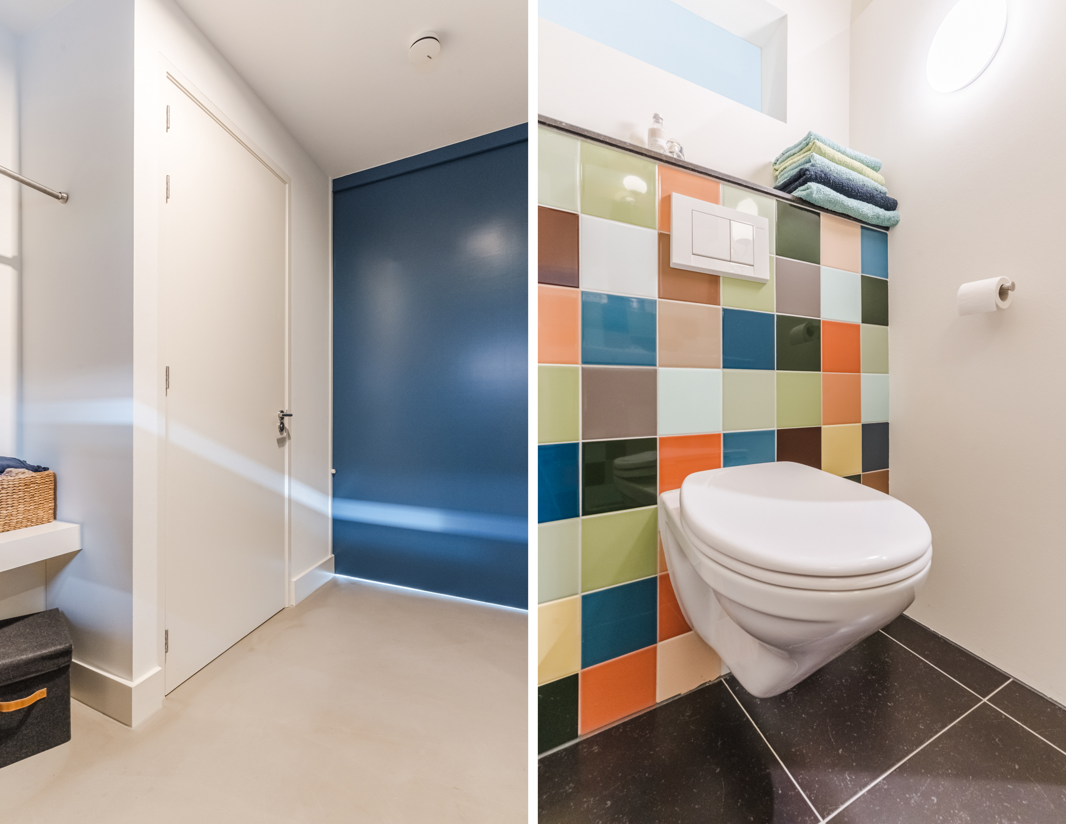 With plastered and partially tiled walls, plastered ceiling with recessed lighting, floating toilet and washbasin.