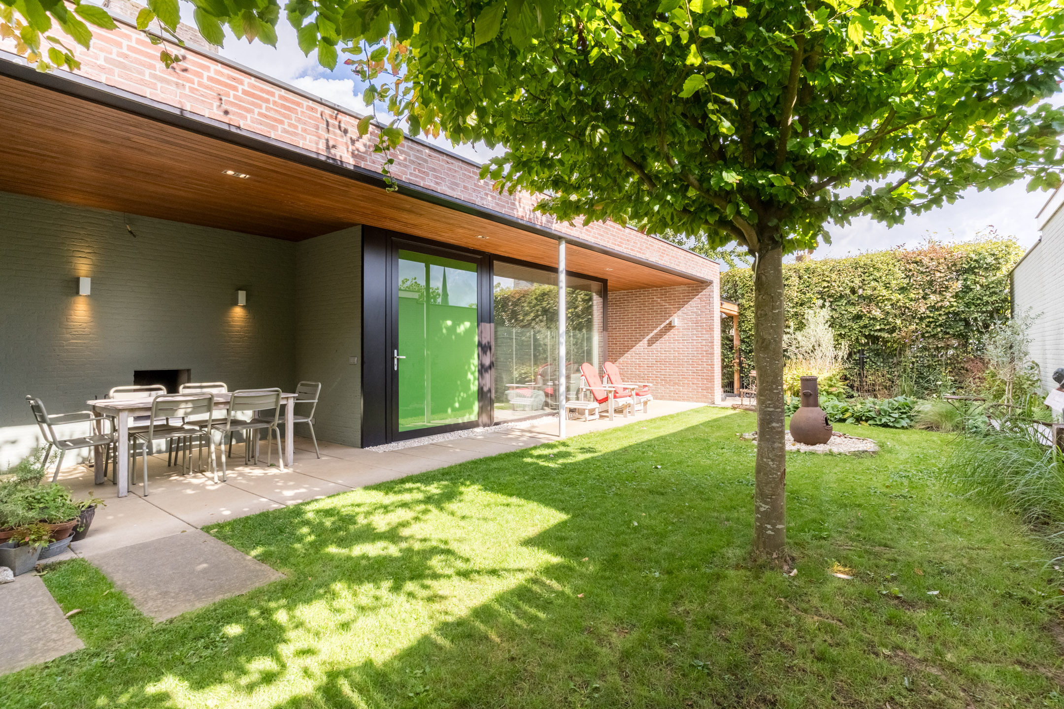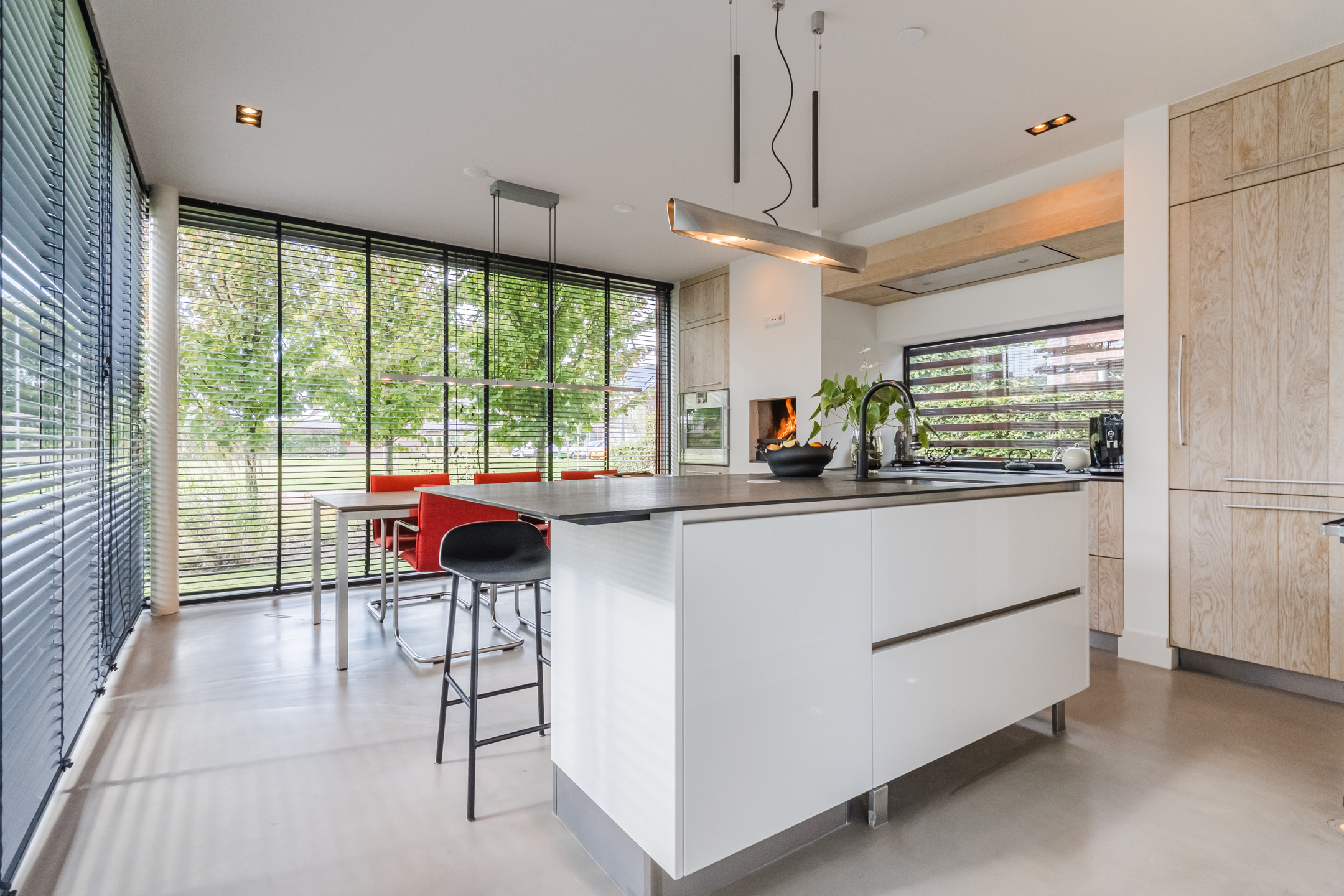 The home is modern, bold, and architect-designed (by JMW Architects). The layout creates a loft-like feel, with open flowing spaces and seamless indoor-outdoor connections thanks to the extensive glass facades throughout. Comfort is also maximized — this home offers a pleasant indoor climate year-round, thanks to a ground-source heat pump and electric sunshades. The pump provides cooling via underfloor systems in summer and heating in winter.