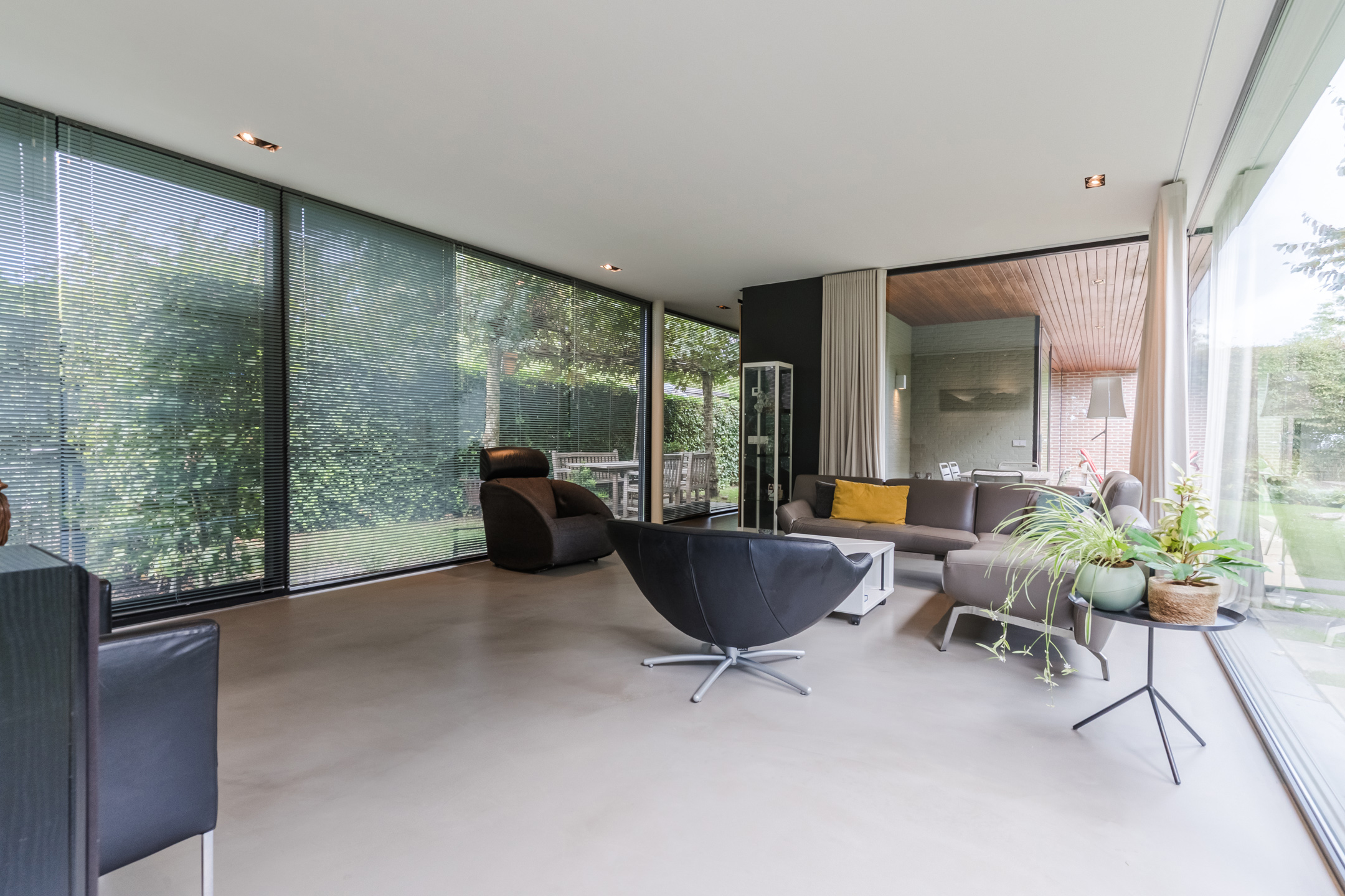 Approx. 30 m², with designer concrete floor, plastered and concrete walls, plastered ceiling with recessed lighting, two sliding doors to the front and side garden, and two full-width glass facades with electric sun screens on the southeast side.