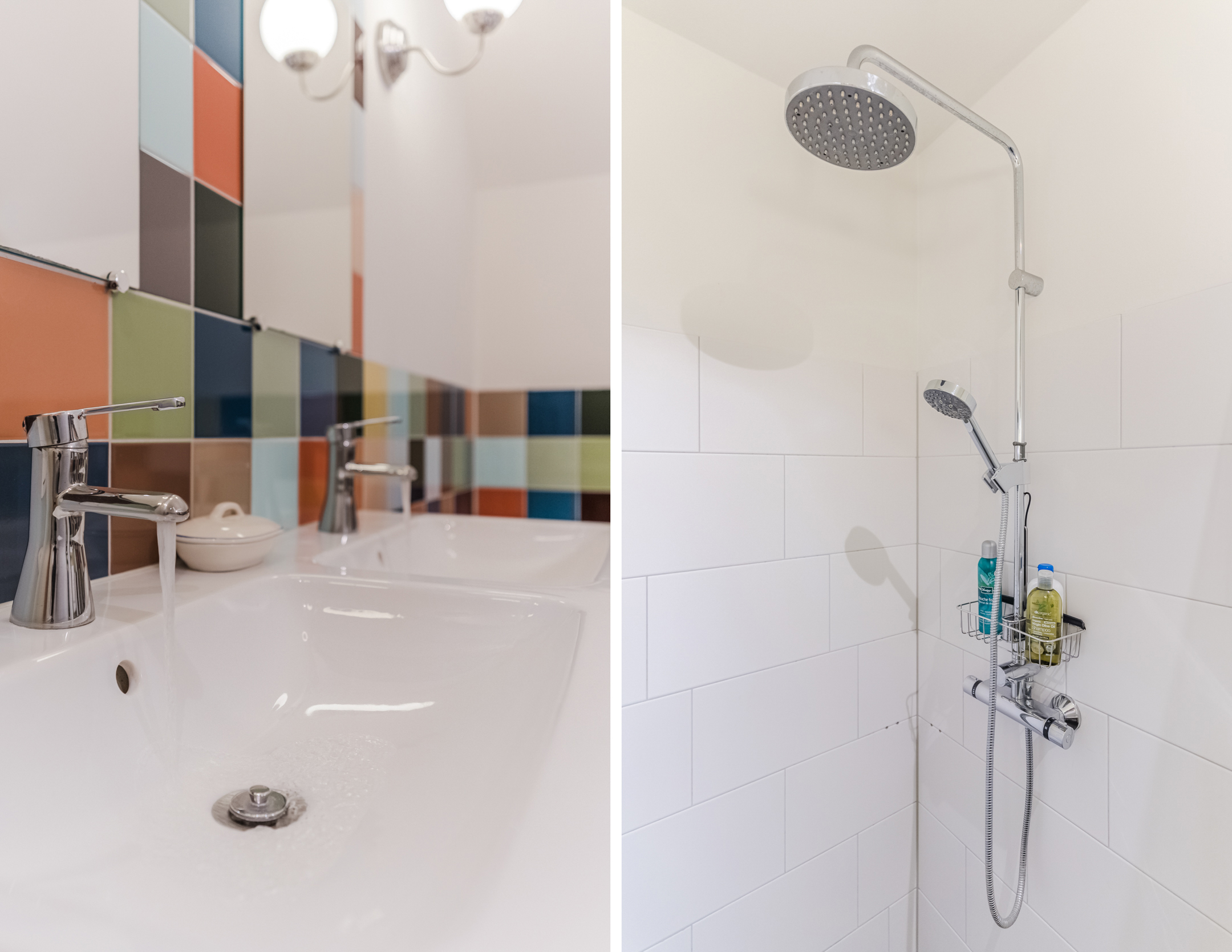 Approx. 3.5 m², with tiled floor, plastered and partially tiled walls, plastered ceiling, walk-in shower with thermostatic tap, and double washbasin.