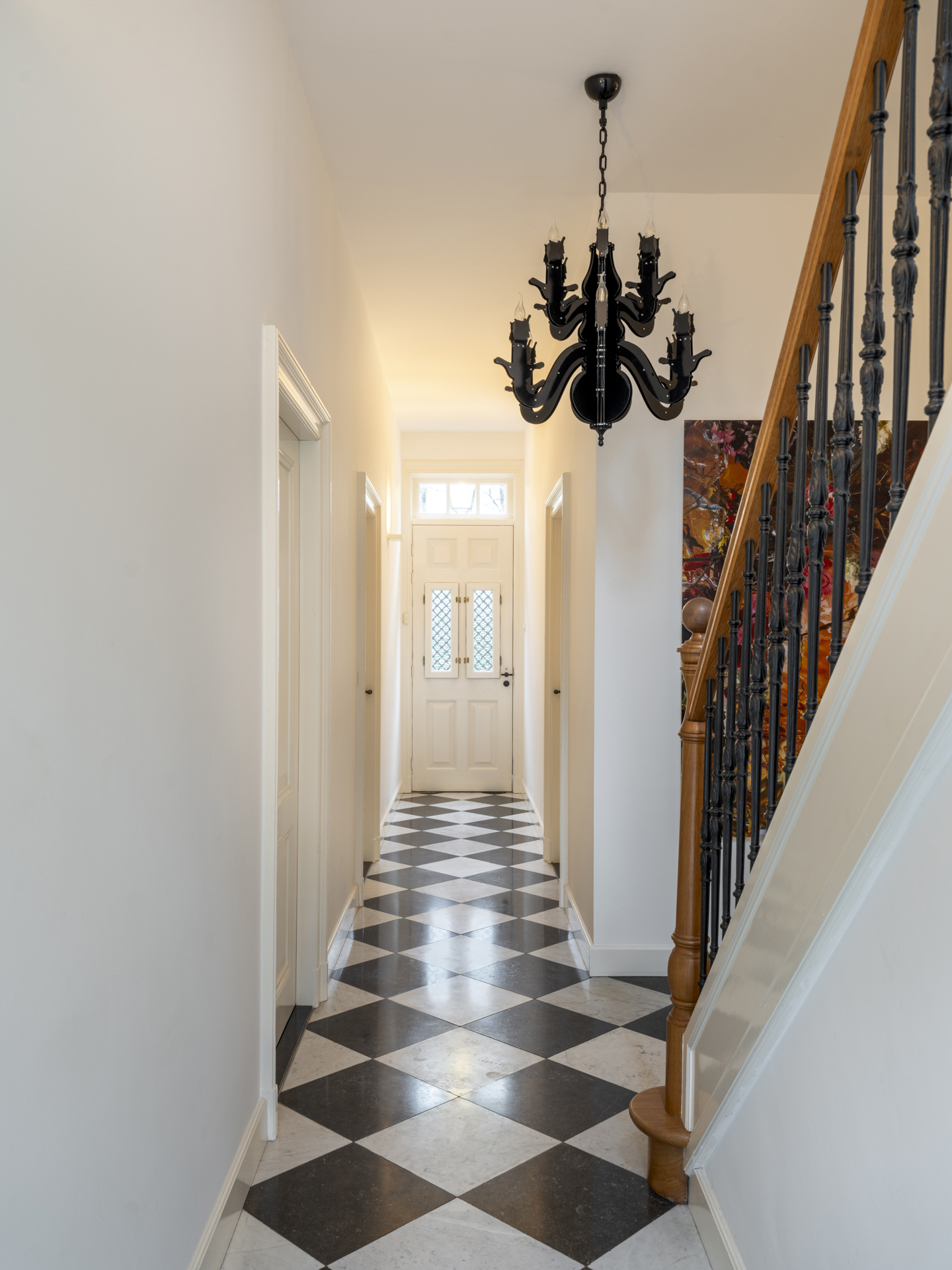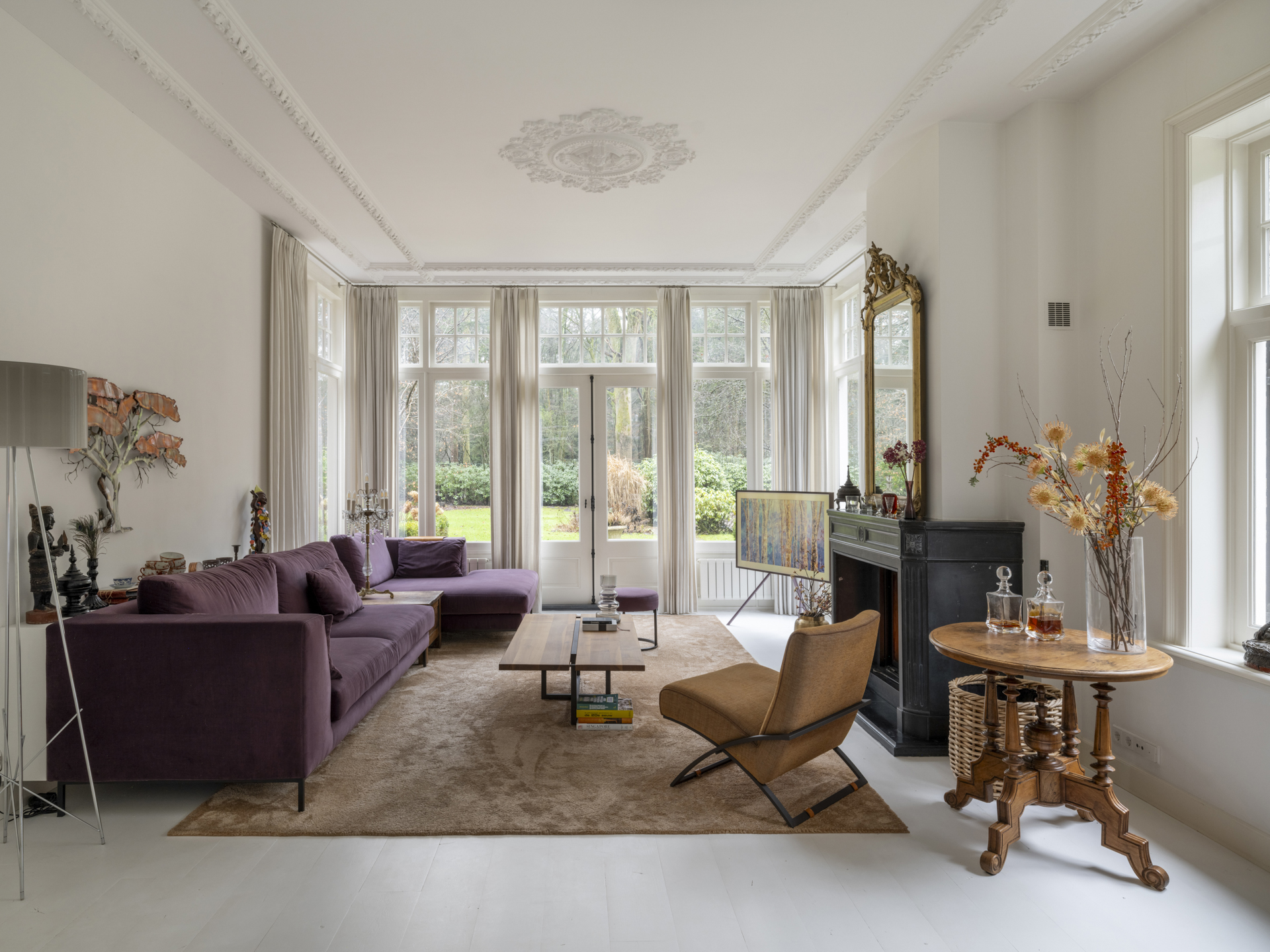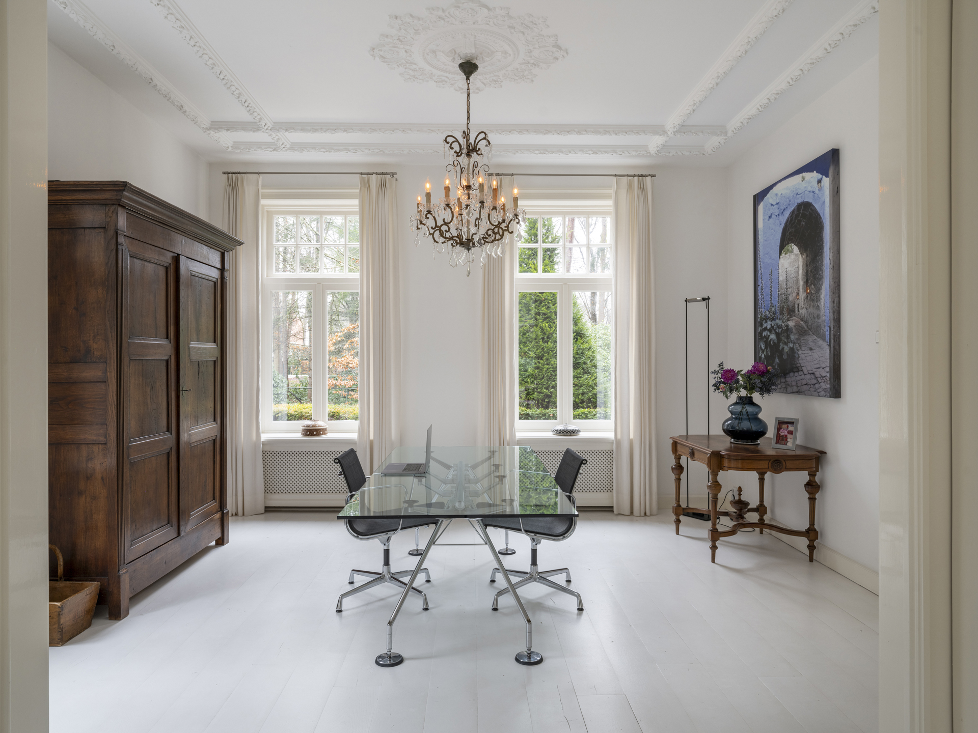 The entire first floor, except the bathrooms, has white-lacquered oak floors, and all rooms have plastered ceilings with elegant moldings.