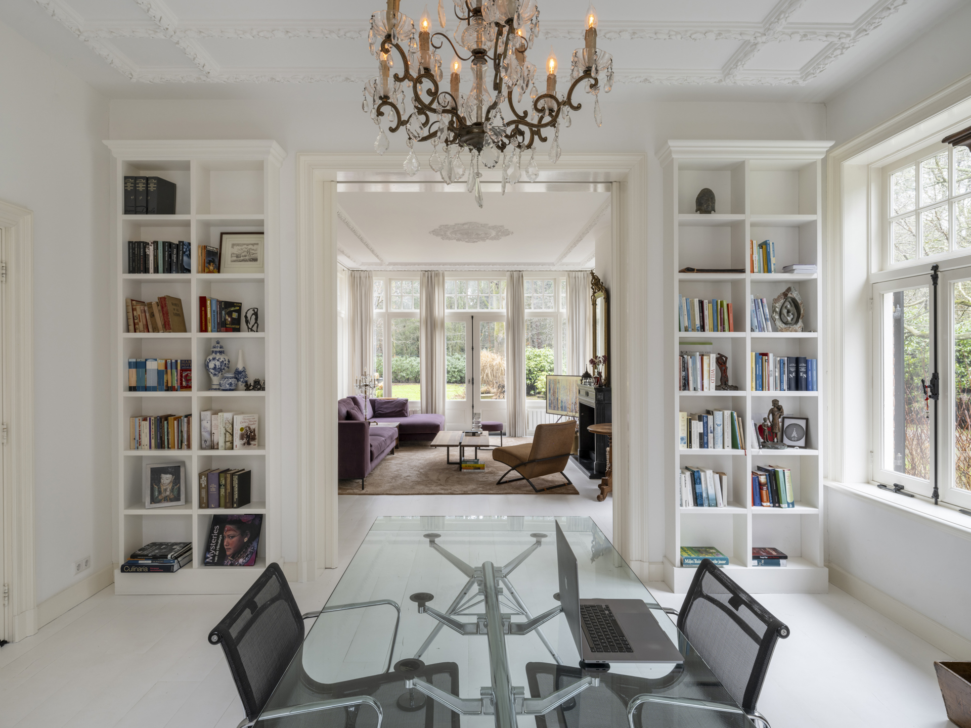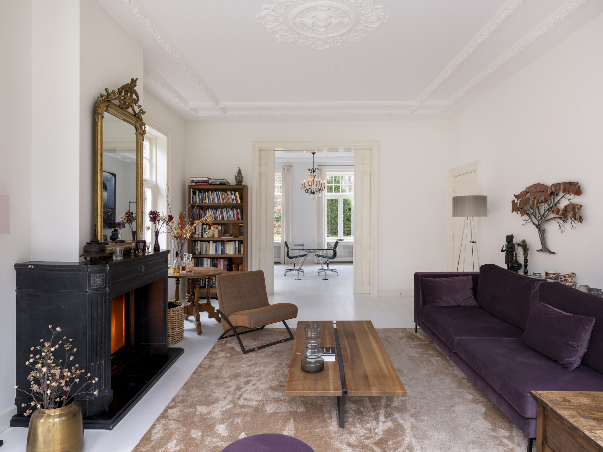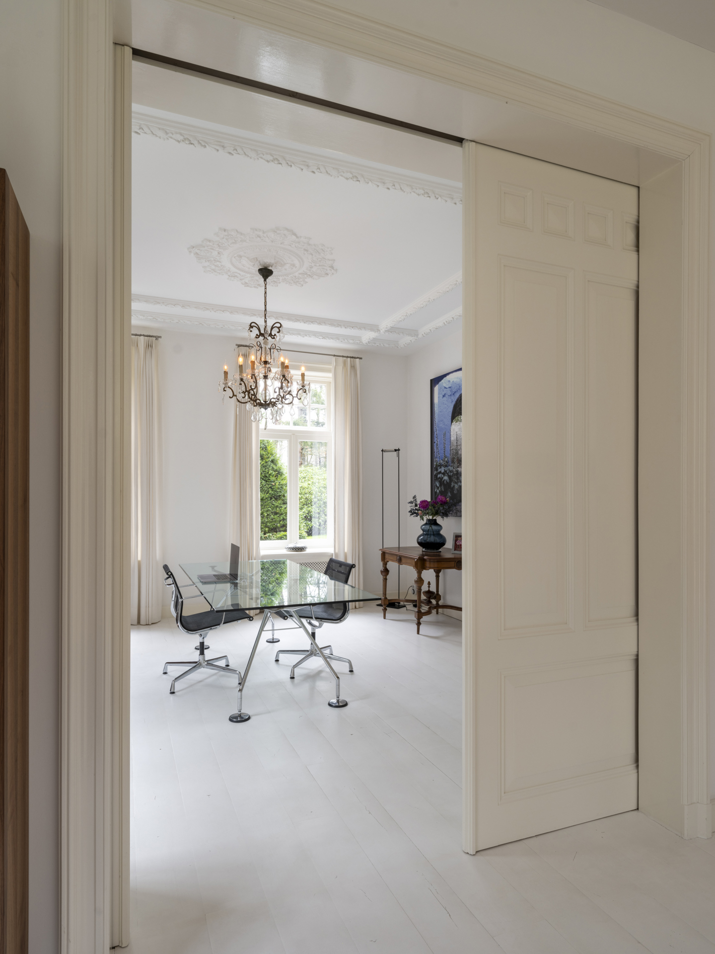 To the right of the hallway is the atmospheric, light-filled living room. This space is divided into two areas by tall ensuite doors. Both rooms have high ceilings with classic ornamental details and white-lacquered oak flooring.