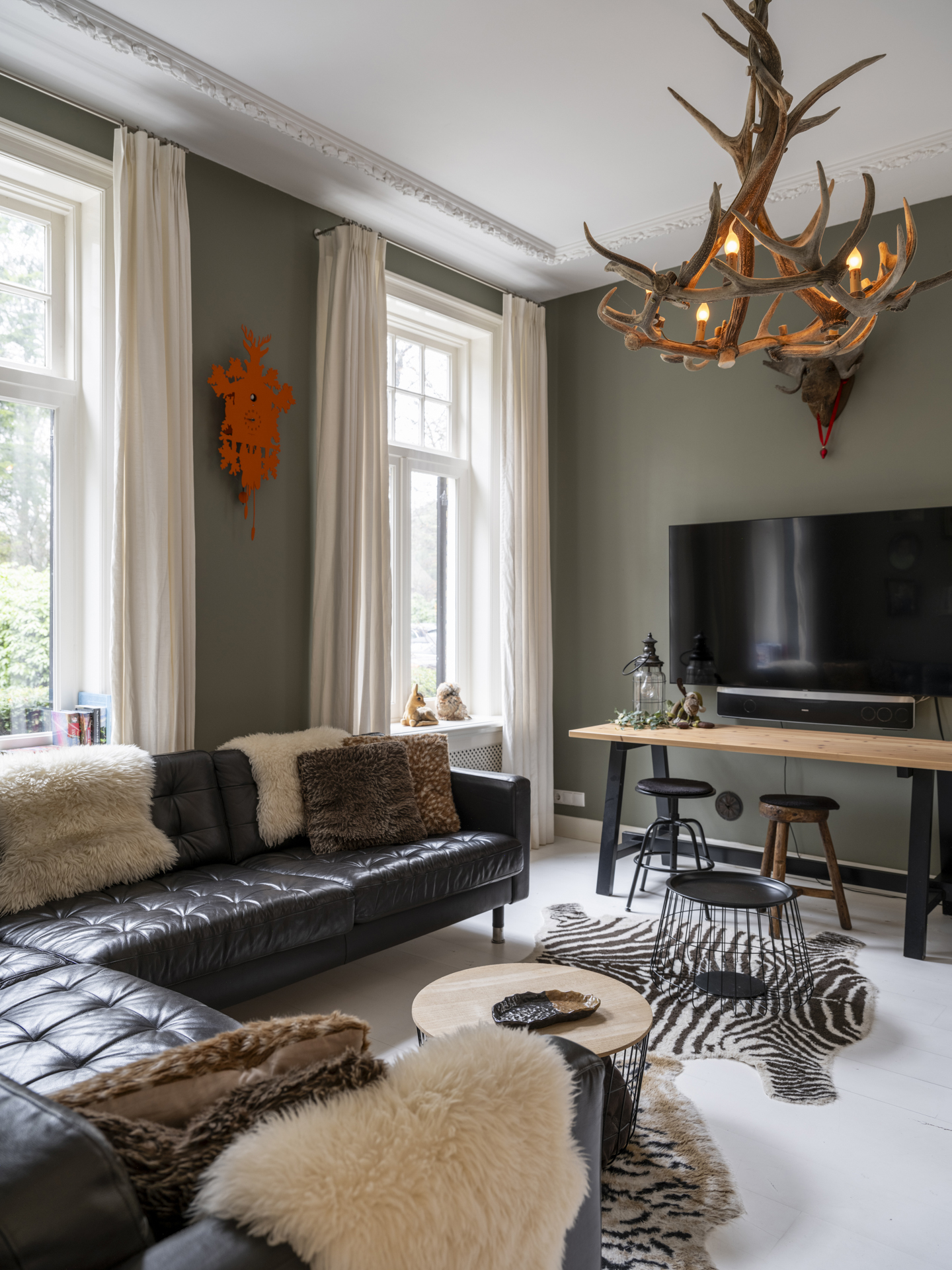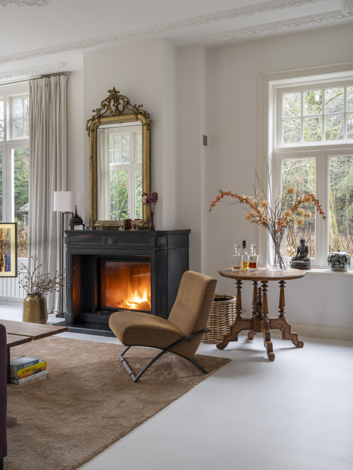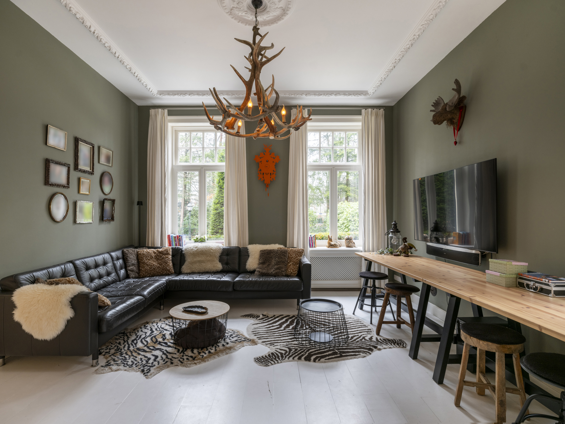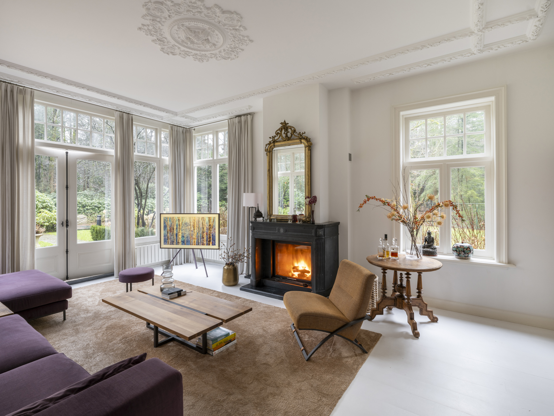To the right of the hallway is the atmospheric, light-filled living room. This space is divided into two areas by tall ensuite doors. Both rooms have high ceilings with classic ornamental details and white-lacquered oak flooring.