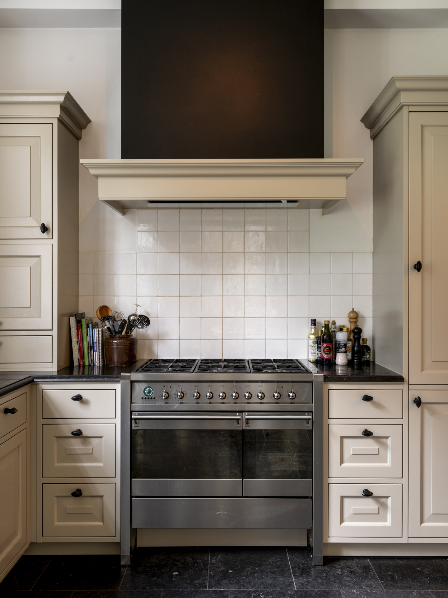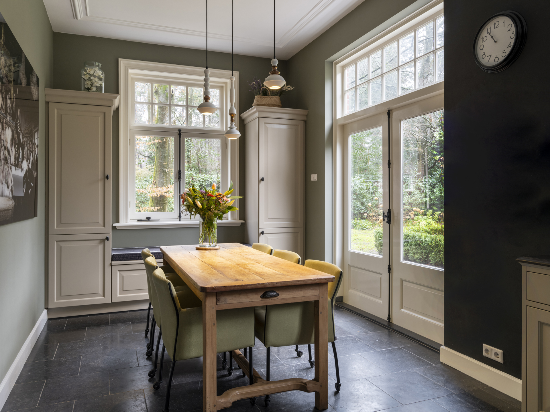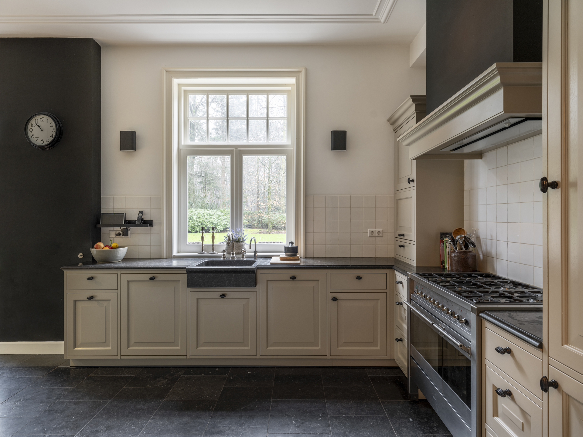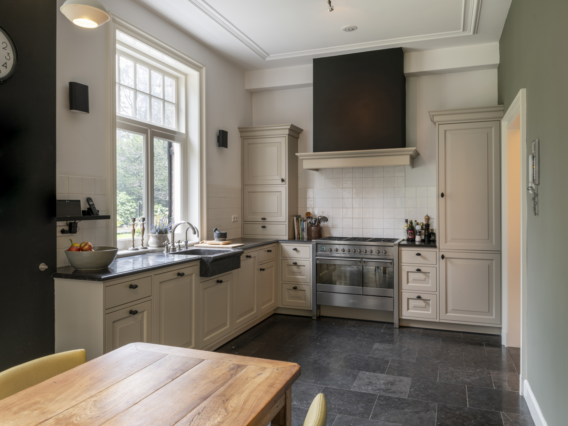 The spacious, cozy kitchen-diner at the rear of the house enjoys ample sunlight and is a pleasant space. The L-shaped kitchen features a natural stone (Belgian bluestone) countertop with sink, dishwasher, a 90 cm-wide 6-burner gas stove with two ovens, a hood built into a mantle, refrigerator, freezer, and plenty of cupboard and drawer space.