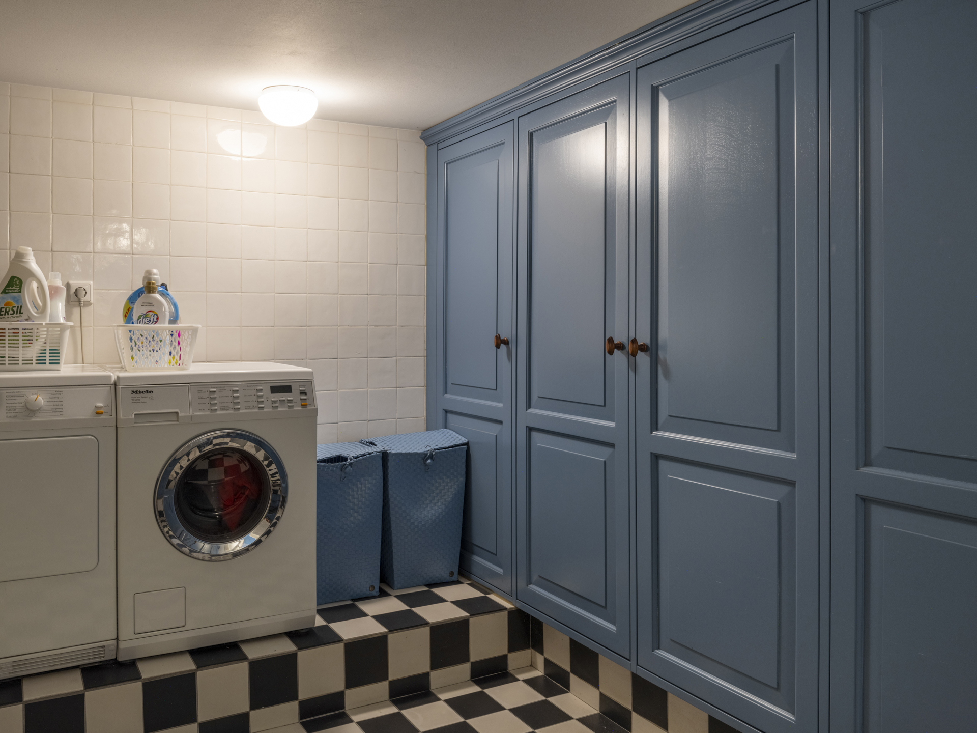 Beneath the kitchen-diner is a utility room/cellar with standing height. This heated space includes a daylight window, full tiling, a kitchenette with granite countertop, large porcelain sink, and a kitchen boiler. Washing machine and dryer connections are located here, as well as a full-width, tall built-in cupboard for extra storage.