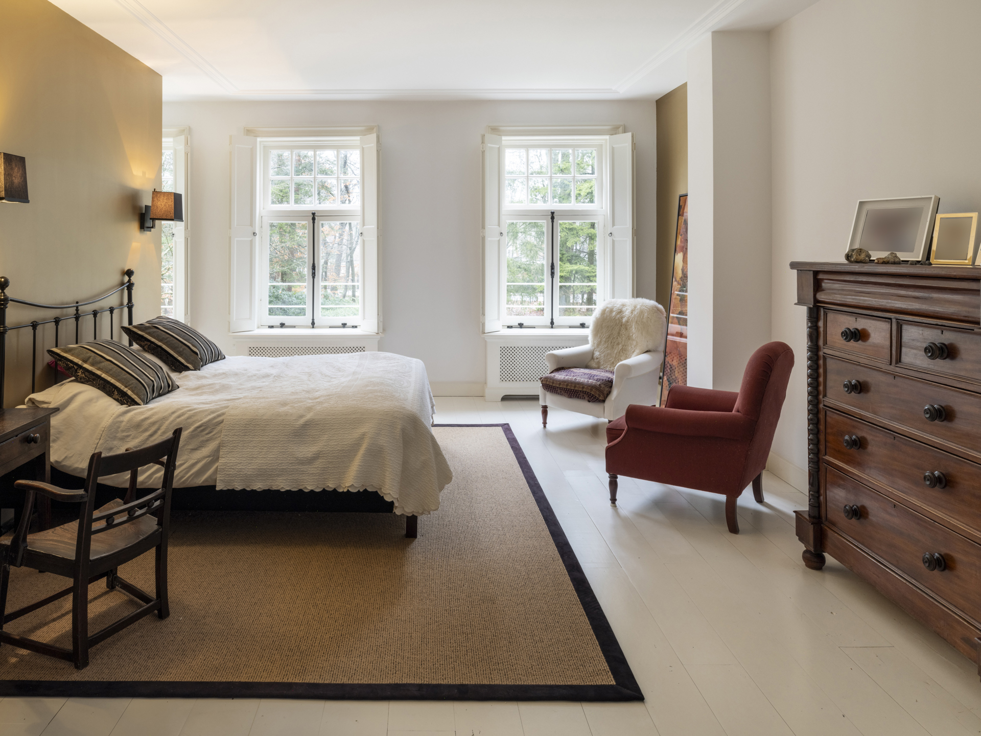 Large master bedroom, also at the front, with similar custom wooden shutters. The master bedroom provides access to the adjoining bathroom (Bathroom I) and a walk-in wardrobe.