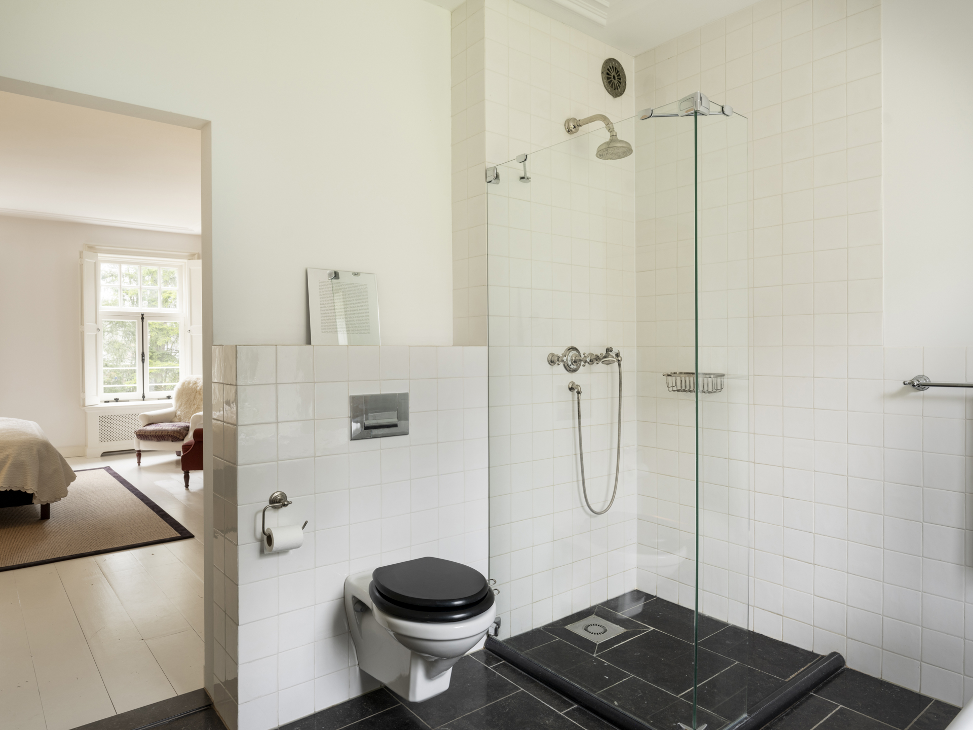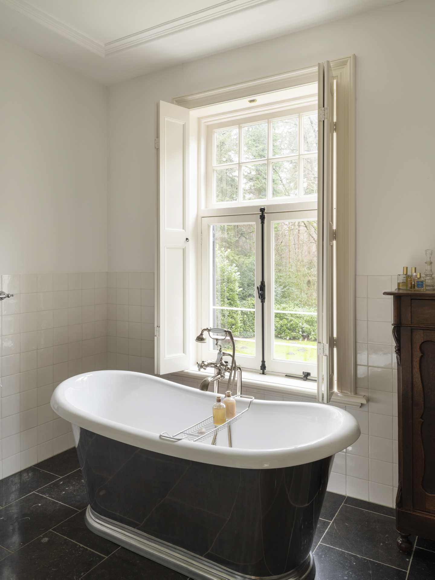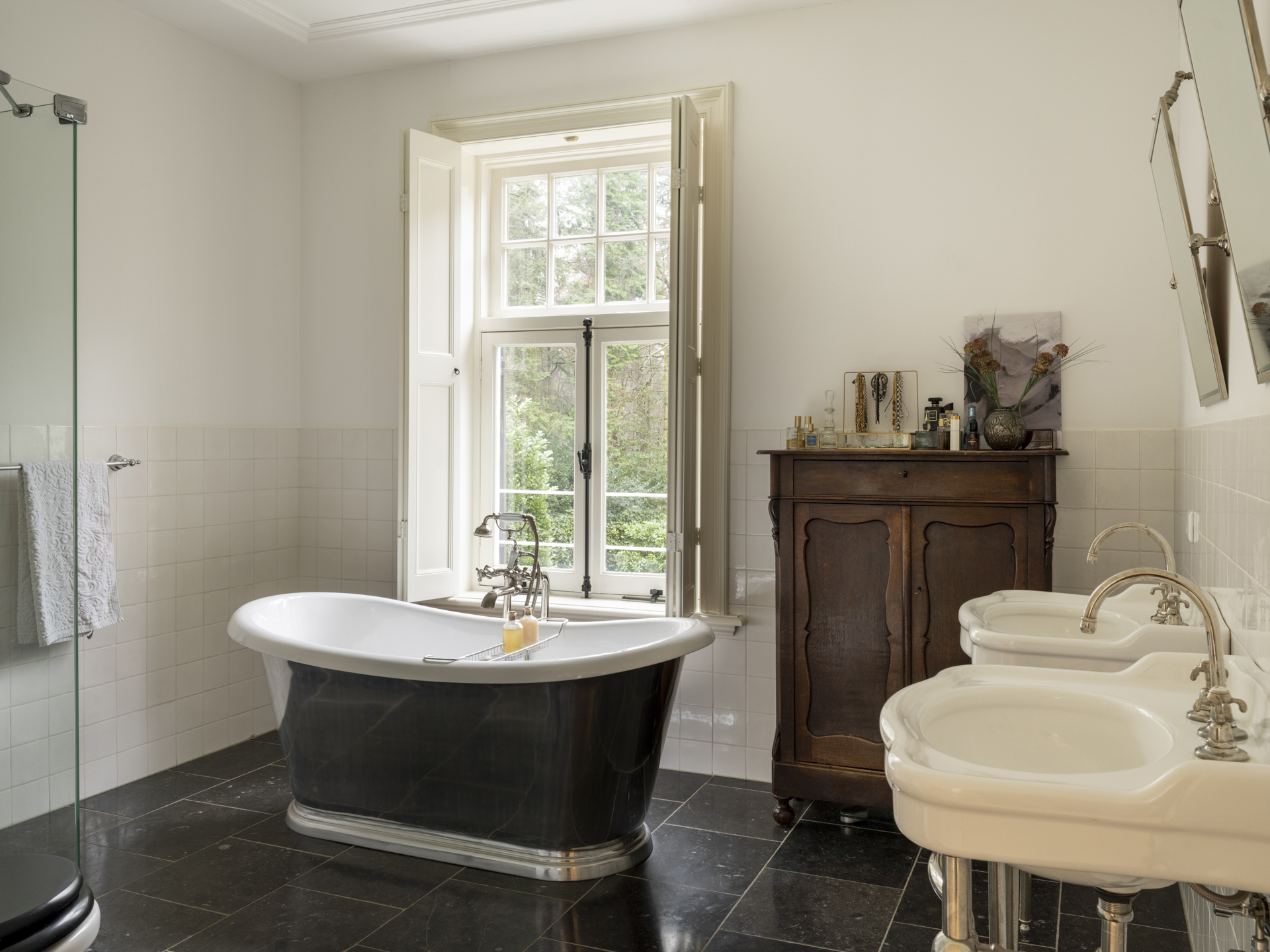 Natural stone floor with underfloor heating, walk-in shower with handheld and rain shower, freestanding bathtub (with garden view), double sink, and wall-mounted toilet.