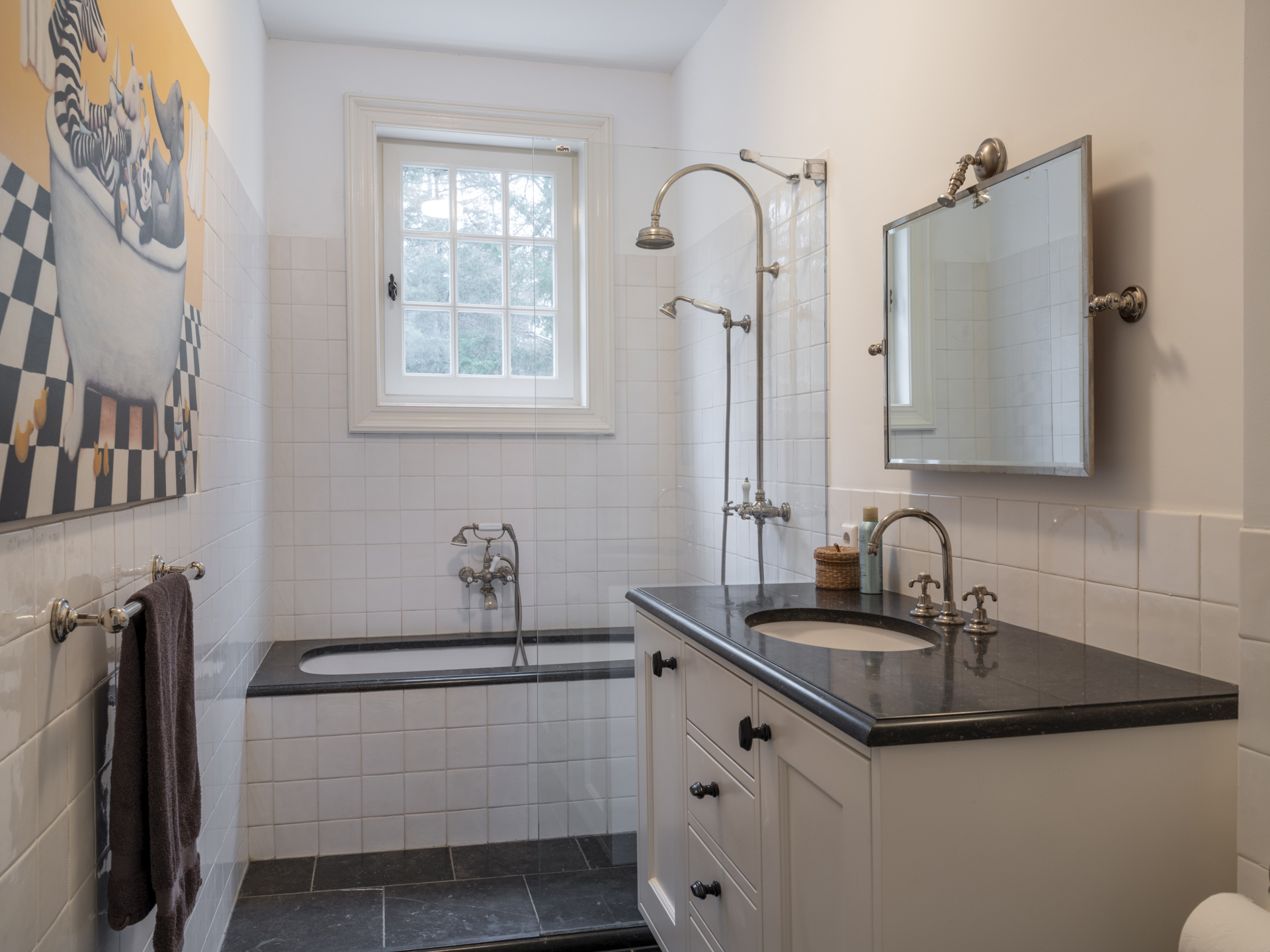 Second bathroom with bathtub, walk-in shower with handheld and rain shower, vanity unit, and wall-mounted toilet. This bathroom also features underfloor heating and Belgian bluestone finishes.