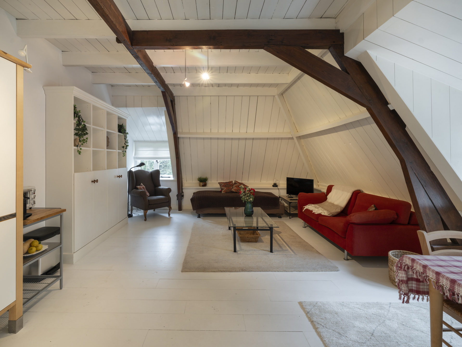 Large front-facing bedroom/studio. Dormer windows on the front and side provide natural light. The stunning roof structure is visible. Plumbing and electrical connections are available for a kitchenette.
