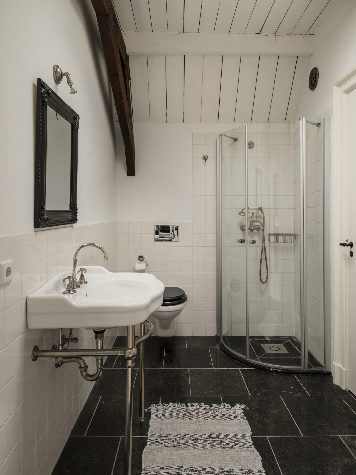 Bathroom with shower cabin, washbasin, and wall-mounted toilet. A skylight provides daylight.