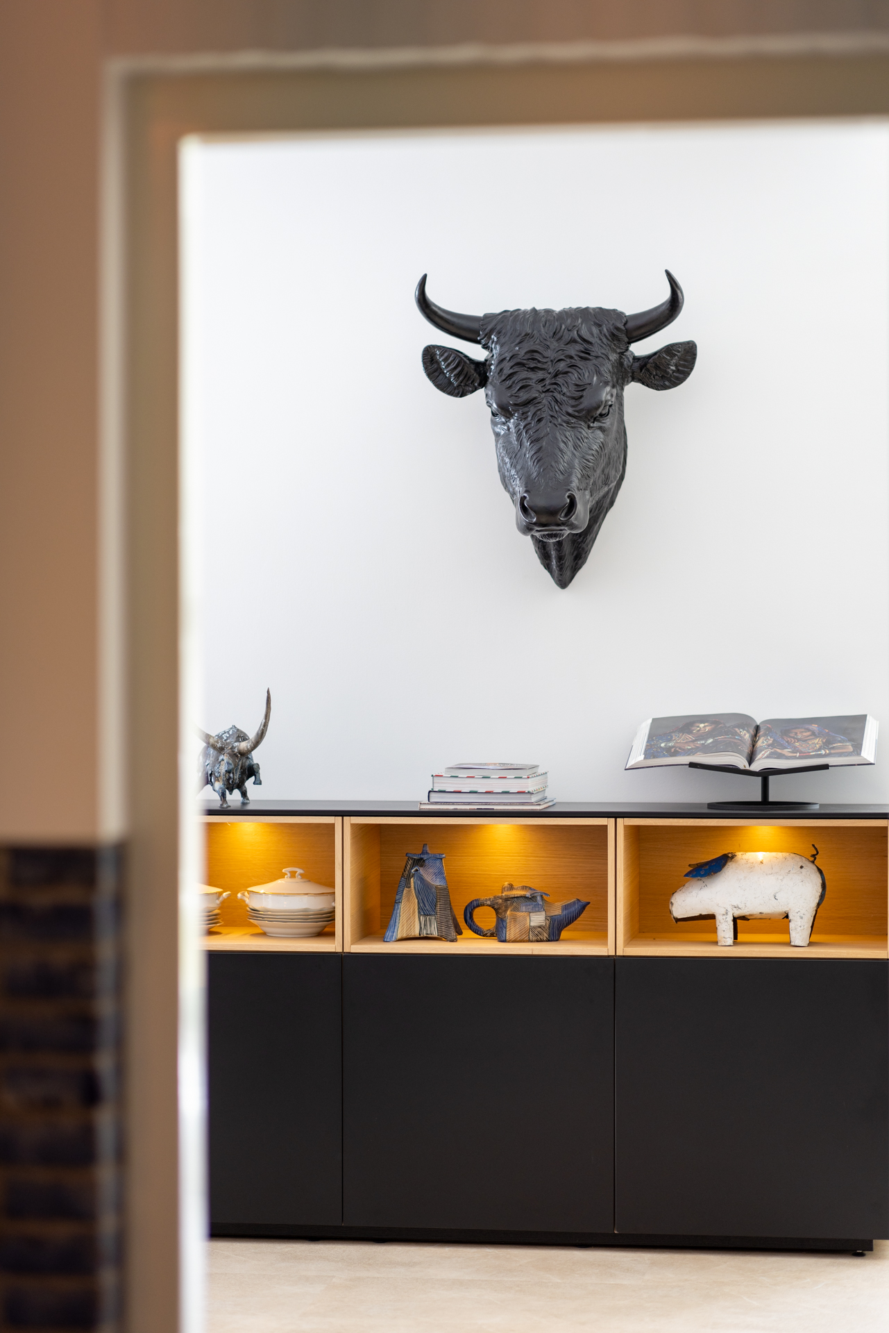 The kitchen has a gas fireplace, spacious dining area and double doors to the garden. This gives a nice connection with the garden and the outdoor kitchen. Here you bring the outside in.