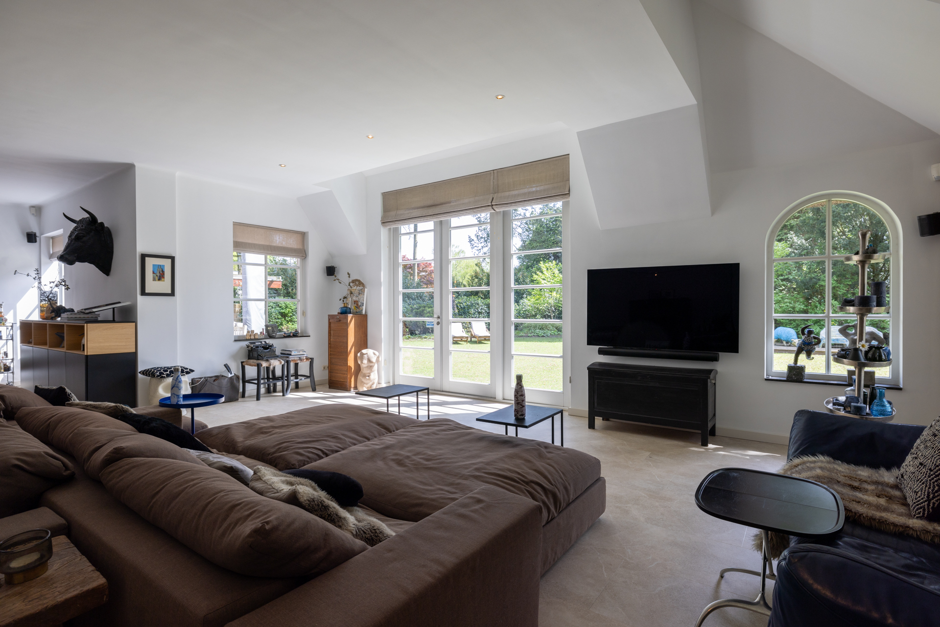 The living room was expanded in 2005. The extension connects nicely to the thatched roof, making the garden doors extra high and offering a fantastic view of the garden. With the windows all around, the living room has a beautiful light. From the living room you have access to the second office / fitness room and through a beautiful sliding door to the kitchen.