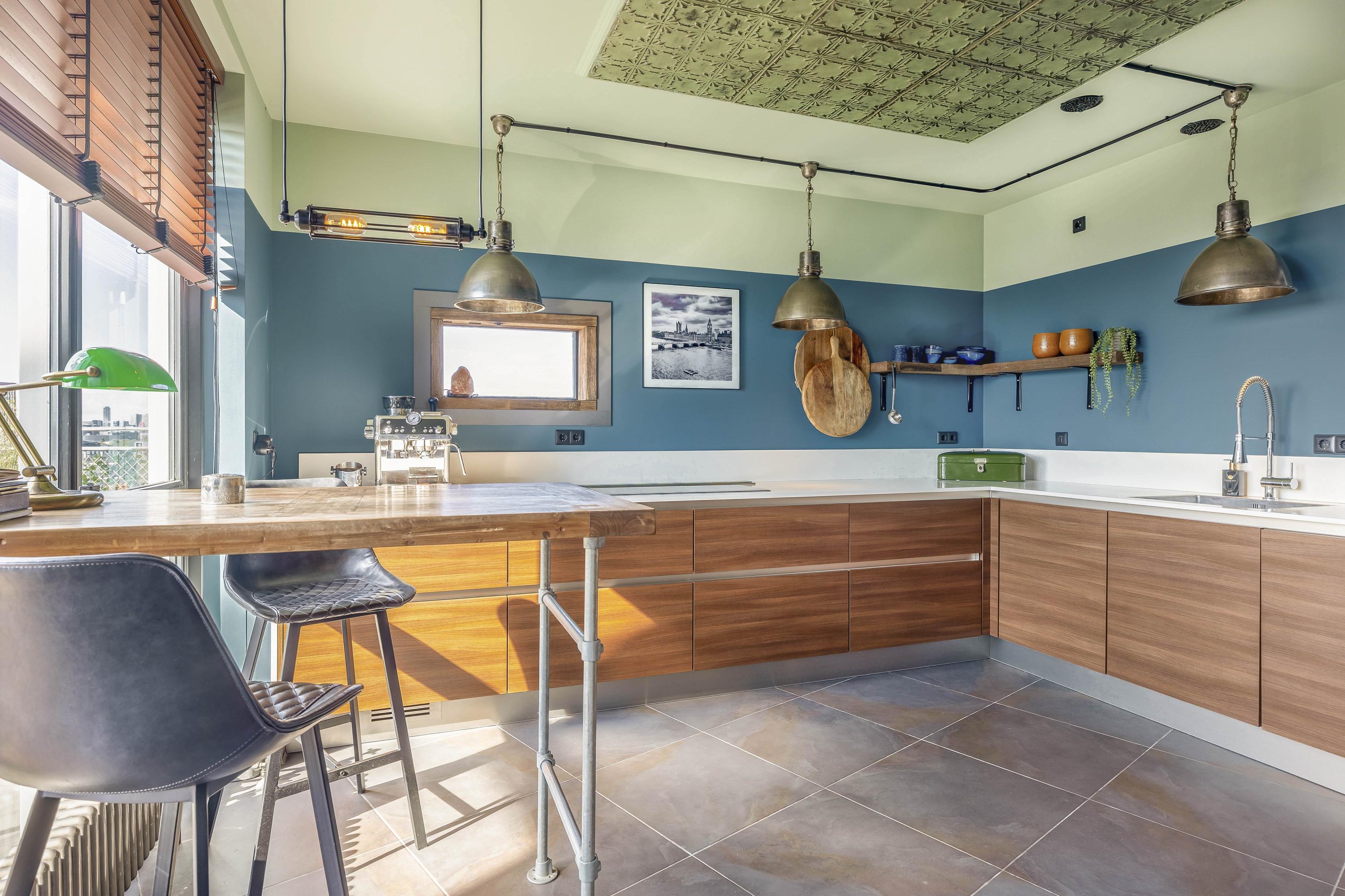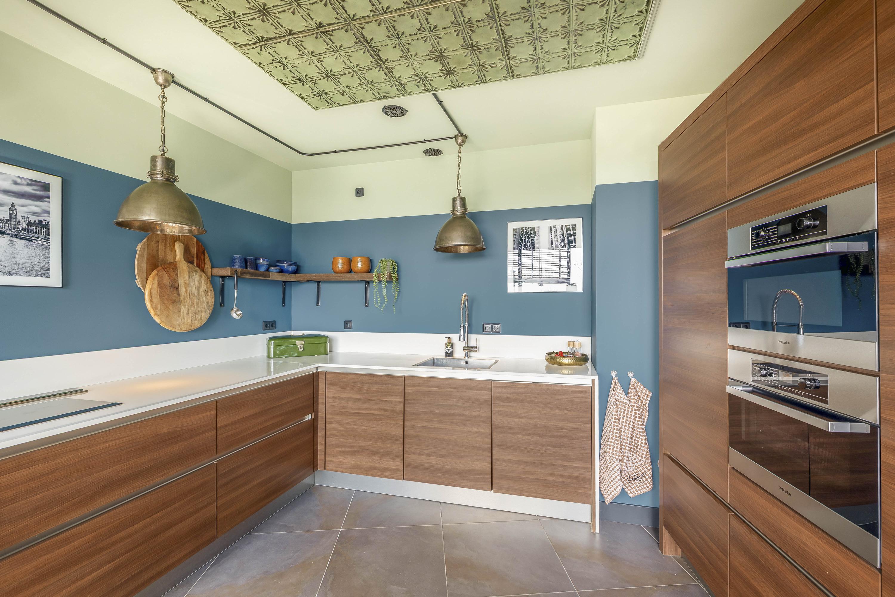 The luxurious semi-open kitchen (14 m²) is laid out in a U-shape, with a composite countertop and high-end (Miele) built-in appliances: induction hob, integrated extractor, two combi-microwaves, dishwasher, fridge, and freezer. A new window adds extra light and views.