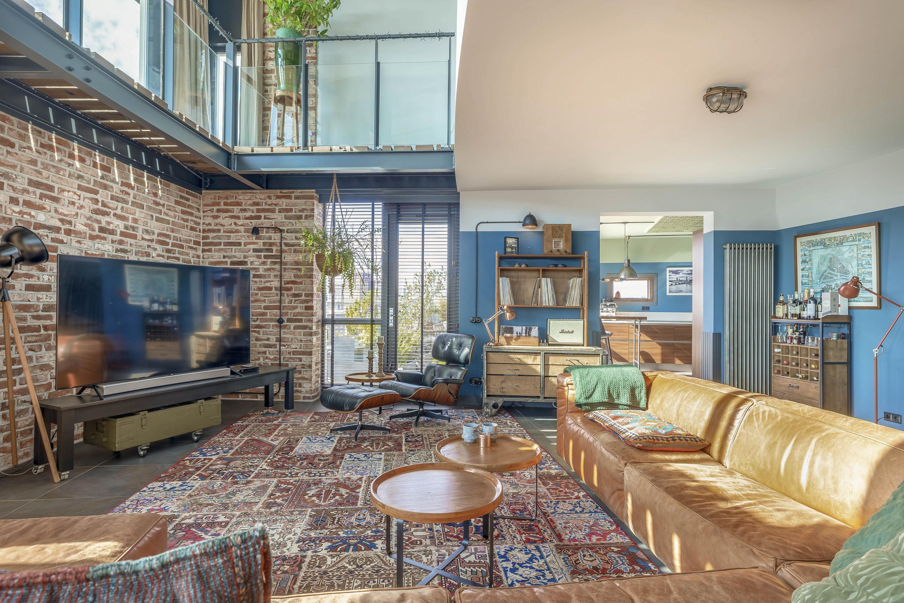 Entrance with wardrobe and guest toilet. The extremely spacious living room (85 m²) boasts incredible natural light thanks to a massive 7-meter-high window and an impressive mezzanine with an industrial-style balustrade. The entire floor is finished with luxurious Italian stone flooring and underfloor heating. On both sides of the living room, you’ll find expansive rooftop terraces, facing southwest and southeast respectively – 98 m² total. Enjoy all-day sun and phenomenal views. The skyline of Rotterdam feels almost within reach.