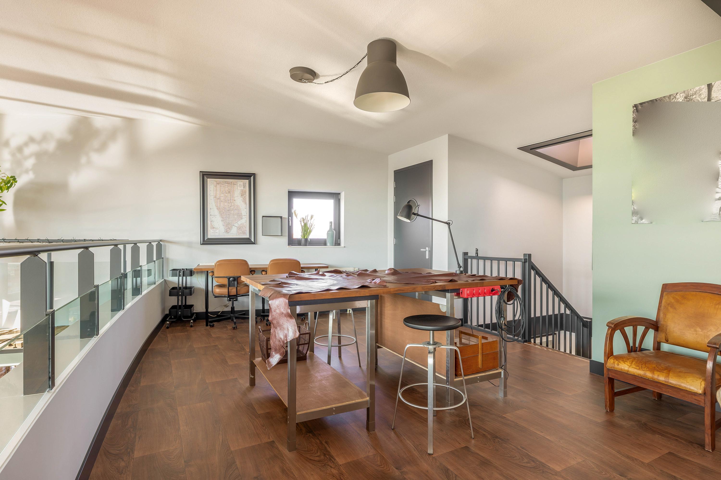 Spacious open office area with expansive views, a stunning mezzanine surrounded by a bold balustrade that highlights the New York loft style, and access to a large storage room with washer and dryer connections.