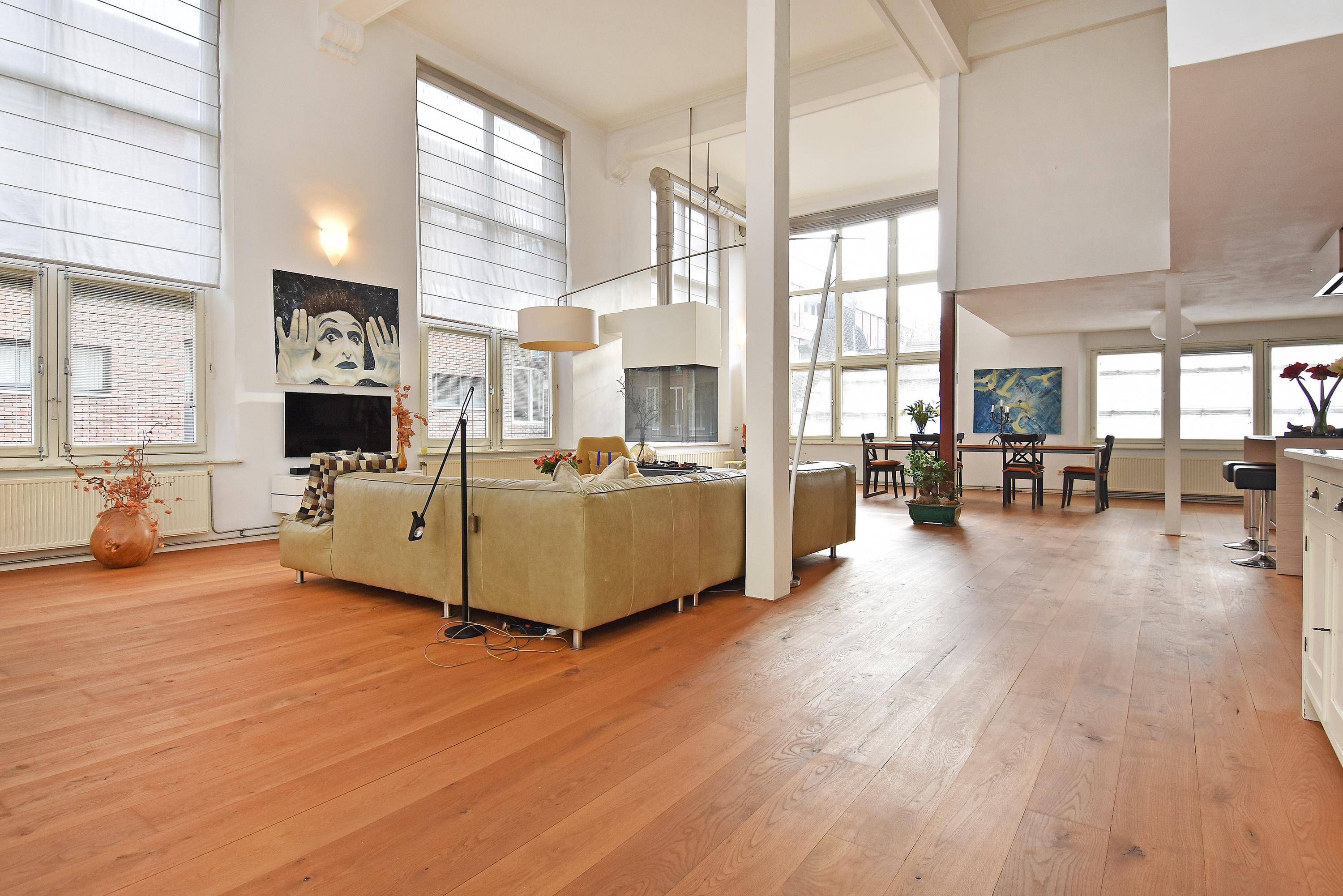 Entree, een brede hal met prachtige zwart/wit betegelde vloer met toilet en binnenberging. Woonkamer van meer dan 100 m2 met een nagenoeg nieuwe open haard (Boley) en een imposante plafondhoogte van ruim 5 meter. Door de vele hoge raampartijen is dit een heerlijke lichte leefruimte. De royale open keuken (Siematic) is recent geplaatst en deze is voorzien van inbouwapparatuur. Ruime slaapkamer met ernaast een moderne badkamer.