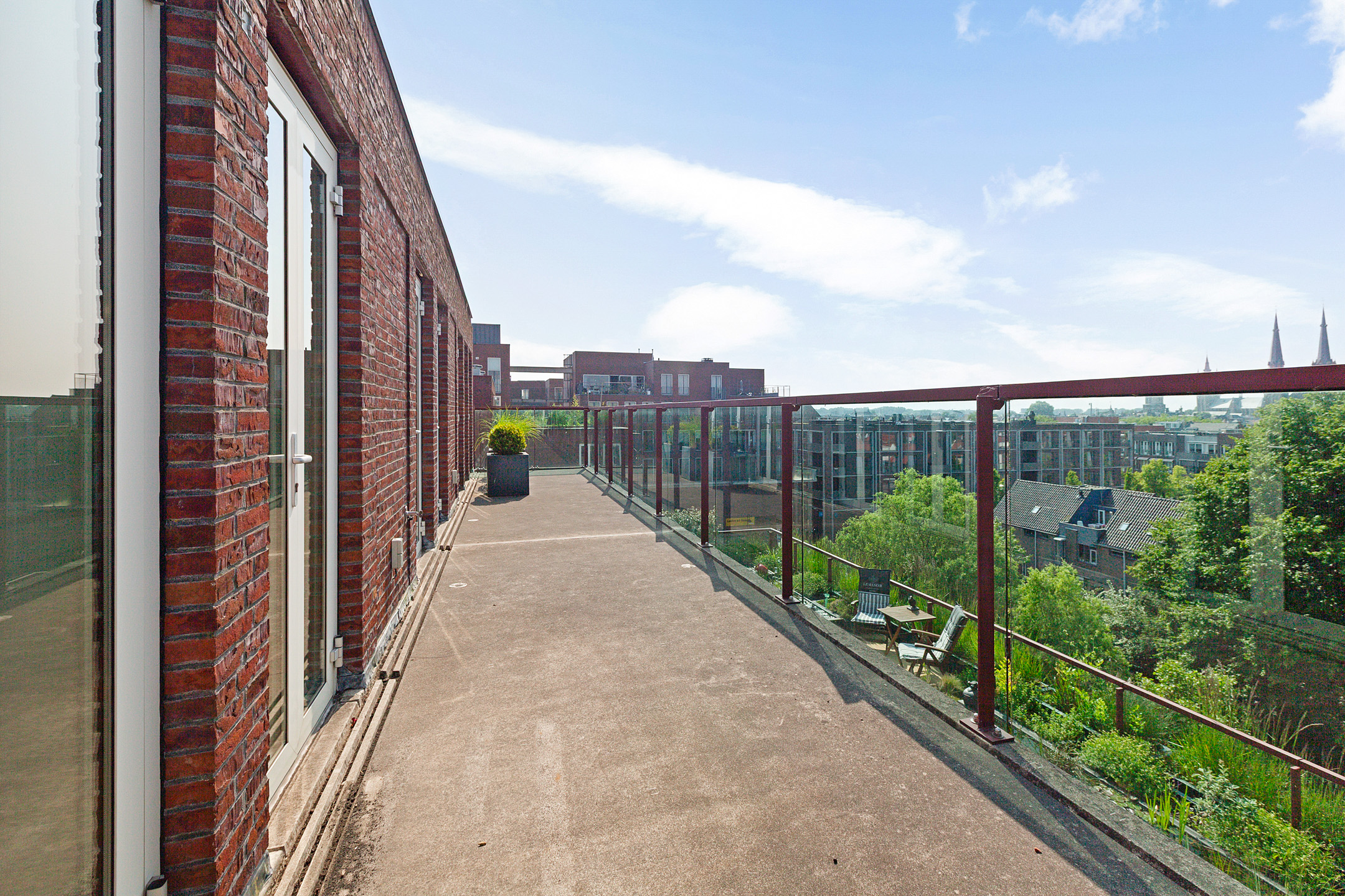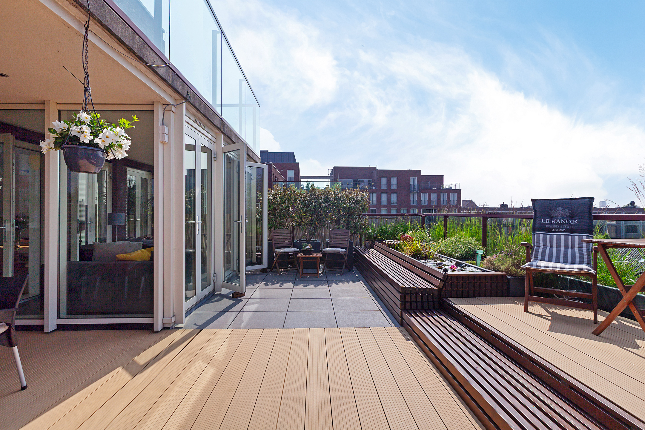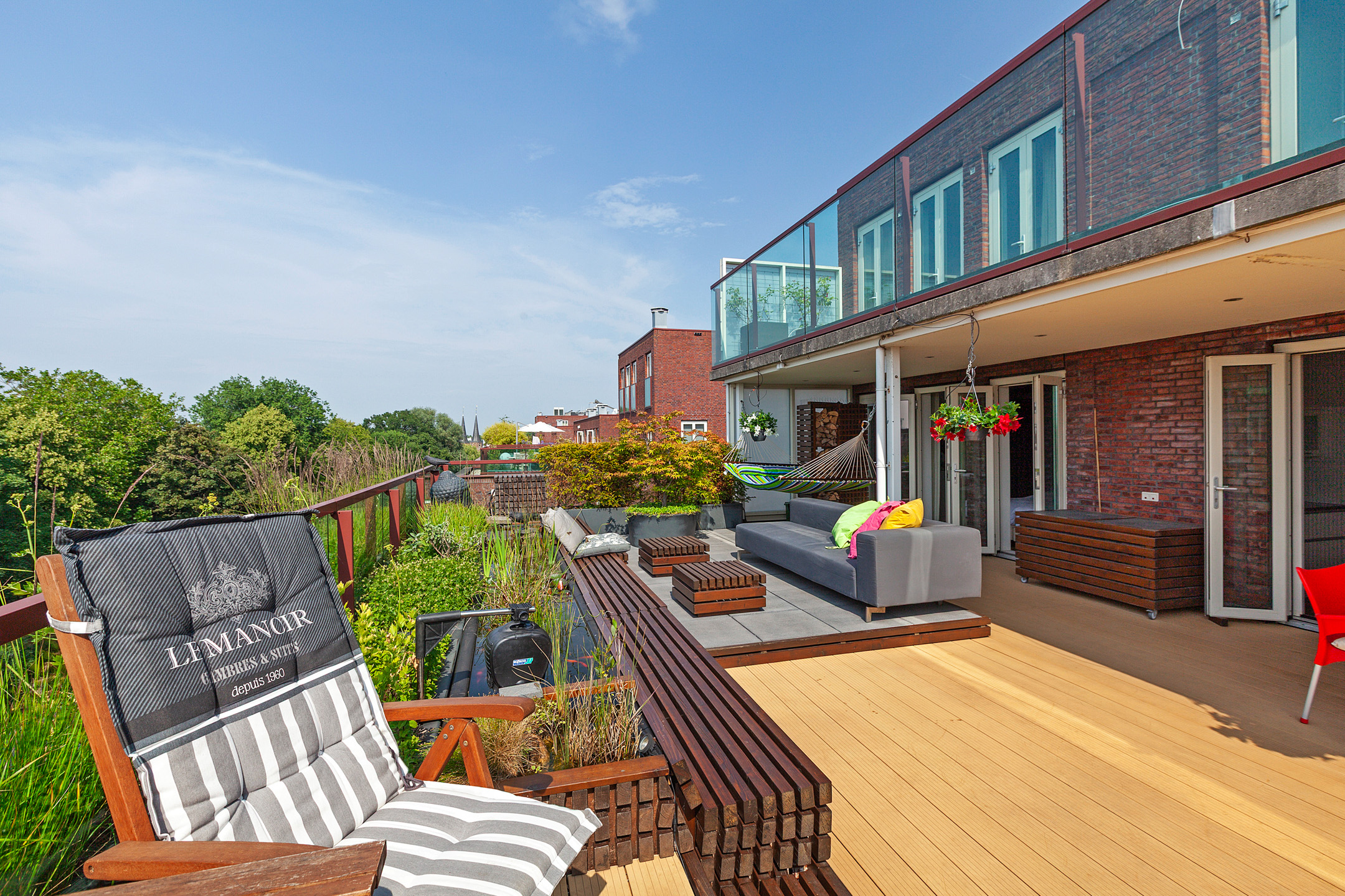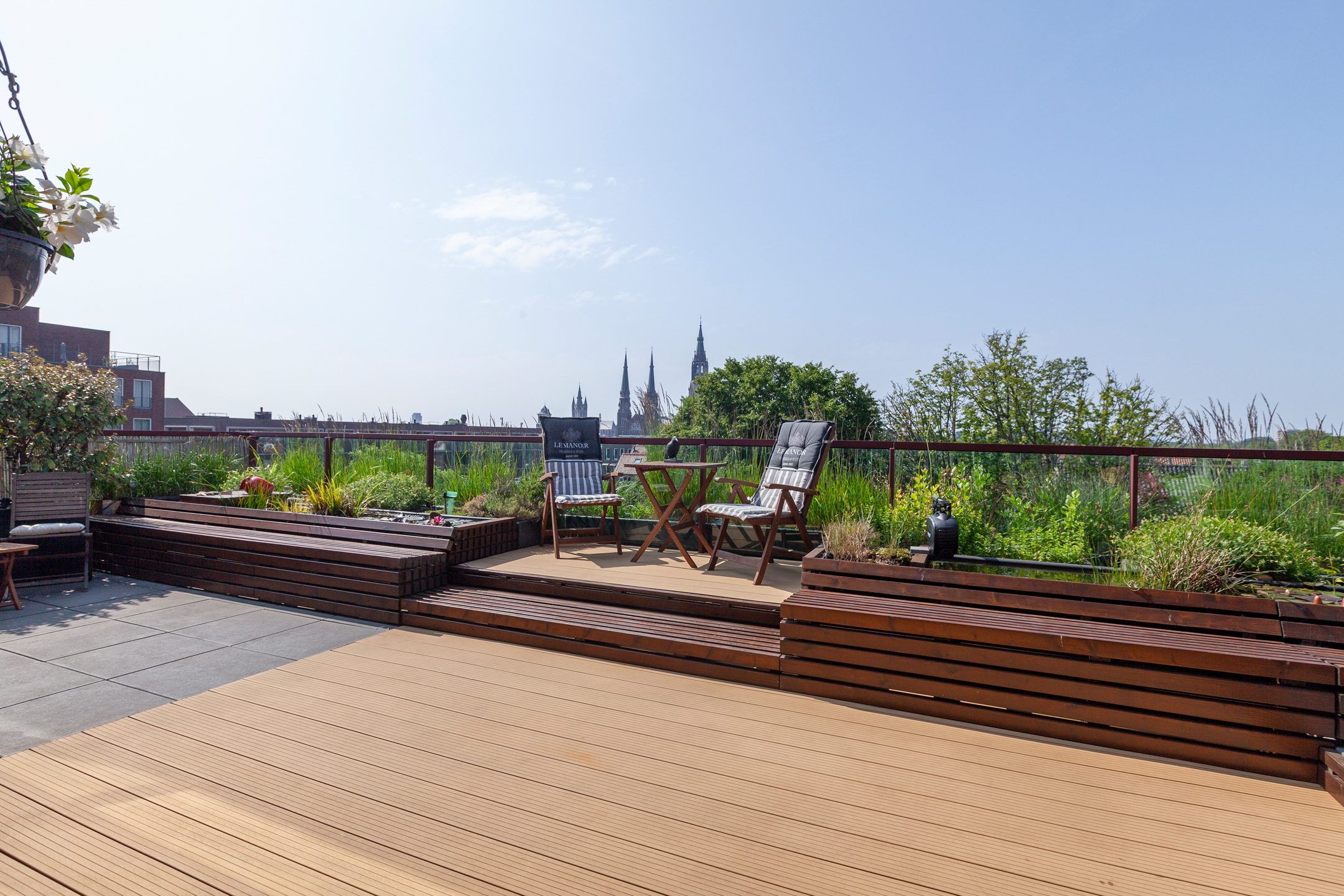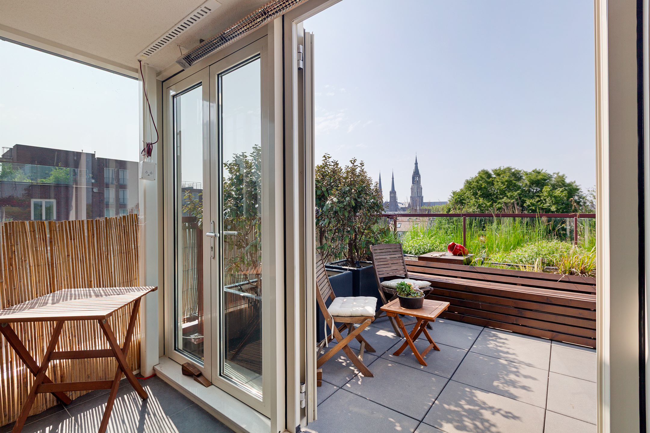 From the bedroom, living room, and kitchen, there is access to the unique 100 m² terrace with breathtaking views over the historic city center of Delft. The terrace is beautifully landscaped with various seating areas, a pond, and plenty of greenery. It’s a true oasis of tranquility in the heart of the city. You can fully enjoy the afternoon and evening sun here. The sunsets are spectacular.