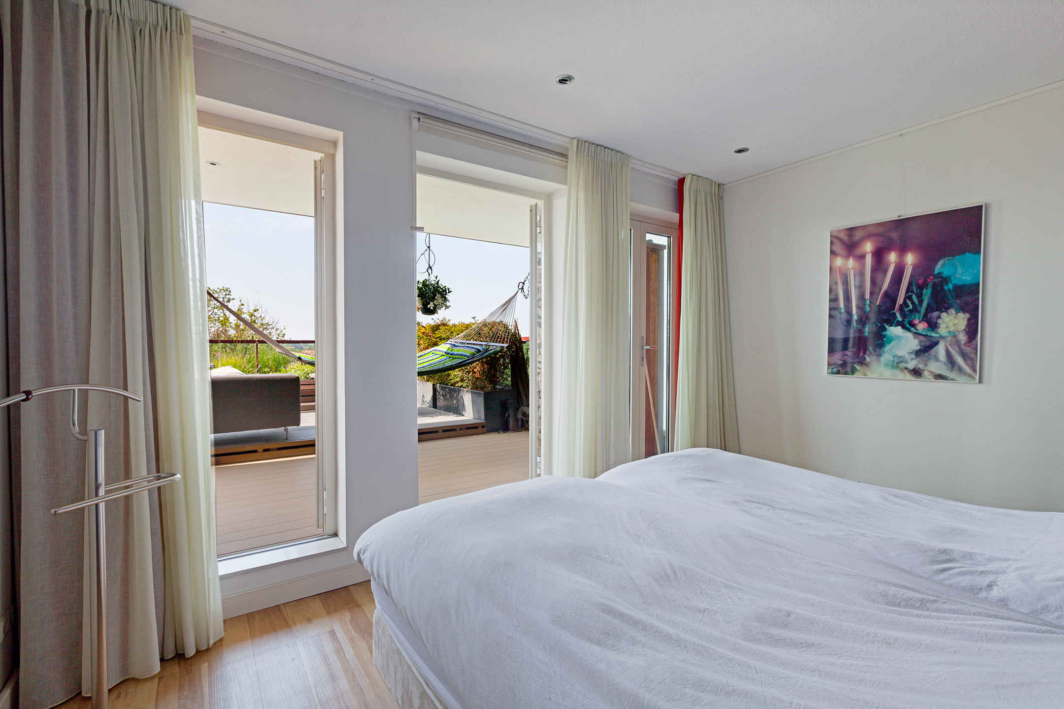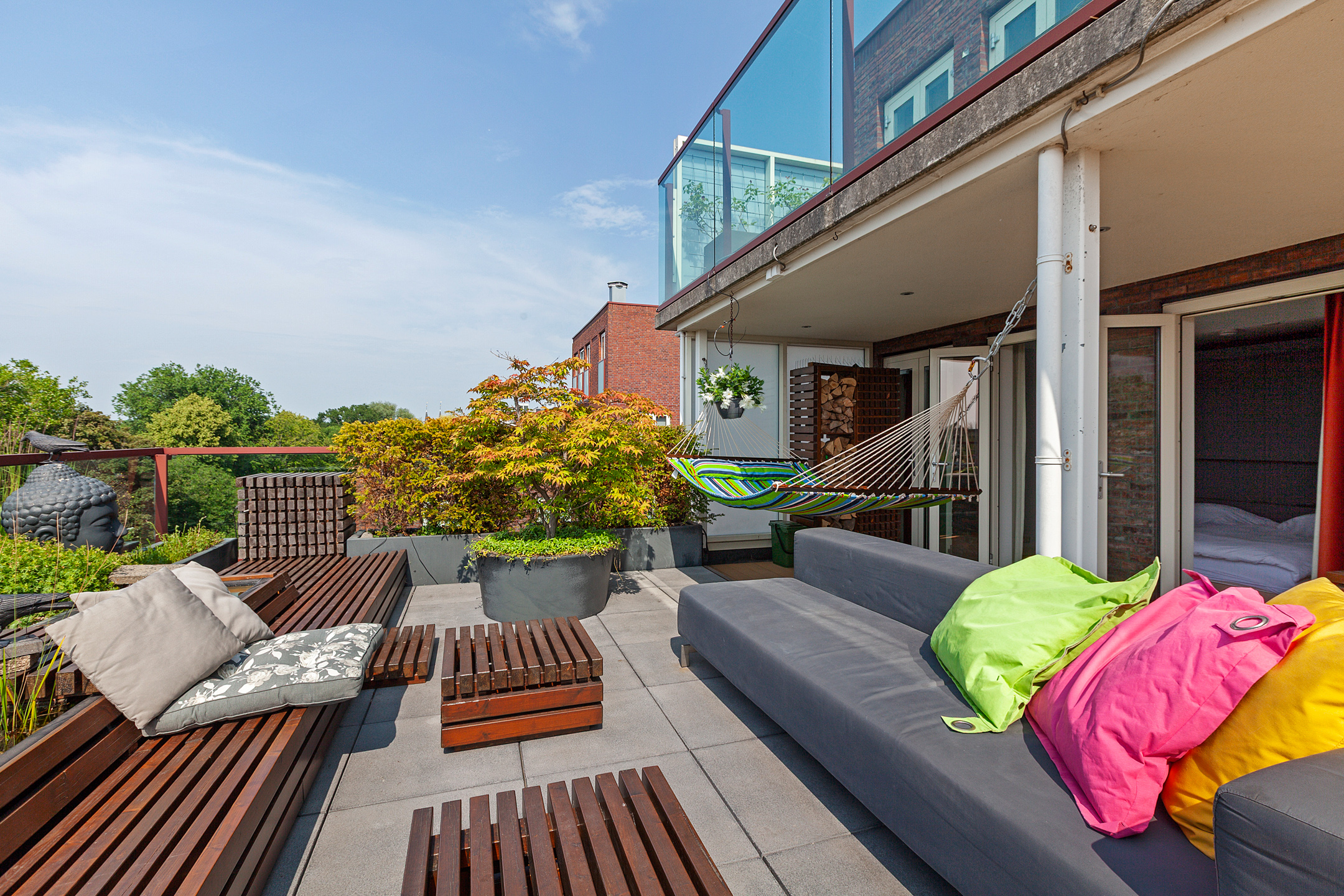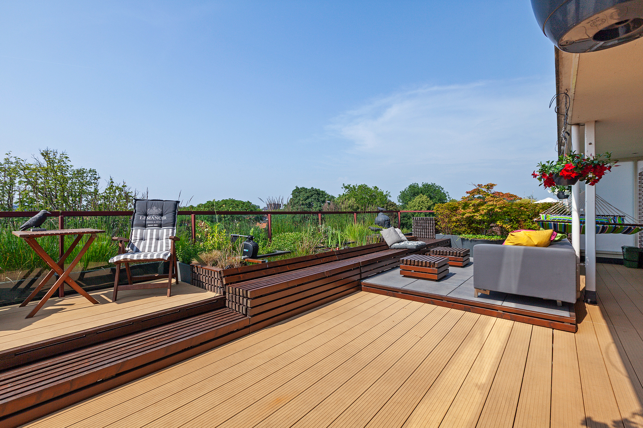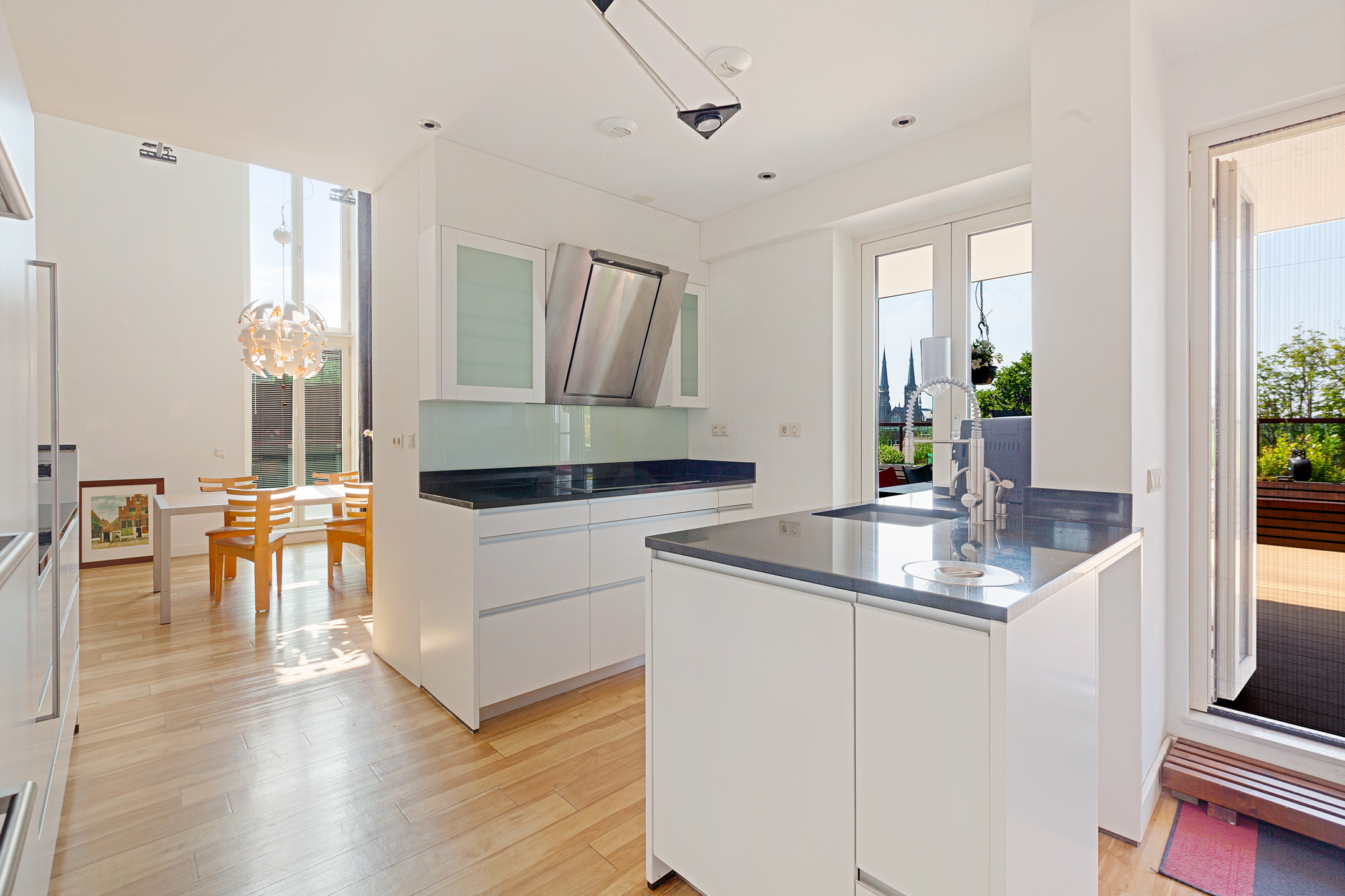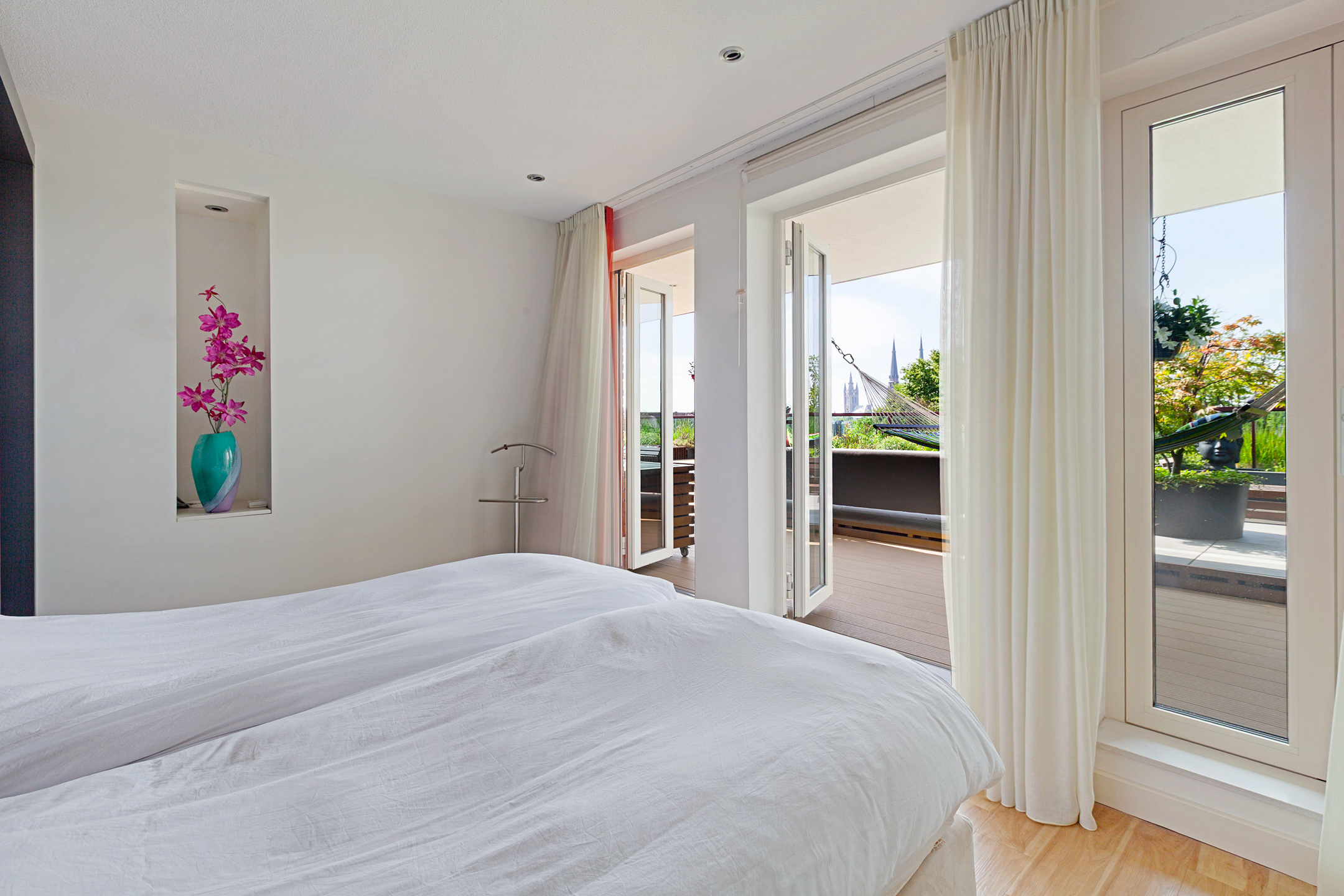 From the bedroom, living room, and kitchen, there is access to the unique 100 m² terrace with breathtaking views over the historic city center of Delft. The terrace is beautifully landscaped with various seating areas, a pond, and plenty of greenery. It’s a true oasis of tranquility in the heart of the city. You can fully enjoy the afternoon and evening sun here. The sunsets are spectacular.