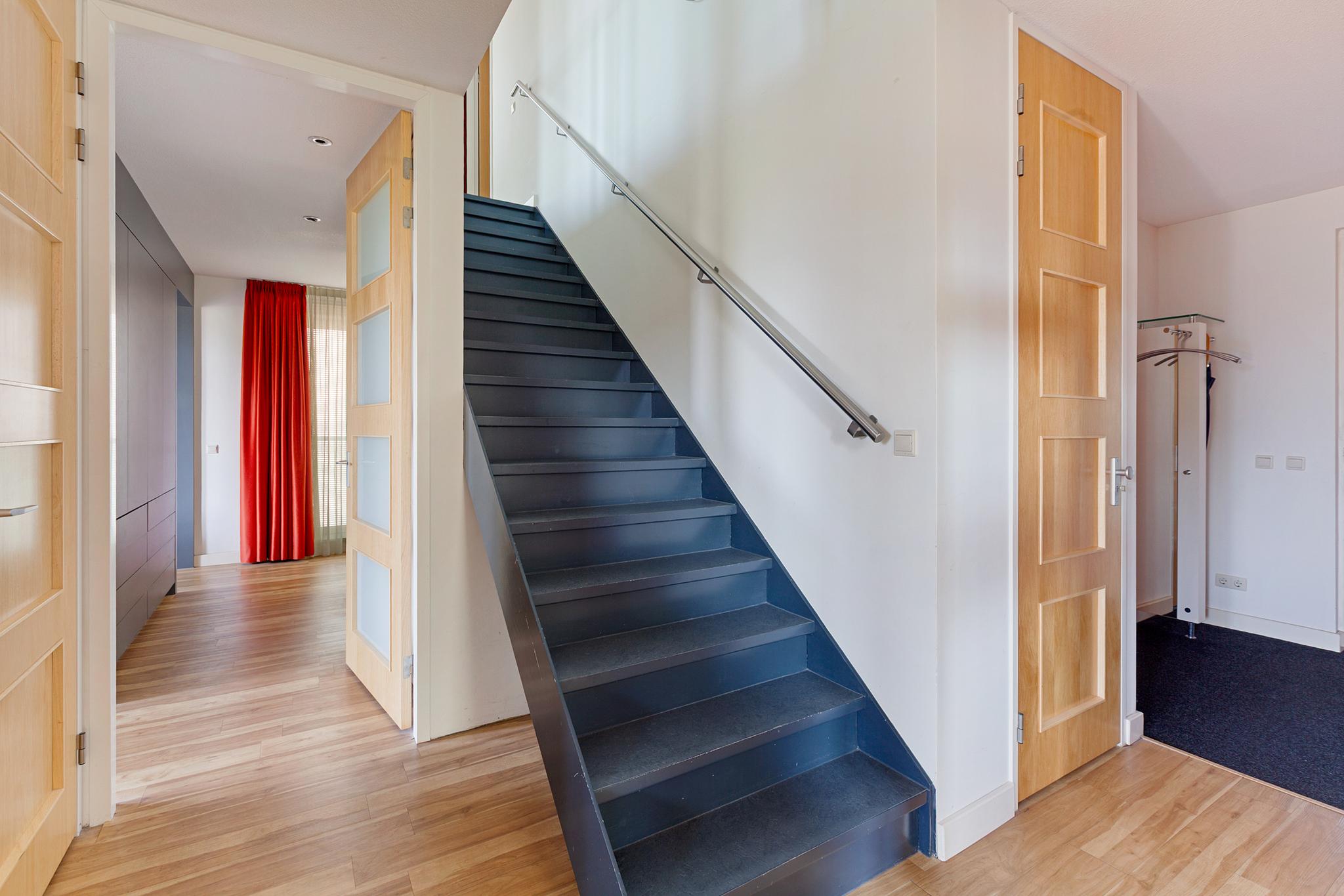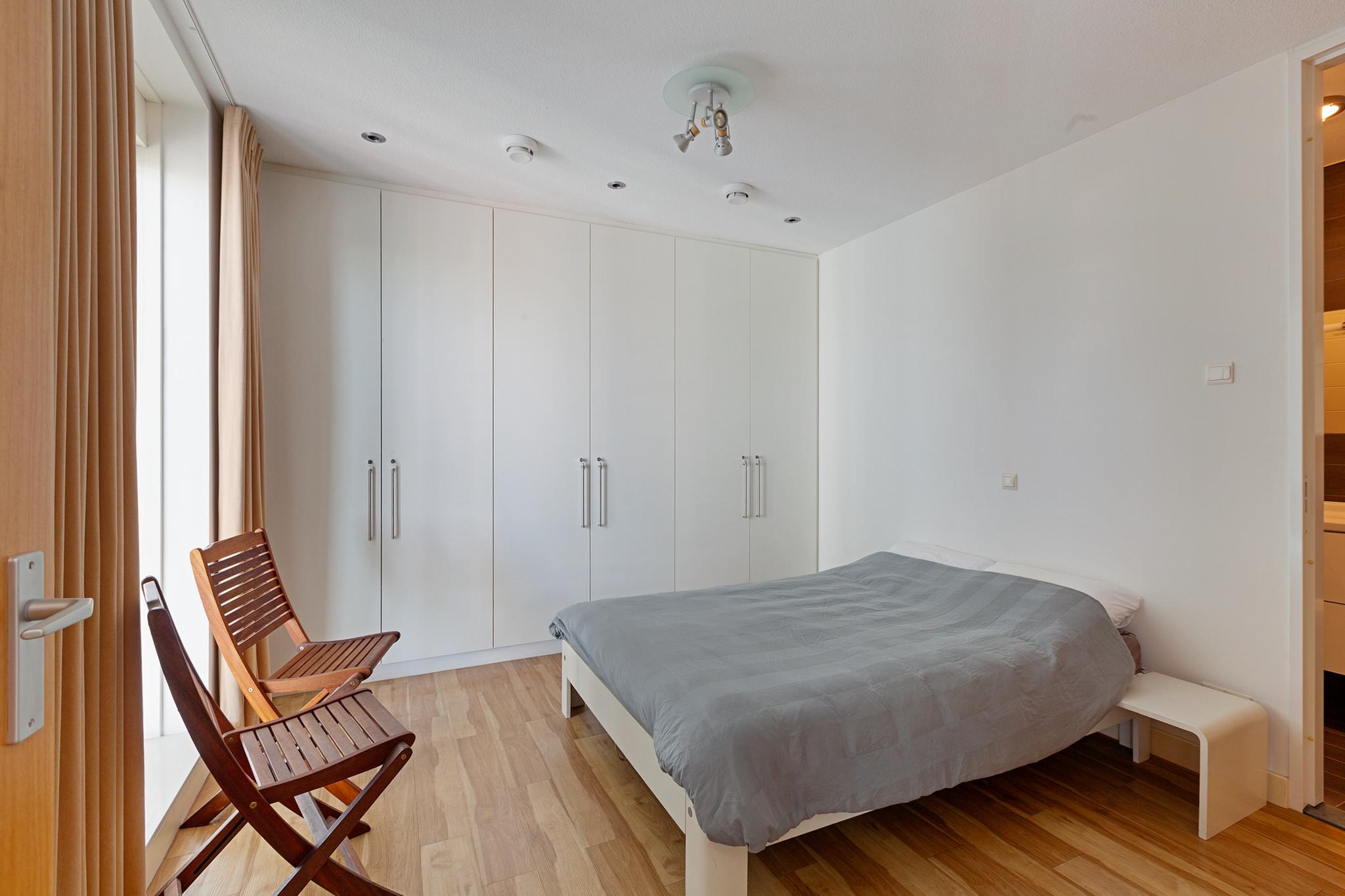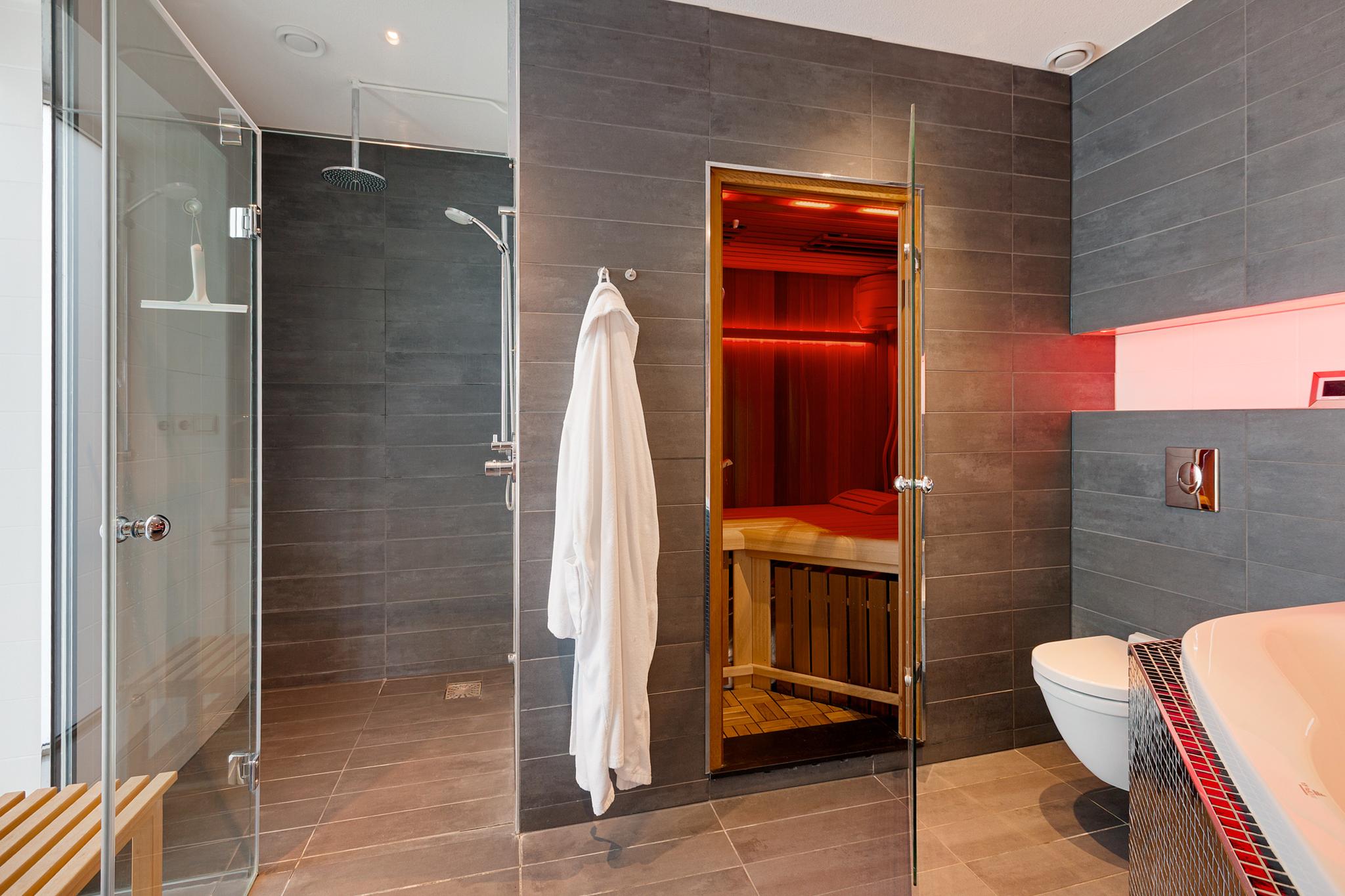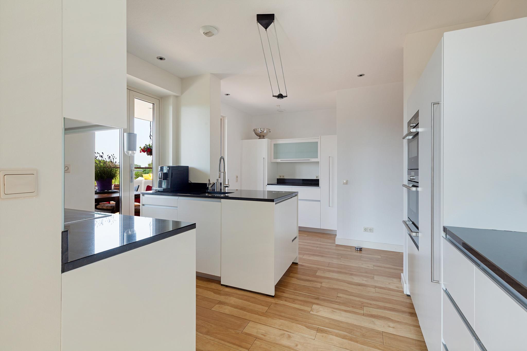 Entrance to the apartment. Spacious hallway providing access to various rooms. Exceptionally large living room with a cozy seating area and a large fireplace/stove. The bright dining area immediately stands out due to the unique ceiling height of no less than 5.50 meters, thanks to the mezzanine! During construction, this height was deliberately created to allow for the installation of a striking chandelier. The dining area provides access to a lovely sunroom on the terrace and to the open kitchen. The kitchen is modern, offers ample cupboard space, and is equipped with luxurious built-in appliances, including a fridge, freezer, microwave, oven, induction cooktop, extractor hood, dishwasher, and Quooker. The master bedroom is located on the northeast side of the apartment and is beautifully furnished with ample built-in wardrobes. From this bedroom, you can access a luxurious and spacious bathroom equipped with a walk-in shower, (whirlpool) bath with star ceiling, sauna, toilet, and a vanity unit – a wonderful space to fully unwind.