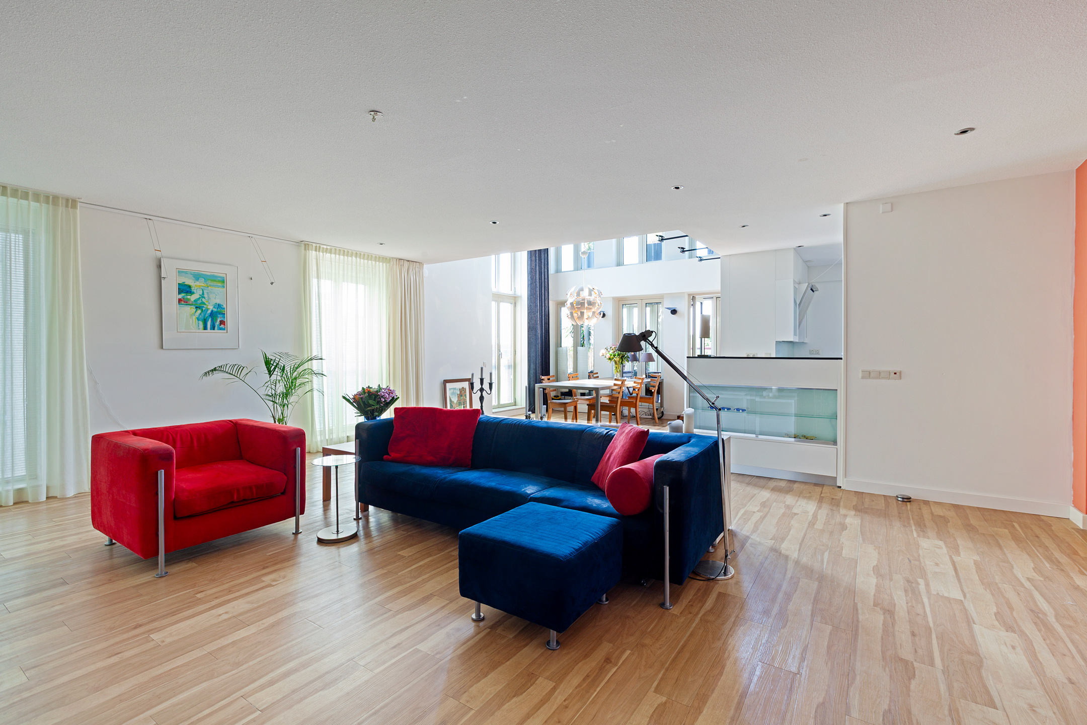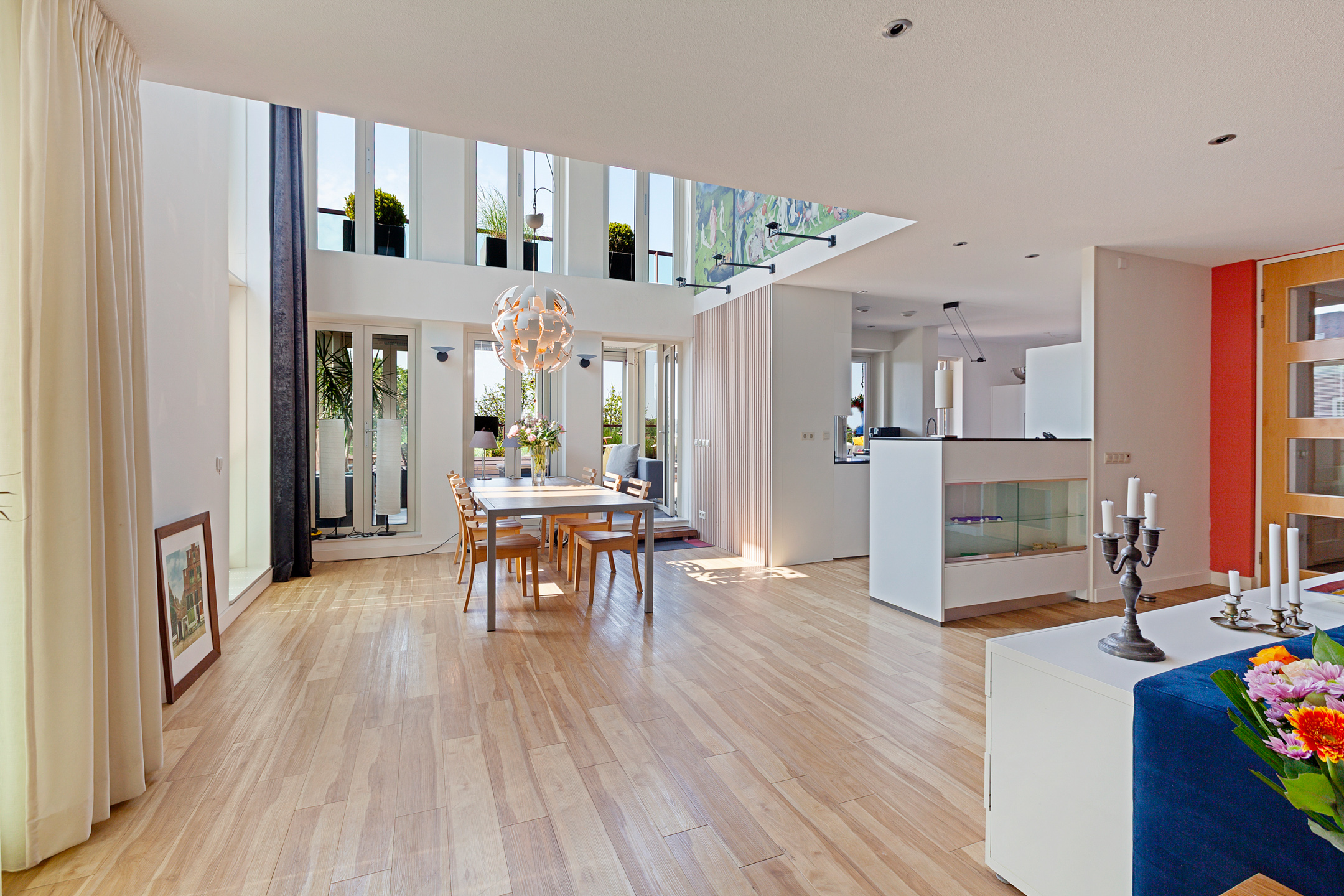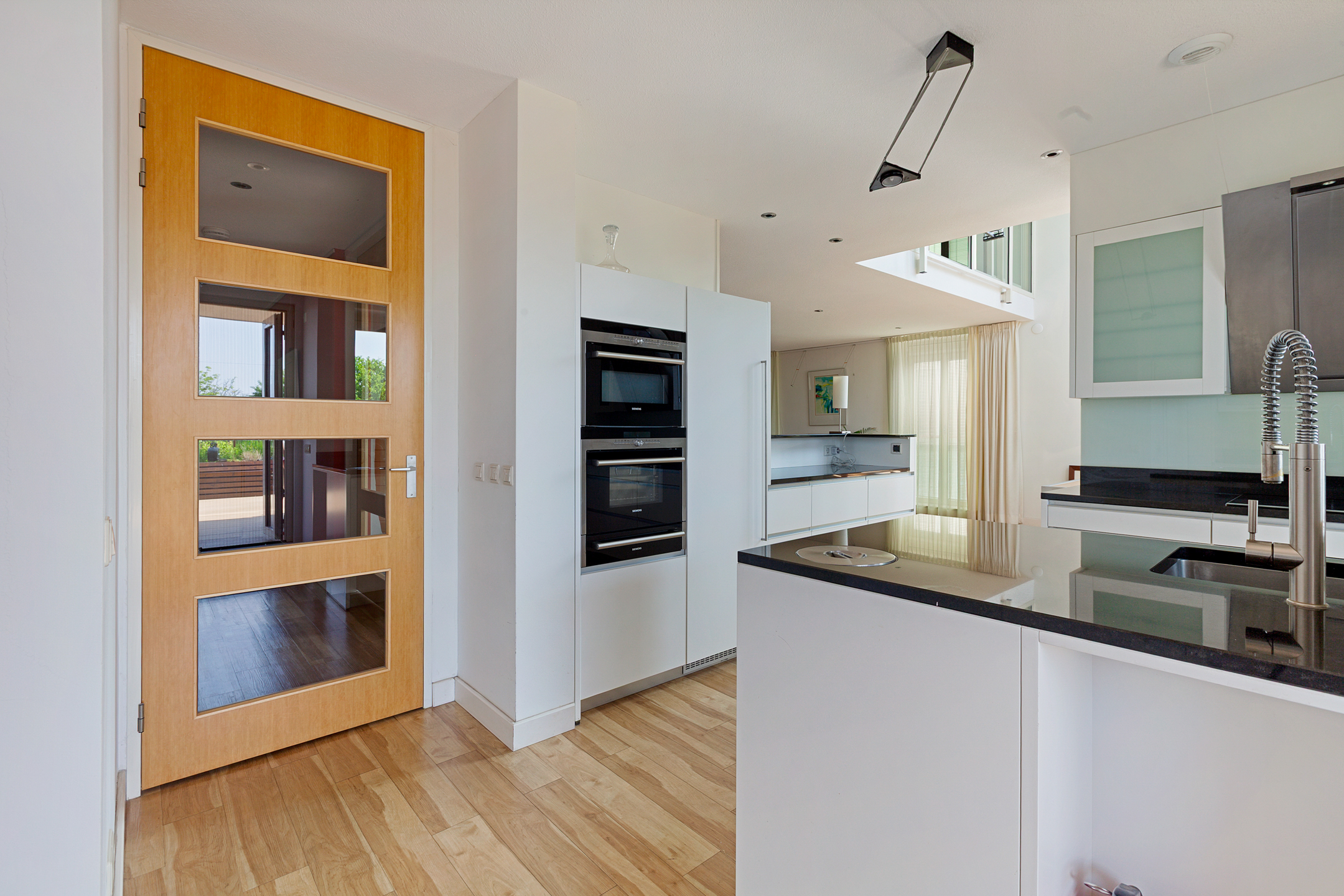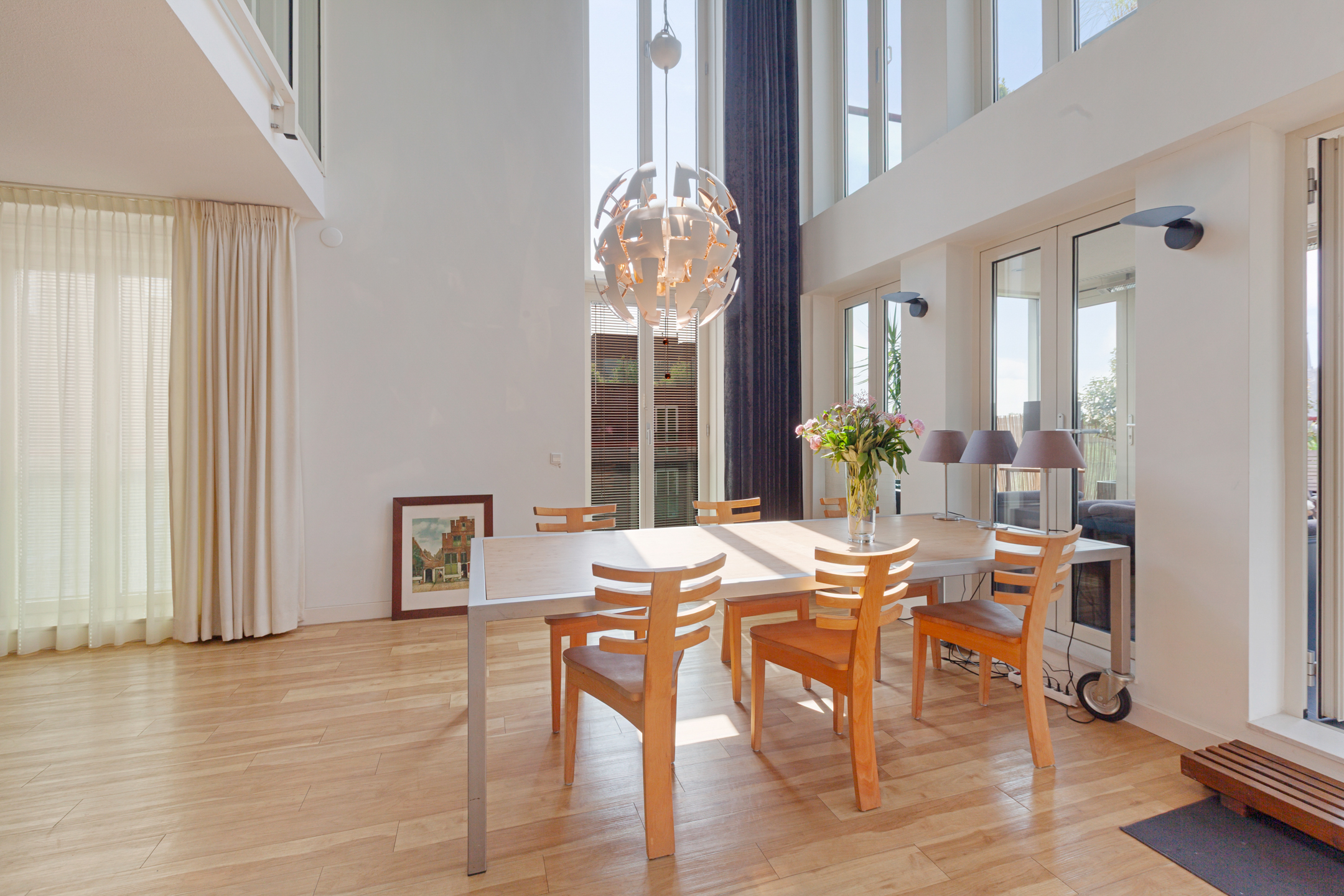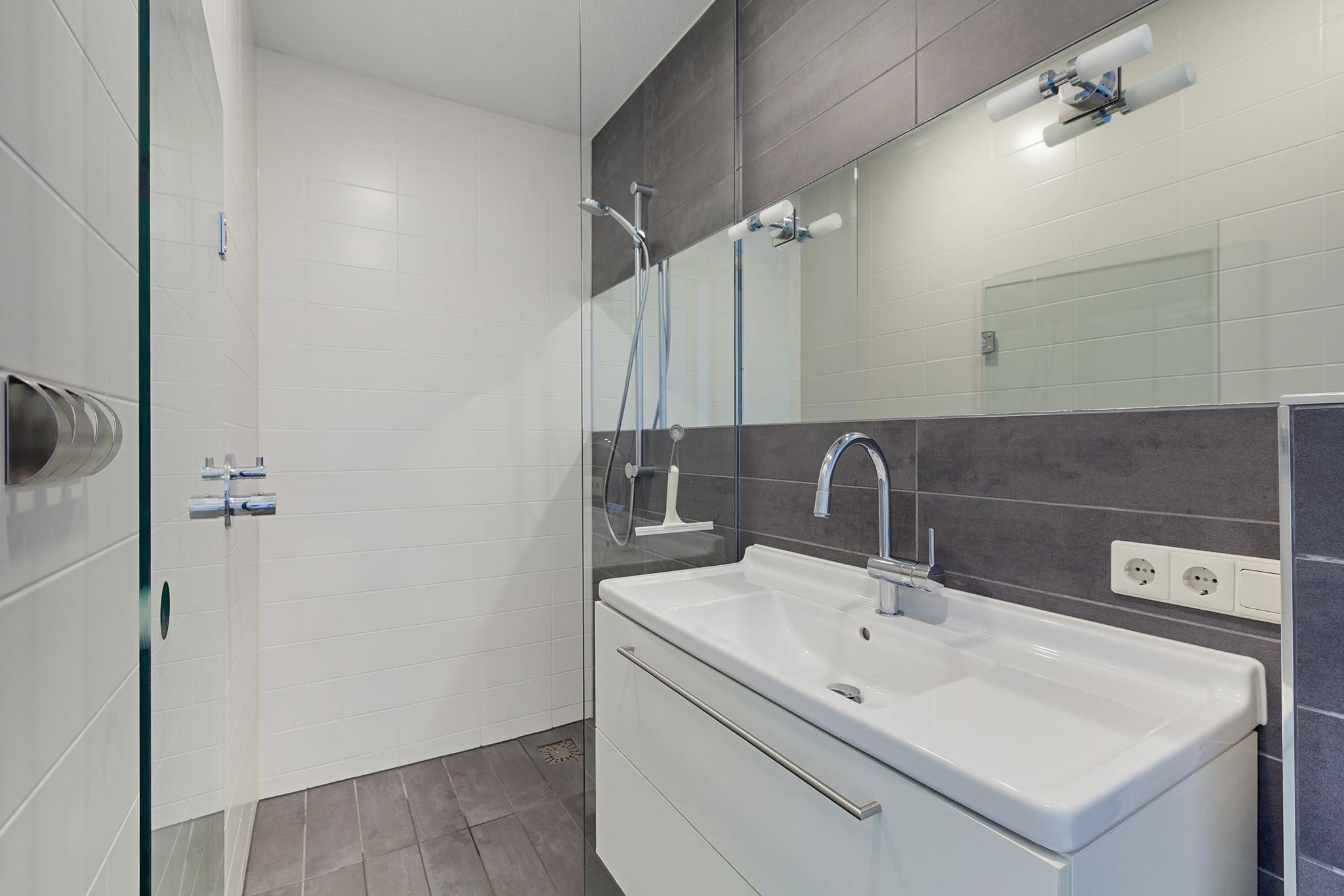 Entrance to the apartment. Spacious hallway providing access to various rooms. Exceptionally large living room with a cozy seating area and a large fireplace/stove. The bright dining area immediately stands out due to the unique ceiling height of no less than 5.50 meters, thanks to the mezzanine! During construction, this height was deliberately created to allow for the installation of a striking chandelier. The dining area provides access to a lovely sunroom on the terrace and to the open kitchen. The kitchen is modern, offers ample cupboard space, and is equipped with luxurious built-in appliances, including a fridge, freezer, microwave, oven, induction cooktop, extractor hood, dishwasher, and Quooker. The master bedroom is located on the northeast side of the apartment and is beautifully furnished with ample built-in wardrobes. From this bedroom, you can access a luxurious and spacious bathroom equipped with a walk-in shower, (whirlpool) bath with star ceiling, sauna, toilet, and a vanity unit – a wonderful space to fully unwind.