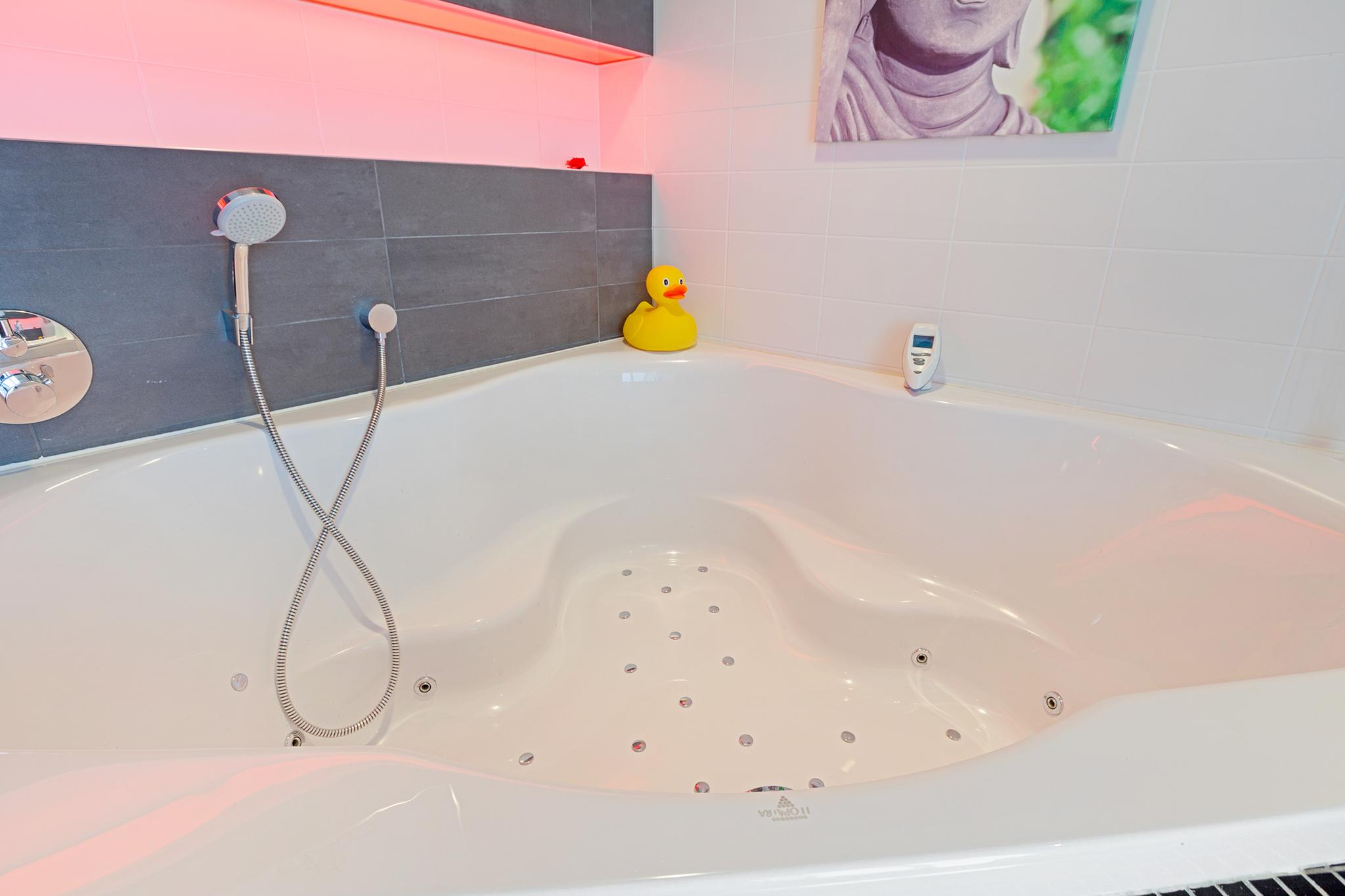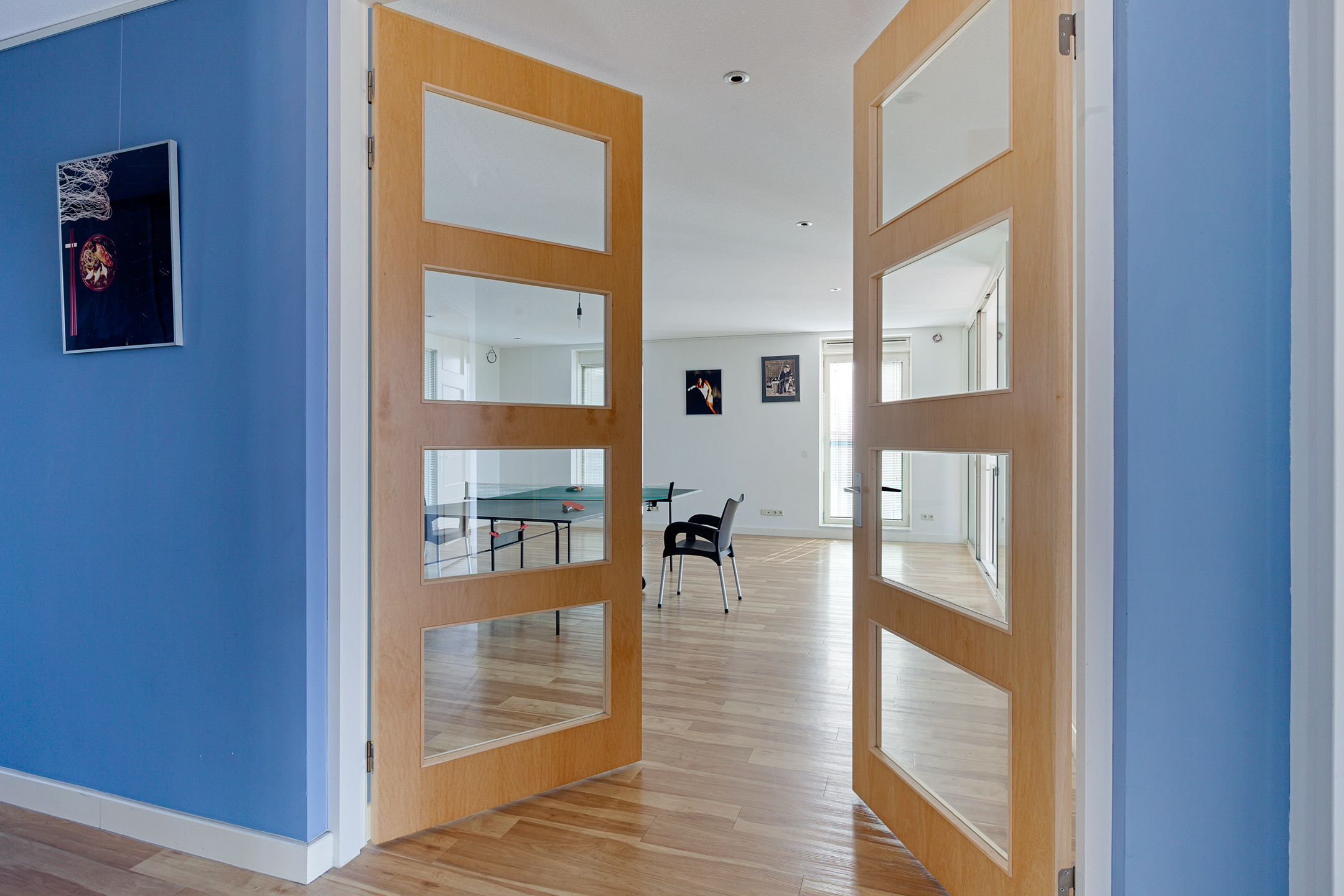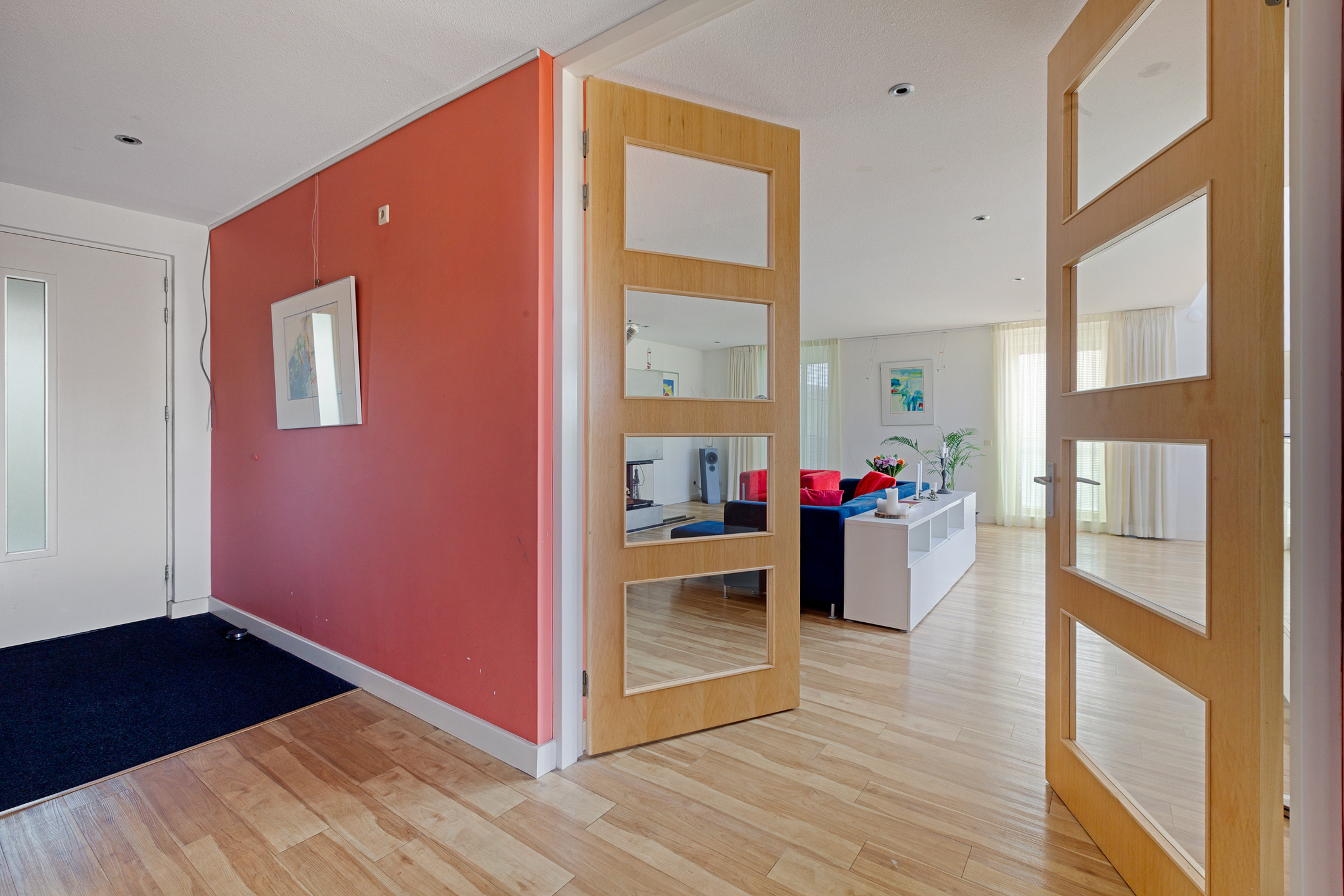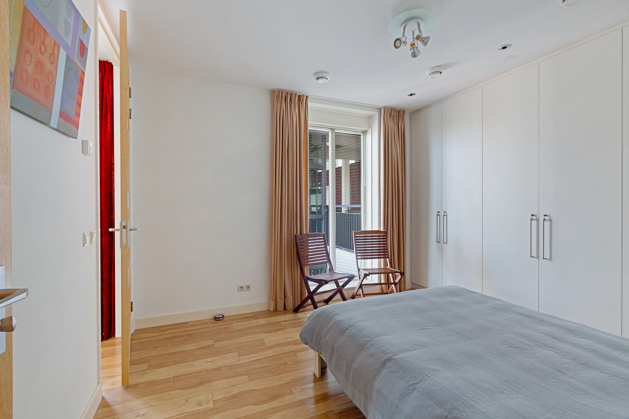 Entrance to the apartment. Spacious hallway providing access to various rooms. Exceptionally large living room with a cozy seating area and a large fireplace/stove. The bright dining area immediately stands out due to the unique ceiling height of no less than 5.50 meters, thanks to the mezzanine! During construction, this height was deliberately created to allow for the installation of a striking chandelier. The dining area provides access to a lovely sunroom on the terrace and to the open kitchen. The kitchen is modern, offers ample cupboard space, and is equipped with luxurious built-in appliances, including a fridge, freezer, microwave, oven, induction cooktop, extractor hood, dishwasher, and Quooker. The master bedroom is located on the northeast side of the apartment and is beautifully furnished with ample built-in wardrobes. From this bedroom, you can access a luxurious and spacious bathroom equipped with a walk-in shower, (whirlpool) bath with star ceiling, sauna, toilet, and a vanity unit – a wonderful space to fully unwind.