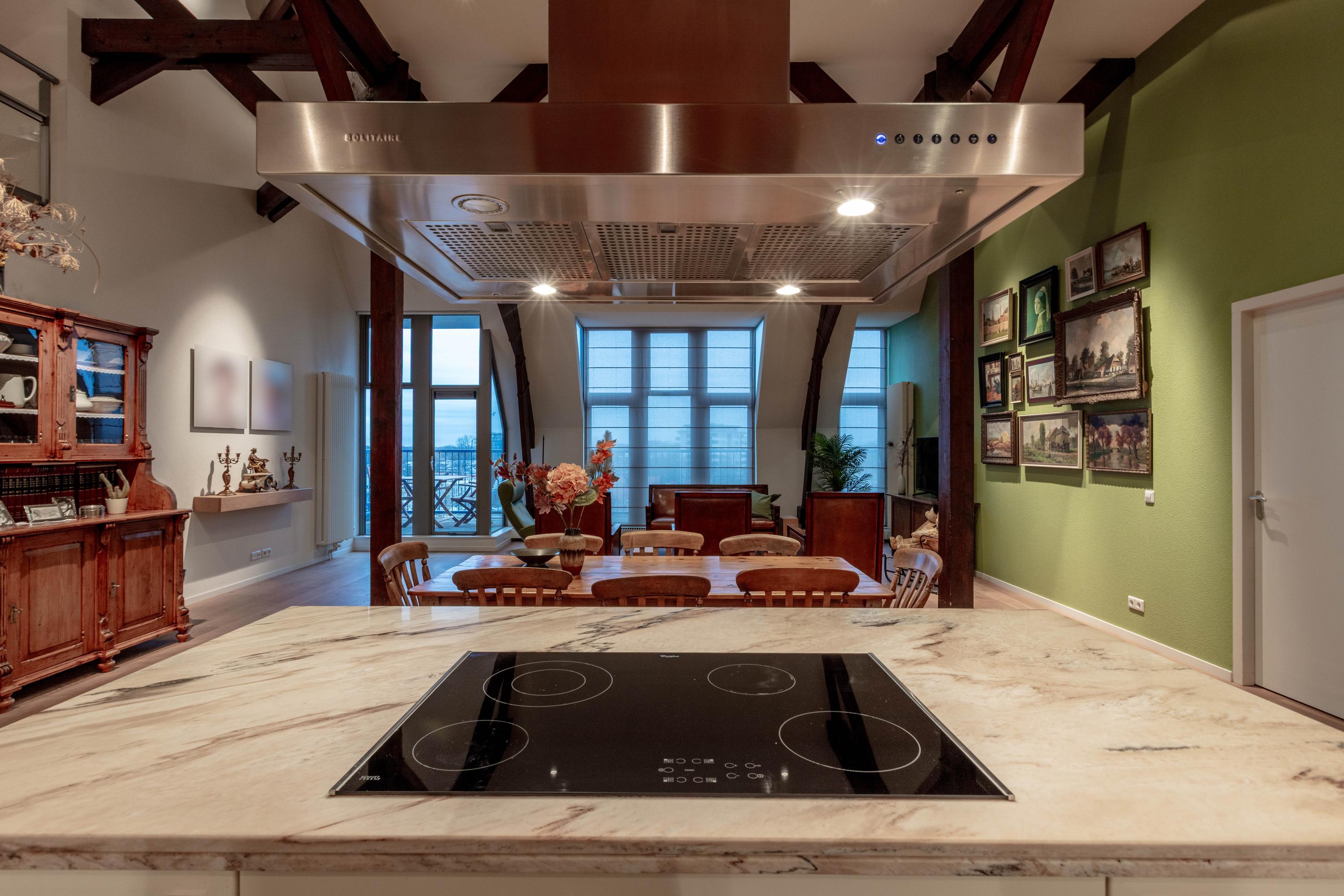De bijzonder sfeervolle woonkamer is indrukwekkend door de unieke hoogte en fraaie zichtbare kapconstructie. De open keuken bevindt zich aan de achterzijde en beschikt over een kookeiland, volop kastruimte en diverse inbouwapparatuur. Vanuit de keuken is er prettig zicht op de woonkamer met een gezellig zitgedeelte en een apart eetgedeelte.