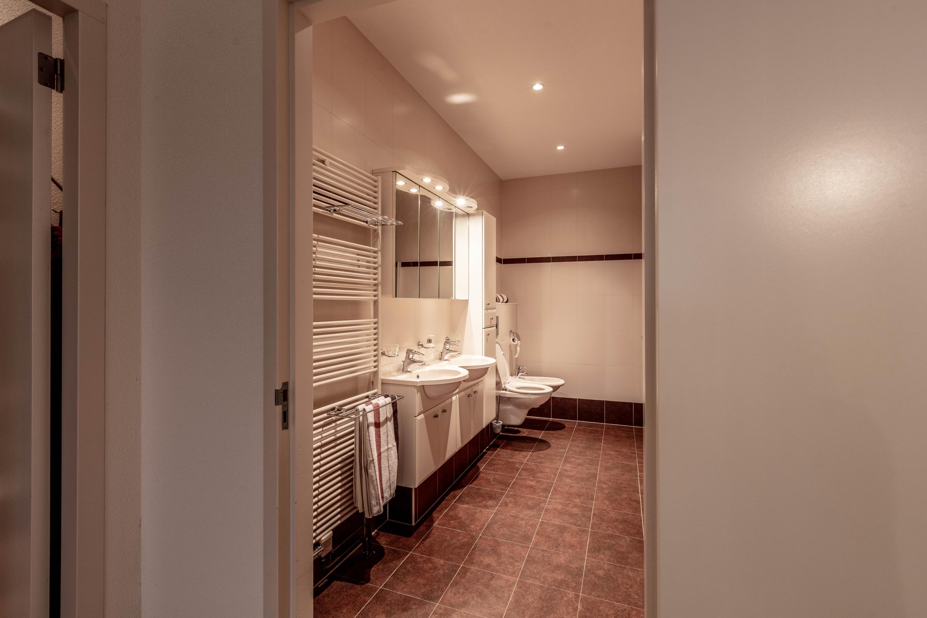 De grootste slaapkamer is in gebruik als masterbedroom en beschikt over een royale inloopkast en een aangrenzende ruime badkamer met inloopdouche, tweede toilet, bidet, ligbad en een badkamermeubel met dubbele wastafel.