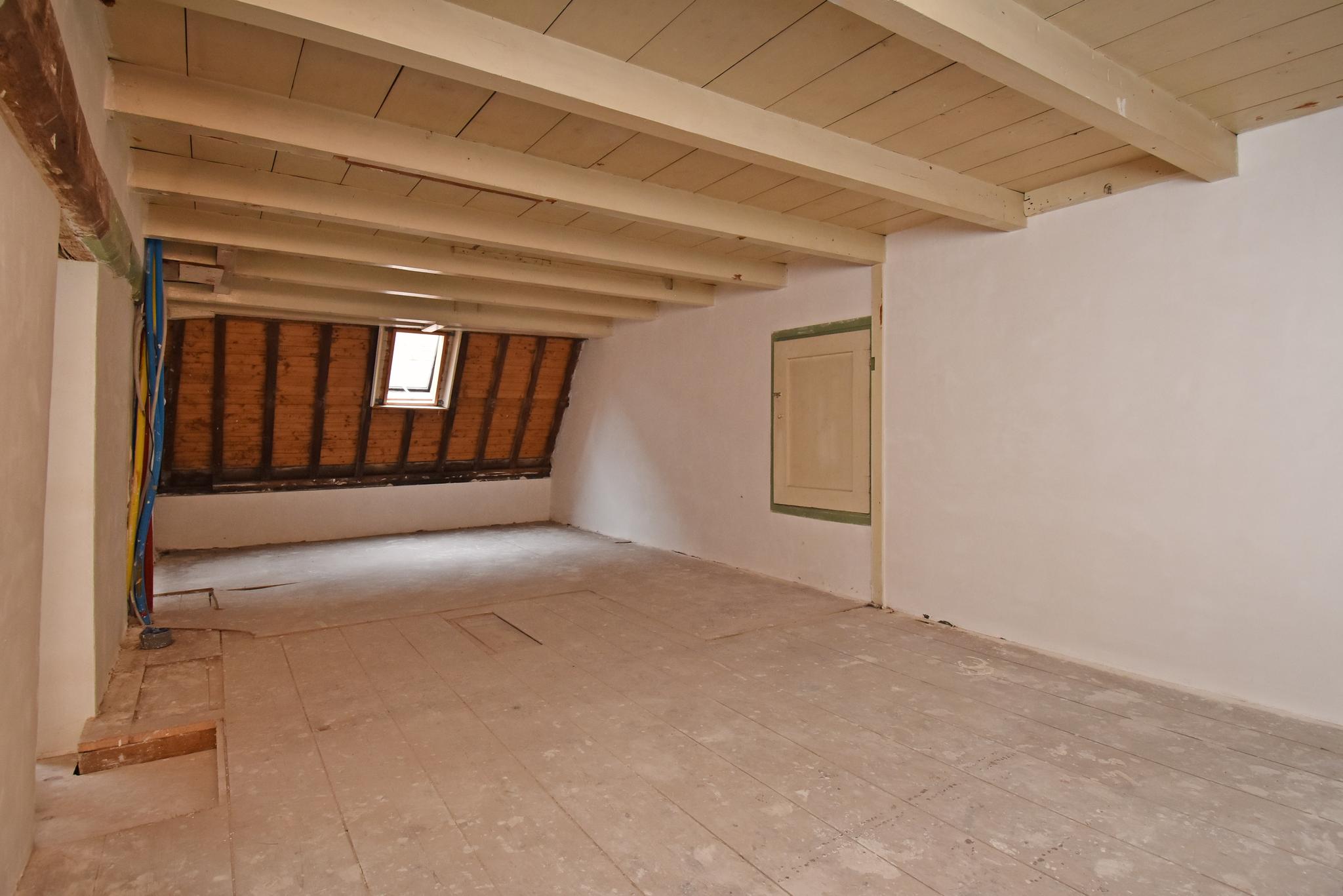 A beautiful floor showcasing the original roof structure. At the front is a bright, multifunctional space. Additionally, there is a large storage room and a toilet. Extra daylight enters through newly installed, high-placed windows above the mezzanine.