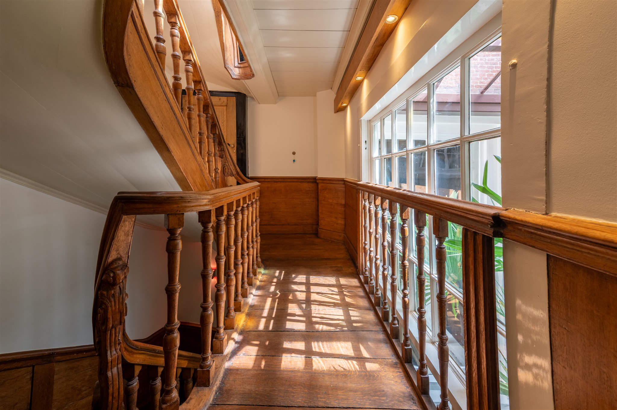 At the front: the grand living room with soaring four-metre ceilings, oak flooring, and a splendid view over the canal and the historic Armamentarium.