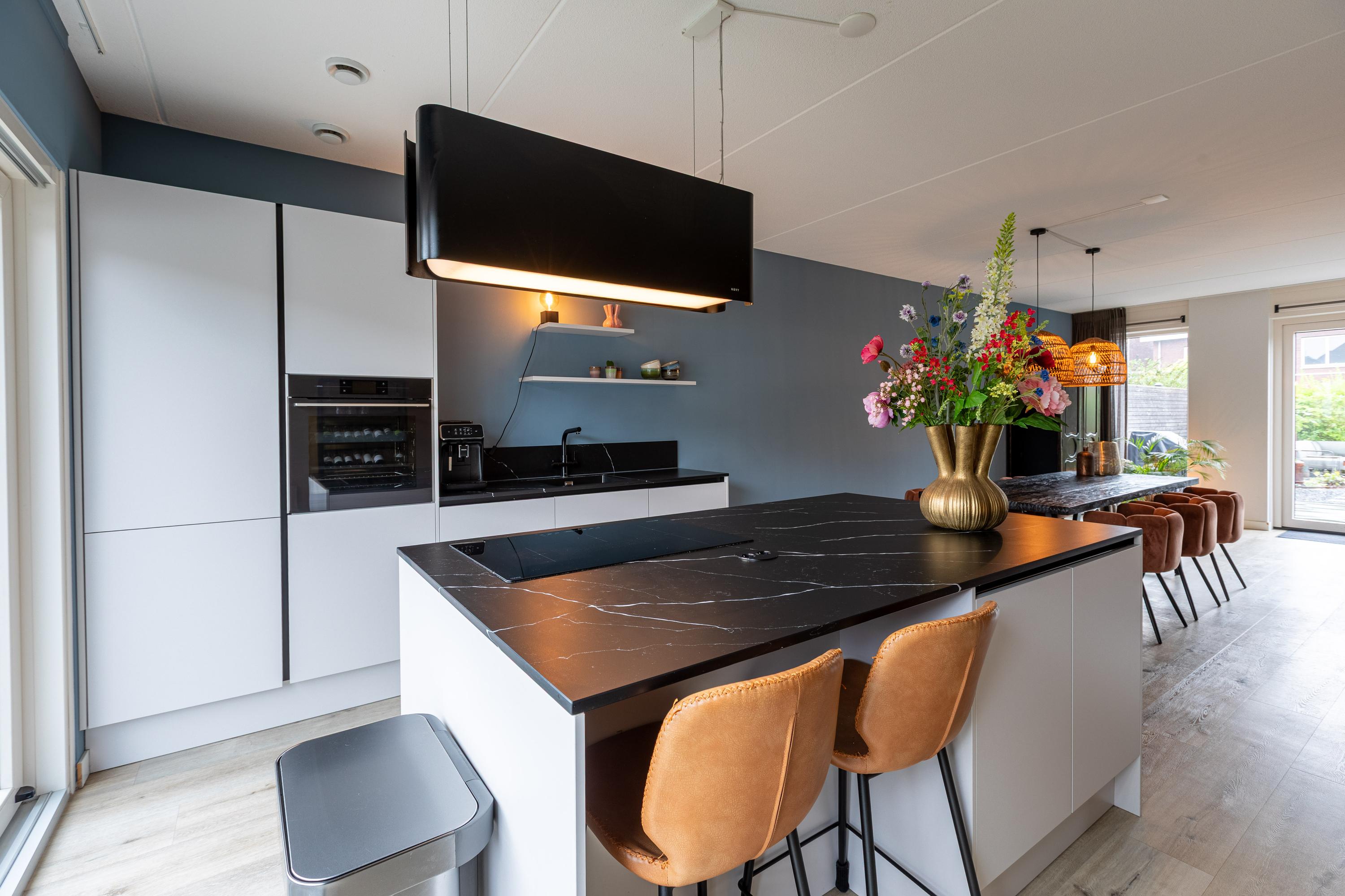 At the rear is the living area with a view of the beautifully landscaped garden. The living room is wide and offers enough space for a spacious sitting area. The sunny south-facing back garden has a large terrace, a greenhouse, a wooden shed and a jetty on the water. In summer, you can step right from your own garden onto your SUP board! The garden is also accessible via a back entrance along the house.